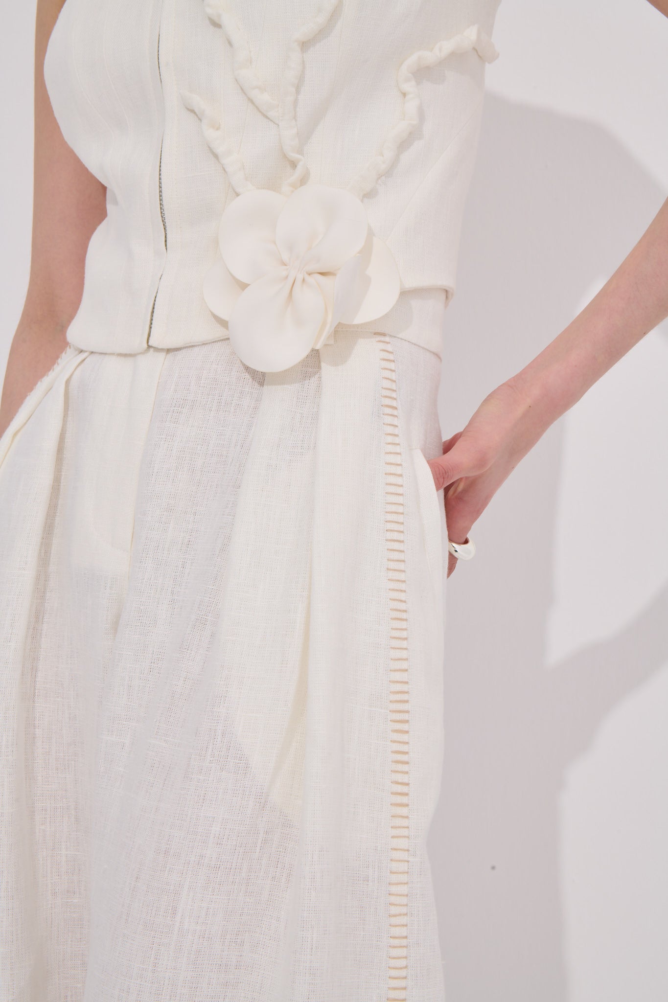 Geniş askıları ve kare yakasıyla dengeli bir siluet sunarken ön yüzeydeki kabartmalı şerit aplikeler ve elde hazırlanmış çiçek detayı zarif bir vurgu oluşturur