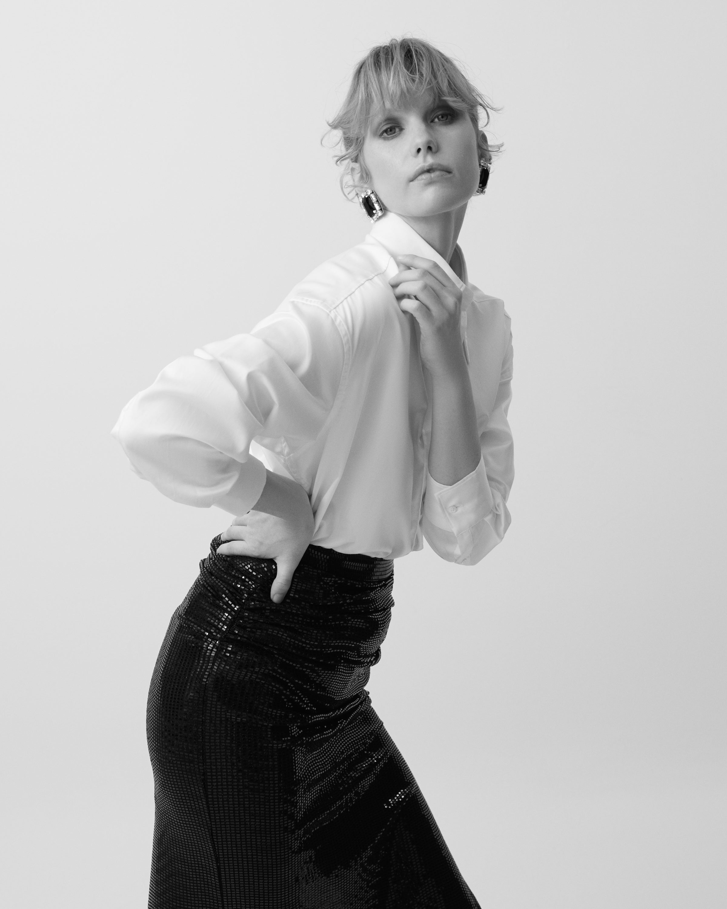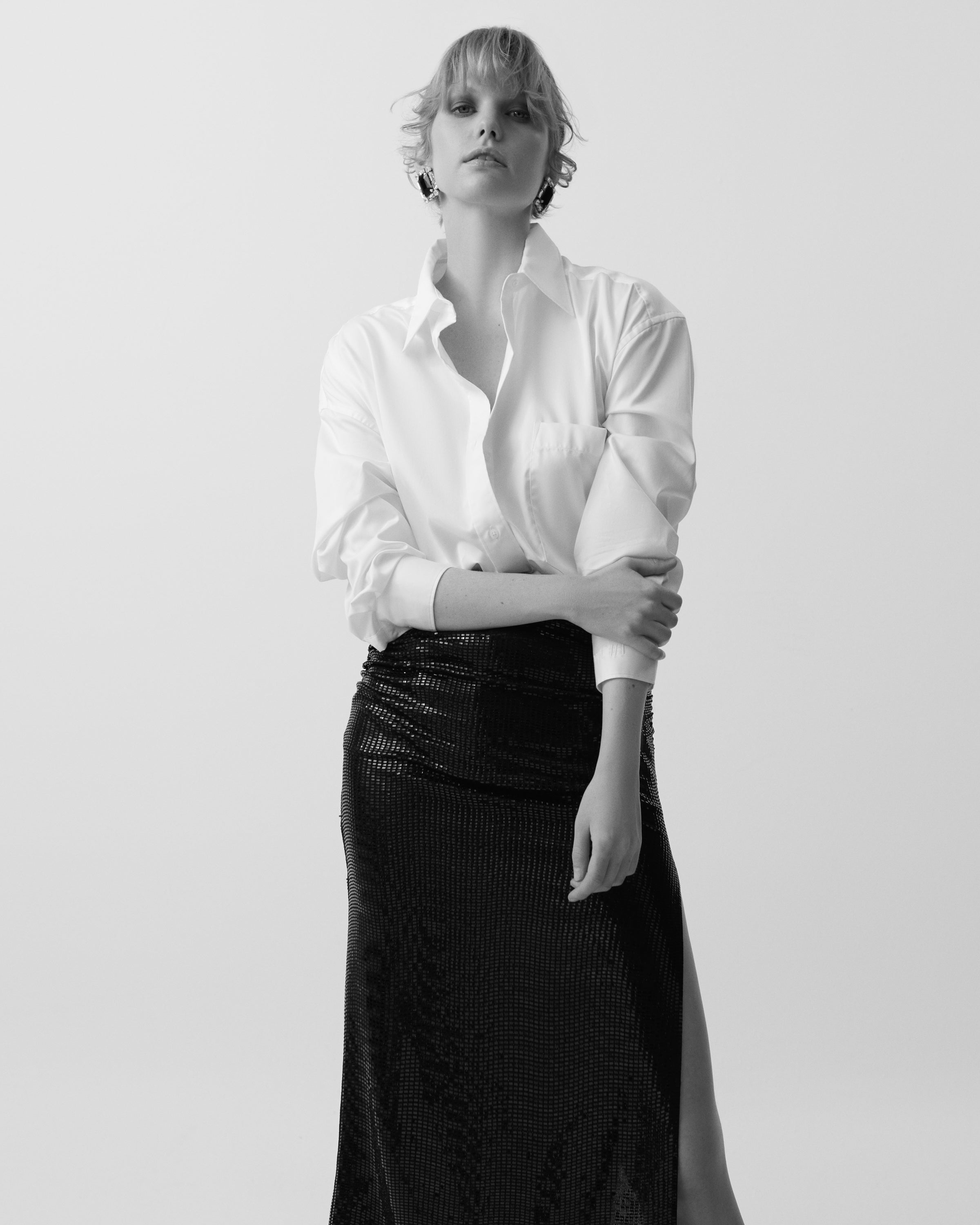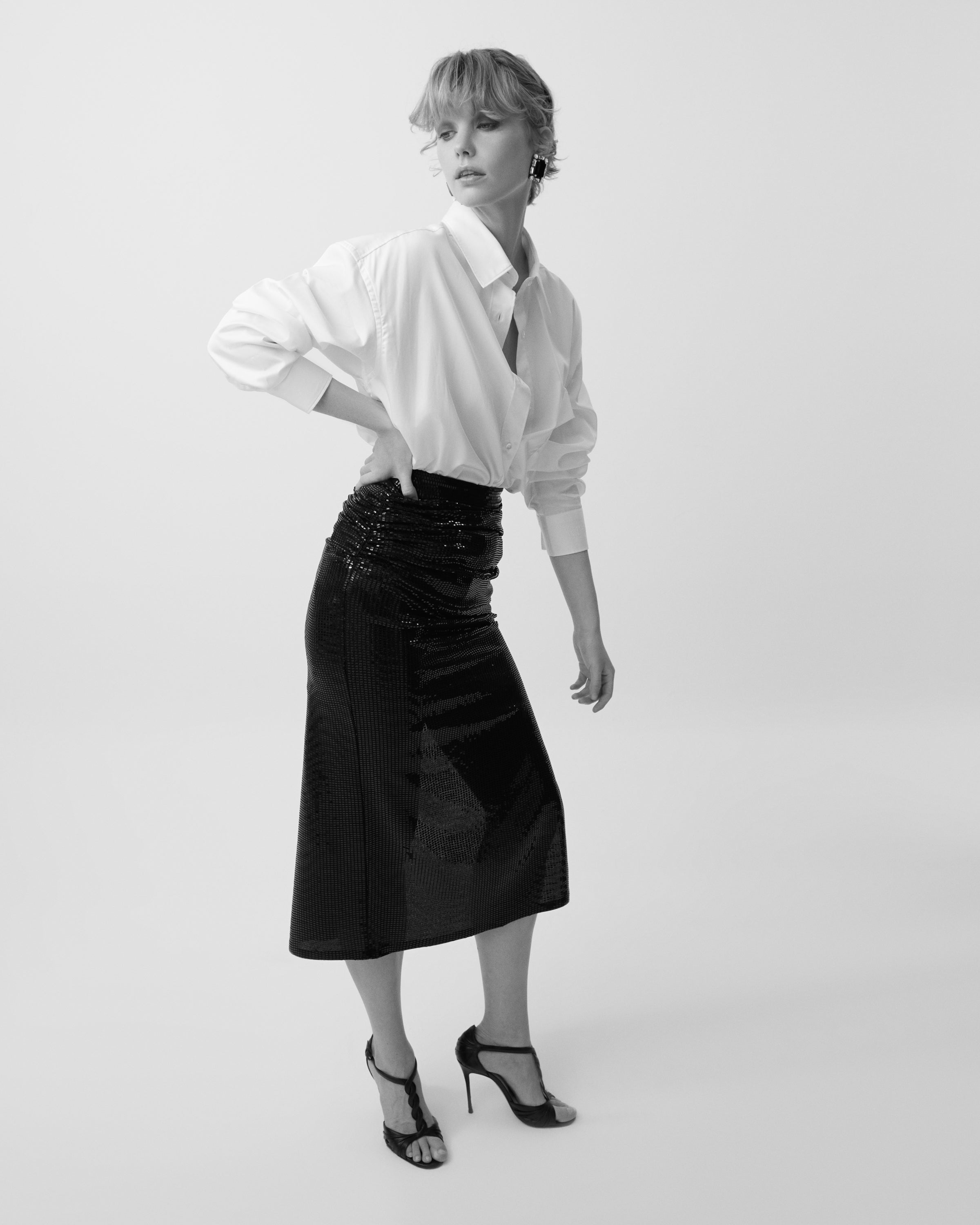 Stardust Paris Etek, sade silueti ve modern detaylarla şıklığı yeniden tanımlanıyor. Diz altı boyu sayesinde hem günlük kombinlerde hem de özel davetlerde şık bir seçenek sunuyor. Ön ve arka kısımdaki buz parçaları eteğe hareket ederken, metalik parçanın parçalı ve dökülen bir görünüm yaratır. Vücuda oturan yapısı ile feminen bir siluet sunan bu parça, gardırobunuzun en özel ve çok yönlü üyelerinden biri olmaya aday.