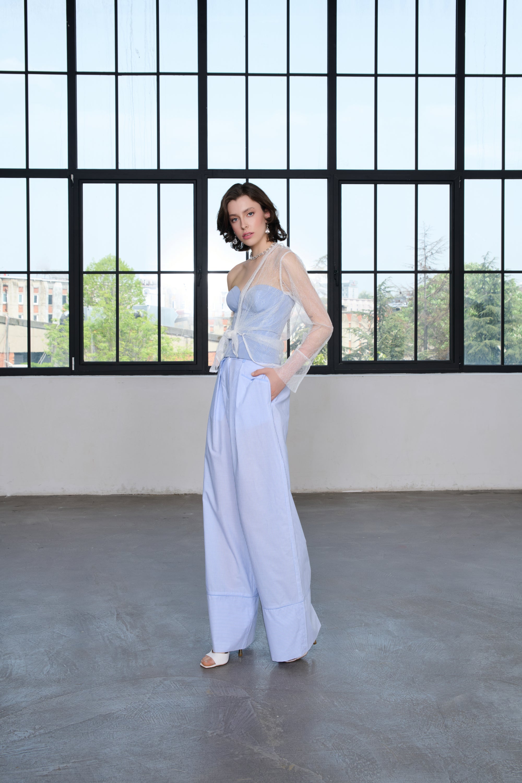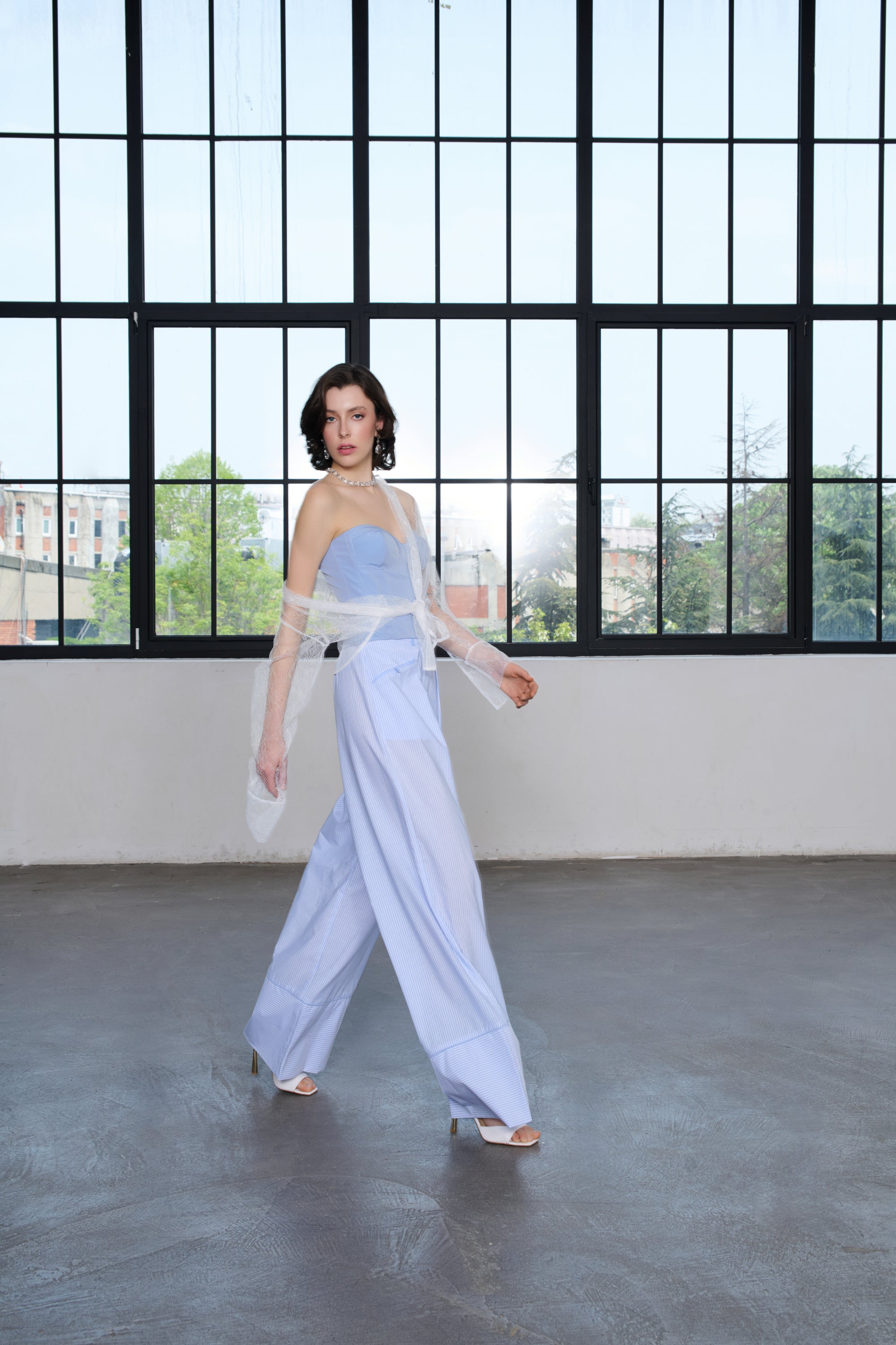 Hafif mavi tonuyla yaz mevsiminin ferahlığını yansıtan bu korse bluz, kısa formu ve modern detaylarıyla zarif ama özgür bir siluet sunar. Arka kısmındaki kuş gözü ve ipli bağlama detayıyla korseden ilham alan bu tasarım, bele oturan yapısıyla vücut hatlarını estetik bir şekilde vurgular. Parlak tafta kumaşın doğal dokusu, sade ama çarpıcı bir görünüm kazandırır. Günlük kombinlerden özel davetlere kadar farklı ortamlara kolayca uyum sağlar.