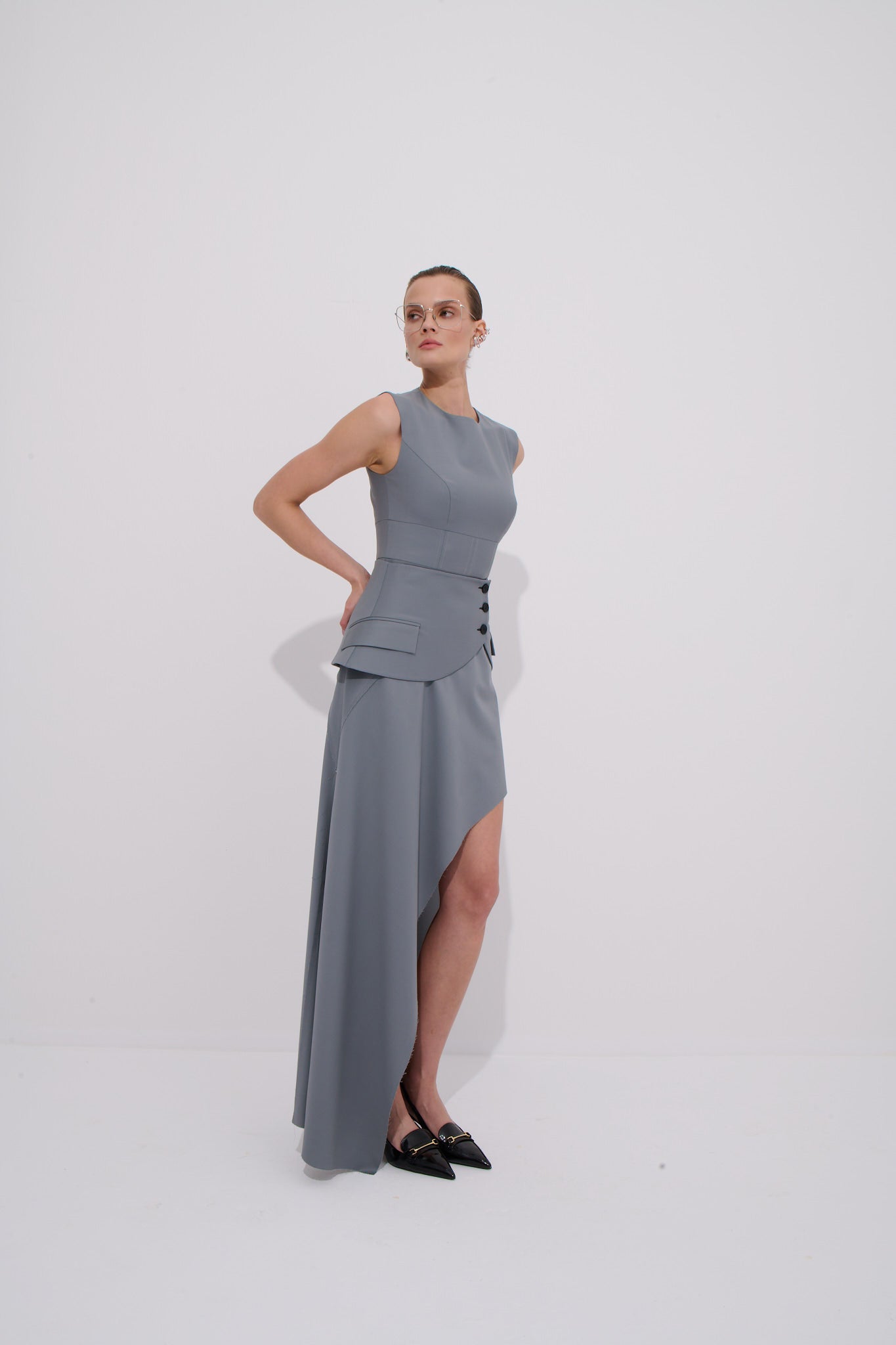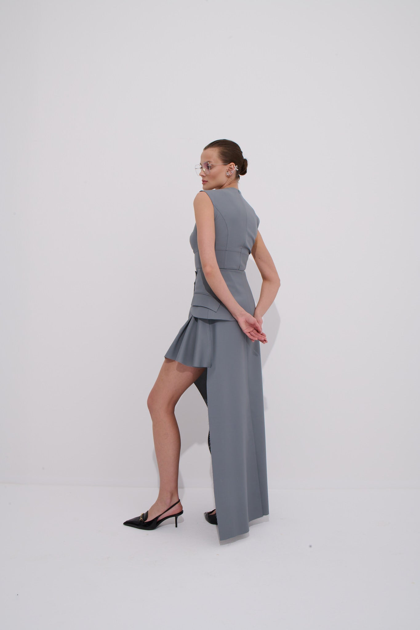 Minimalist zarafeti güçlü bir duruşla buluşturan bu elbise asimetrik etek formuyla modern bir siluet sunar. Bel hattındaki dikişler vücudu zarifçe sararken dökümlü etek yapısı elbiseye akıcı bir hareket kazandırır.Kolsuz tasarımı ve net çizgileriyle sade ama etkileyici bir görünüm sunar. Asil gri tonu sayesinde hem gündüz hem gece davetlerinde şıklığınızı tamamlar