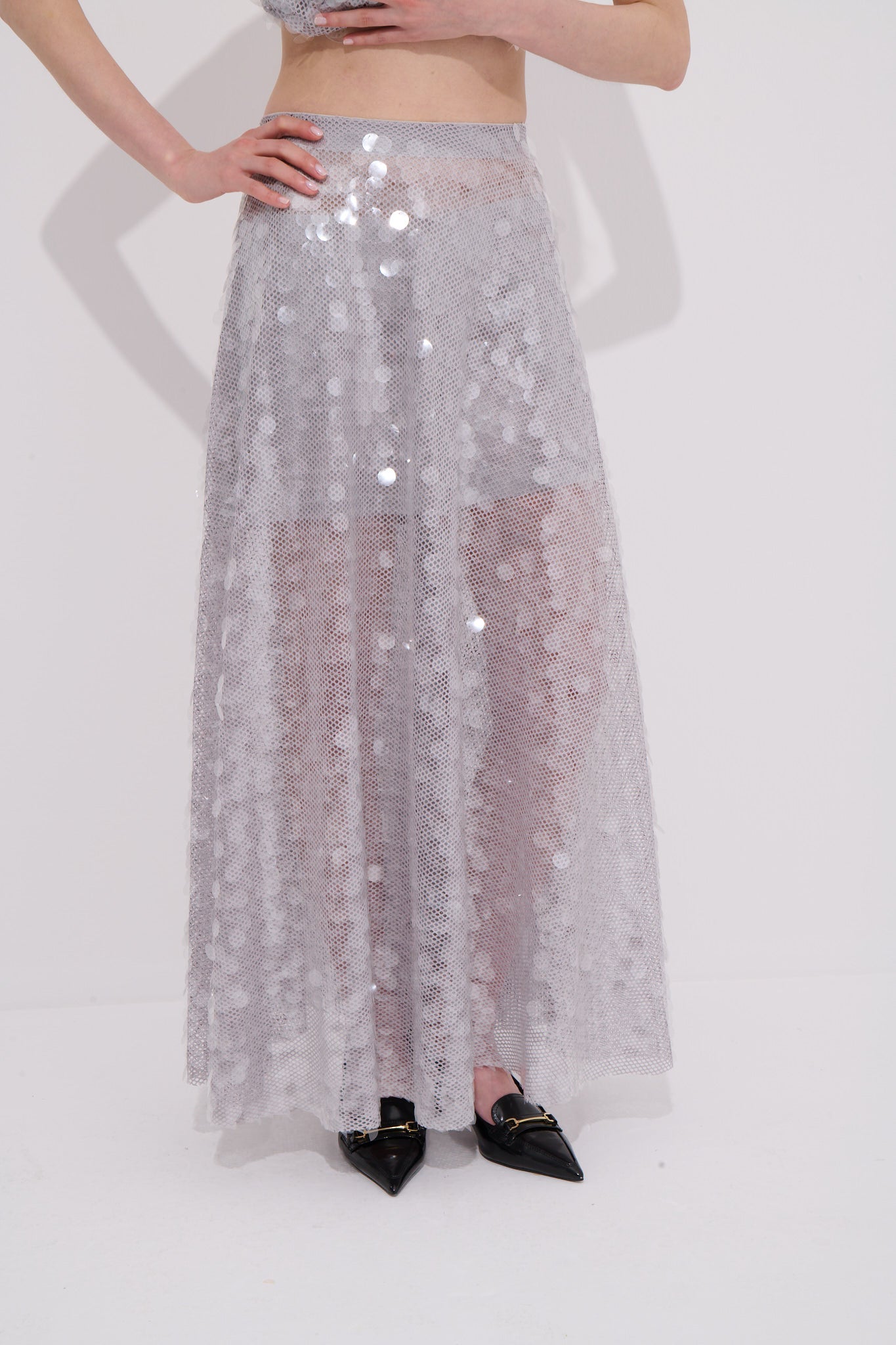 Tamamı payetlerle kaplı bu midi etek ışığı her hareketinizde yansıtarak göz alıcı bir duruş sergiler. Transparan tül üzerine işlenen büyük boy payetler eteğe hacim ve canlılık kazandırırken iç kısmındaki kısa şort astar konforlu ve güvenli bir kullanım sunar