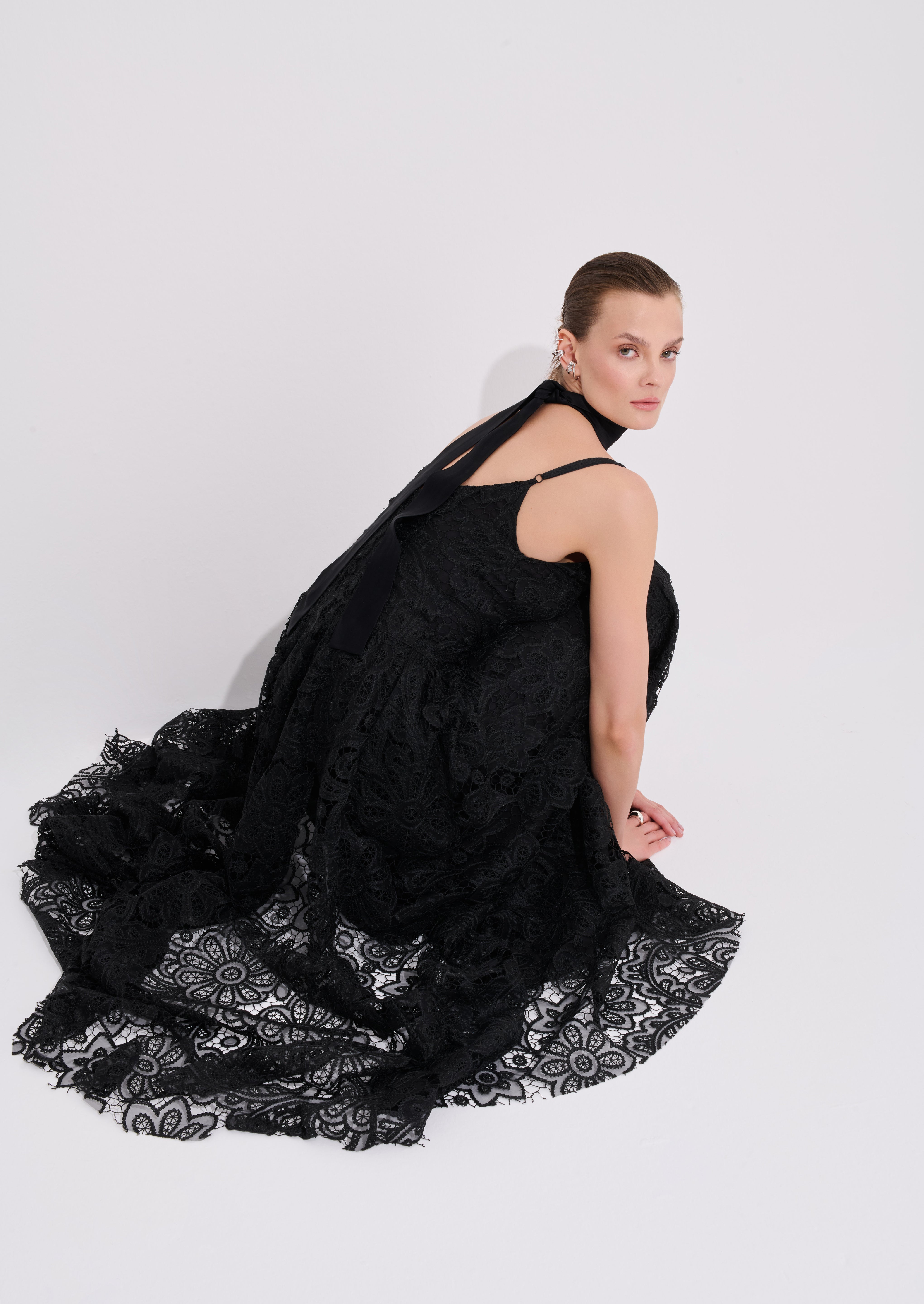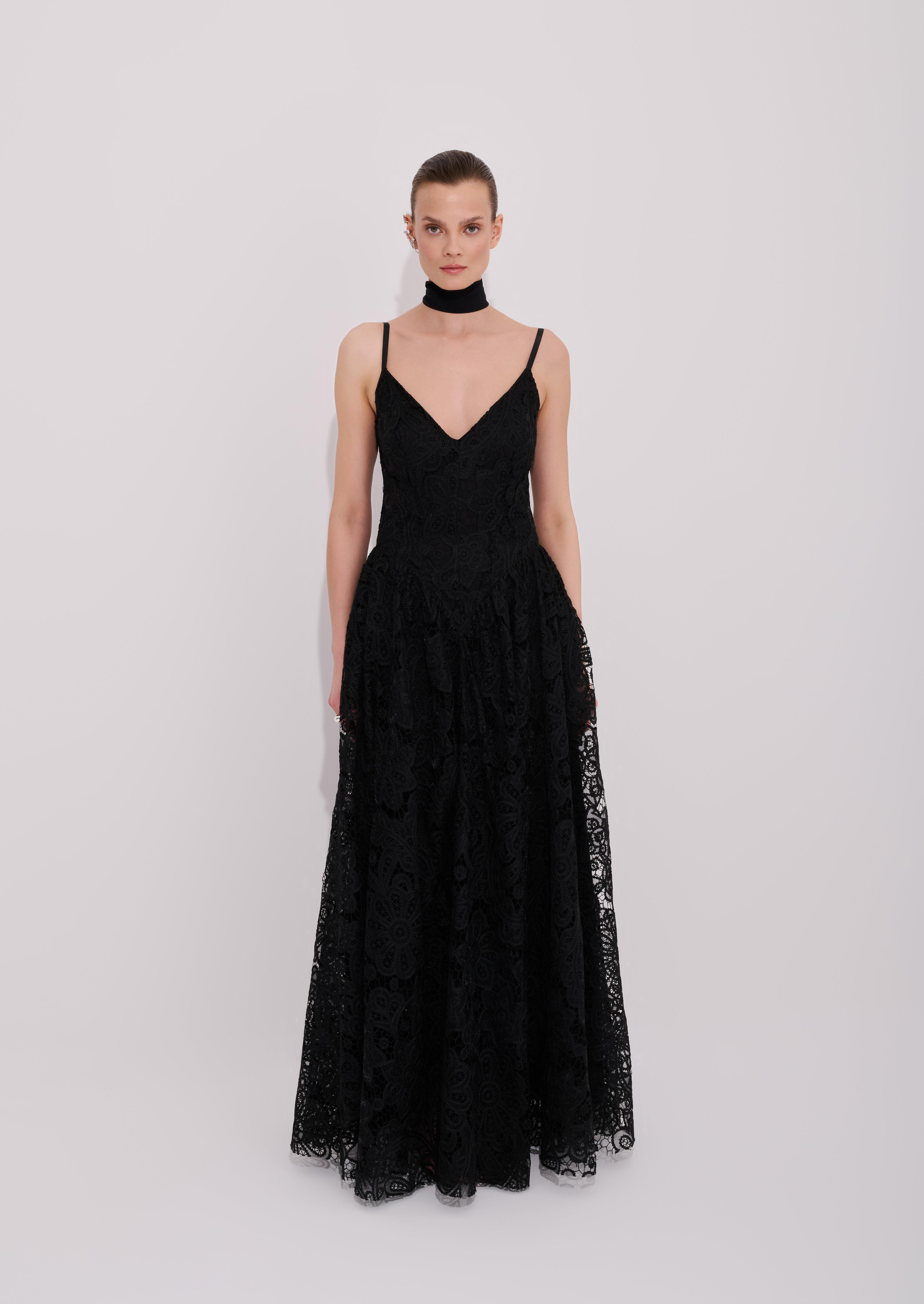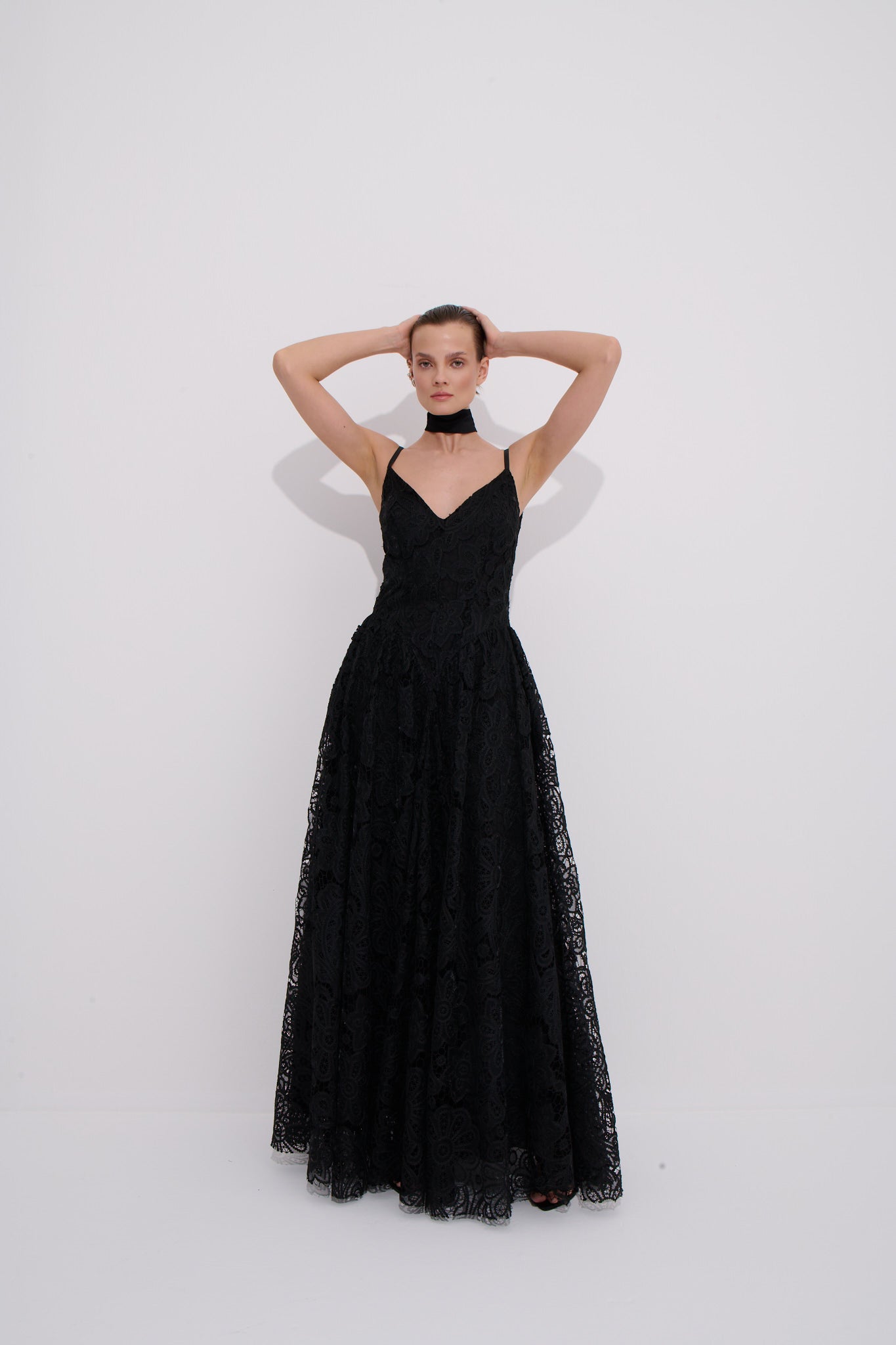Zarafetiyle dikkat çeken bu siyah uzun dantel elbise belde oturan formu ve dökümlü etek yapısıyla feminen bir siluet sunar. İnce ve ayarlanabilir askılar V yaka ile birlikte üst bedeni zarifçe vurgular. Dantel kumaşı modern ve etkileyici bir görünüm sağlarken içteki hafif vual astar hem konfor hem de şıklık sunar. Yandan fermuar detayı sayesinde kolayca giyilebilir