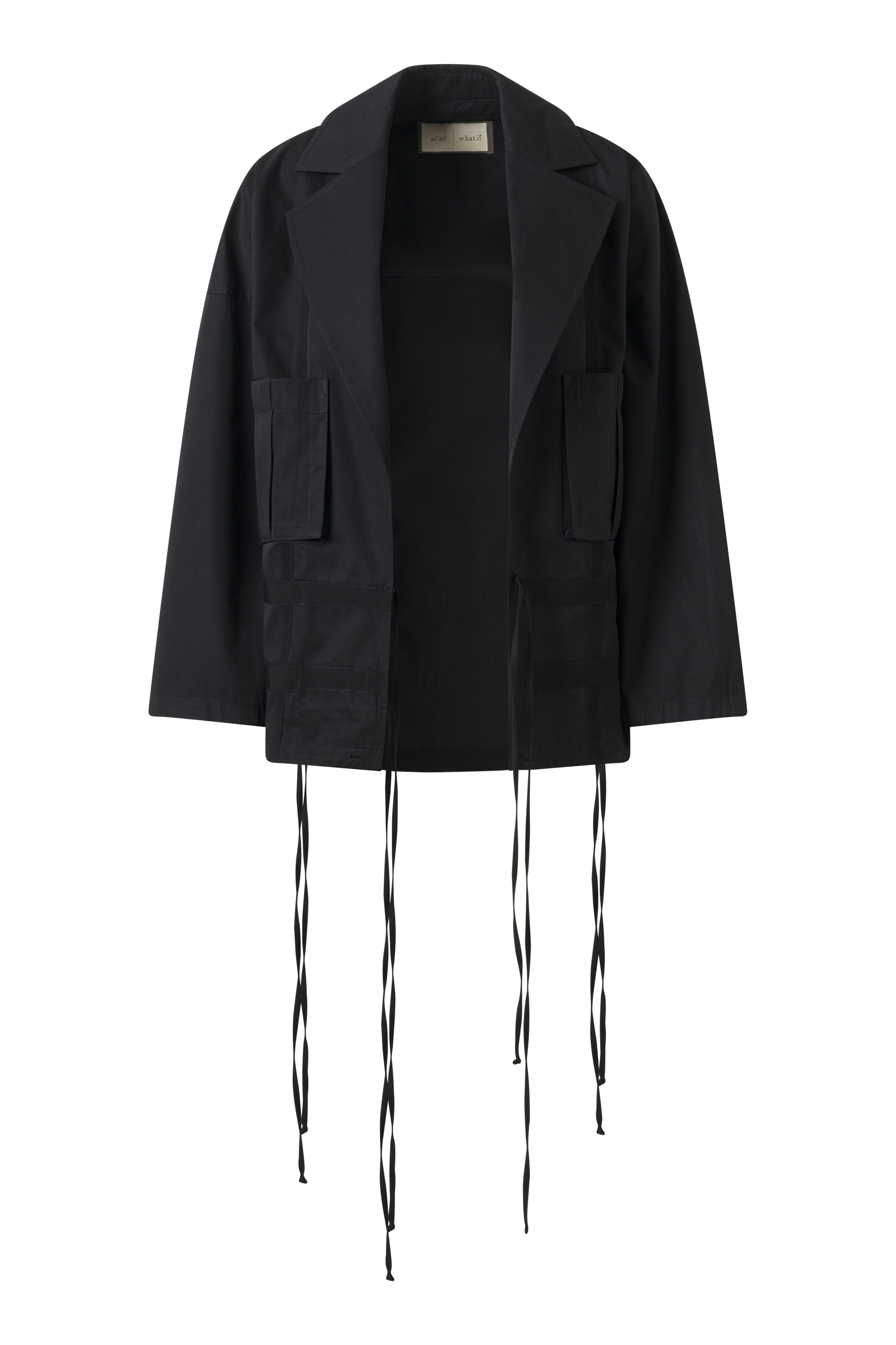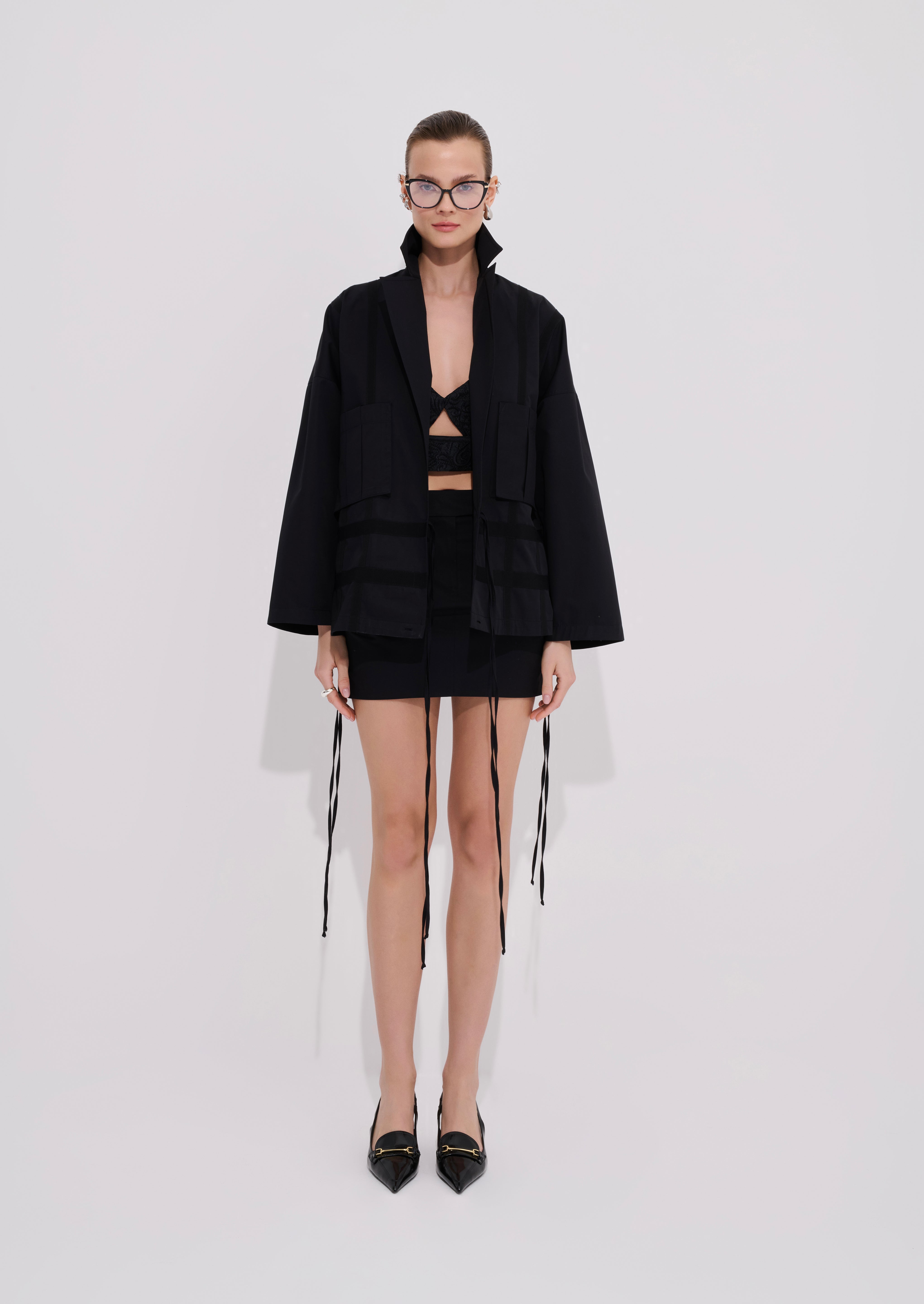 • Ön cep ve etek hizasında uzun bağcık detayları