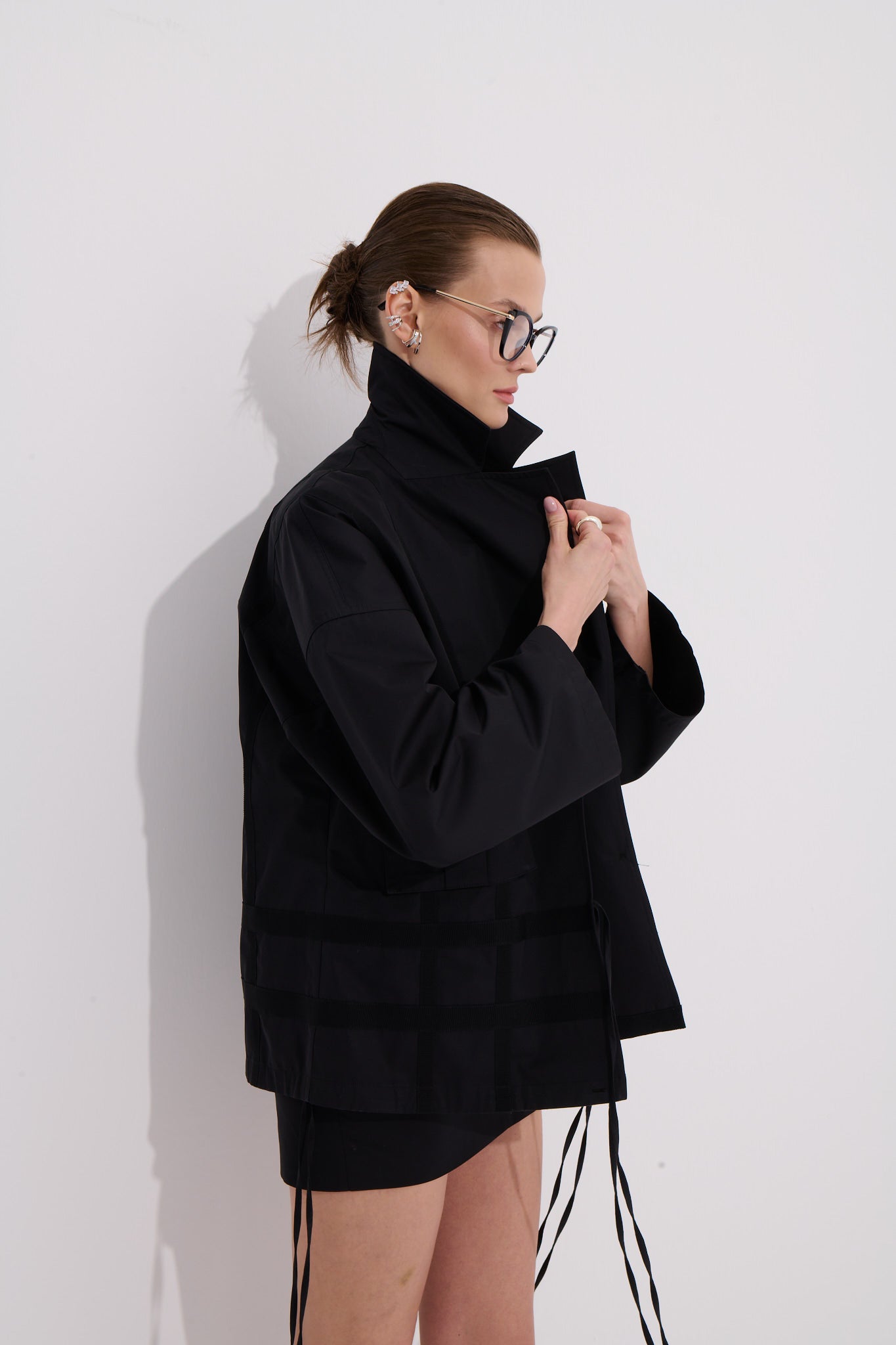 Fonksiyonel bölümüyle modern şehir şıklığını yansıtan bu büyük beden ceket, dikkat çekici ayrıntılarla öne çıkıyor. Ön bölümde alan Fransız şerit yapılmışlarla dekoratif işlemeler birbirinden zarif bir derinlik kazanırken, güçlü bir siluet oluşuyor. Geniş genişlik ve yüksek yaka yapısıyla hem rahat hem de iddialı bir duruş sunar. %100 organik pamuklu kumaşı sayesinde nefes alabilen, doğal bir yapıdadır.