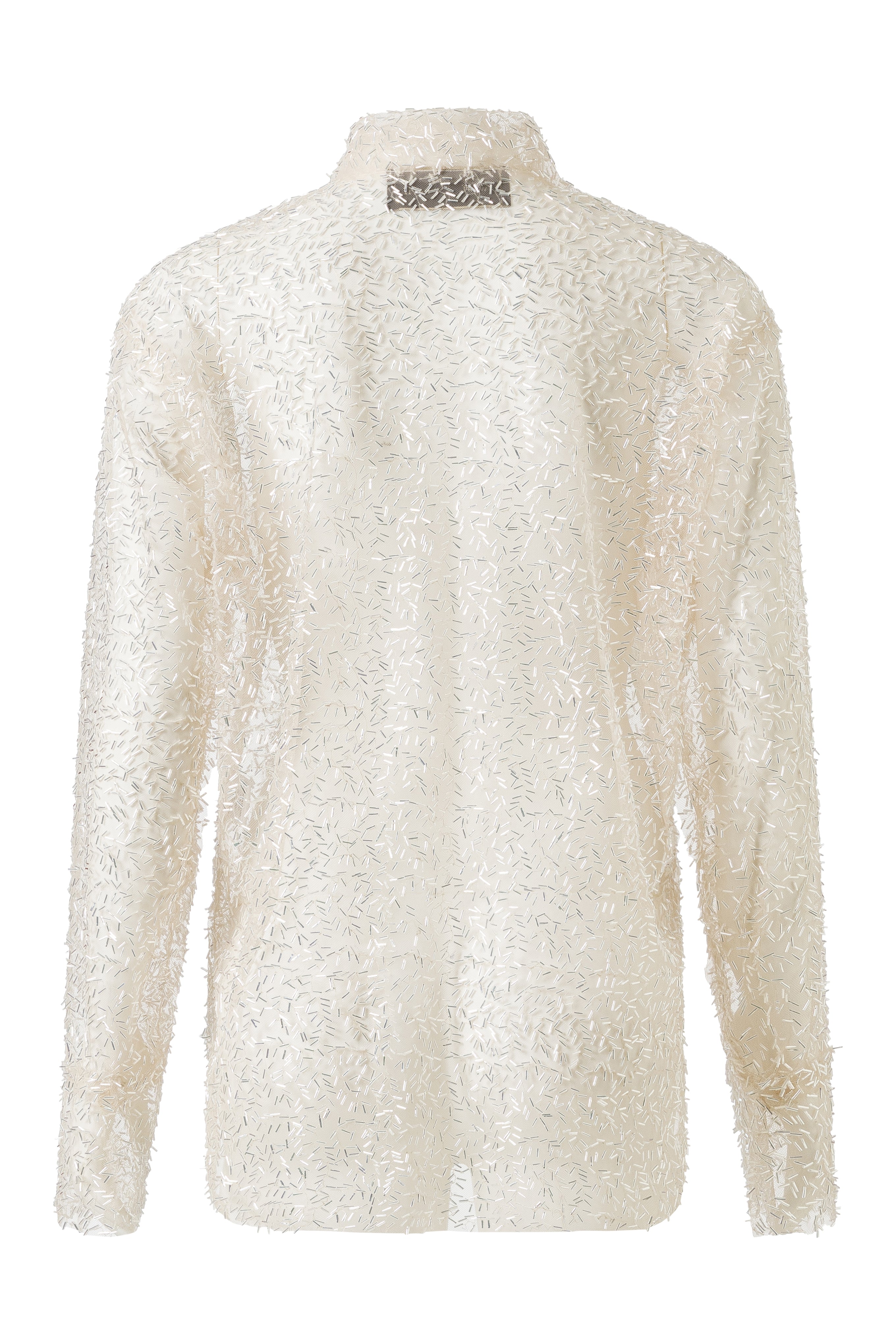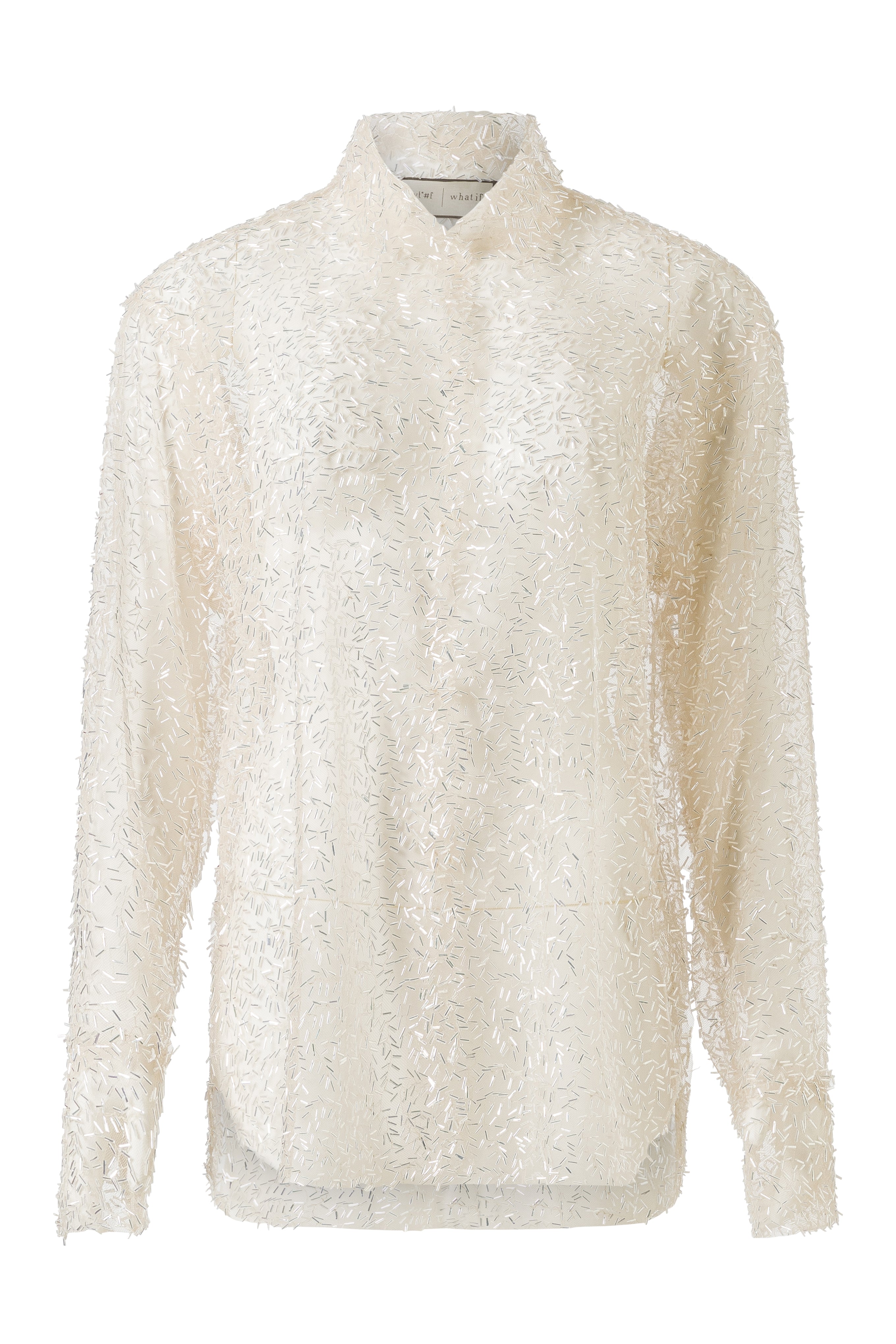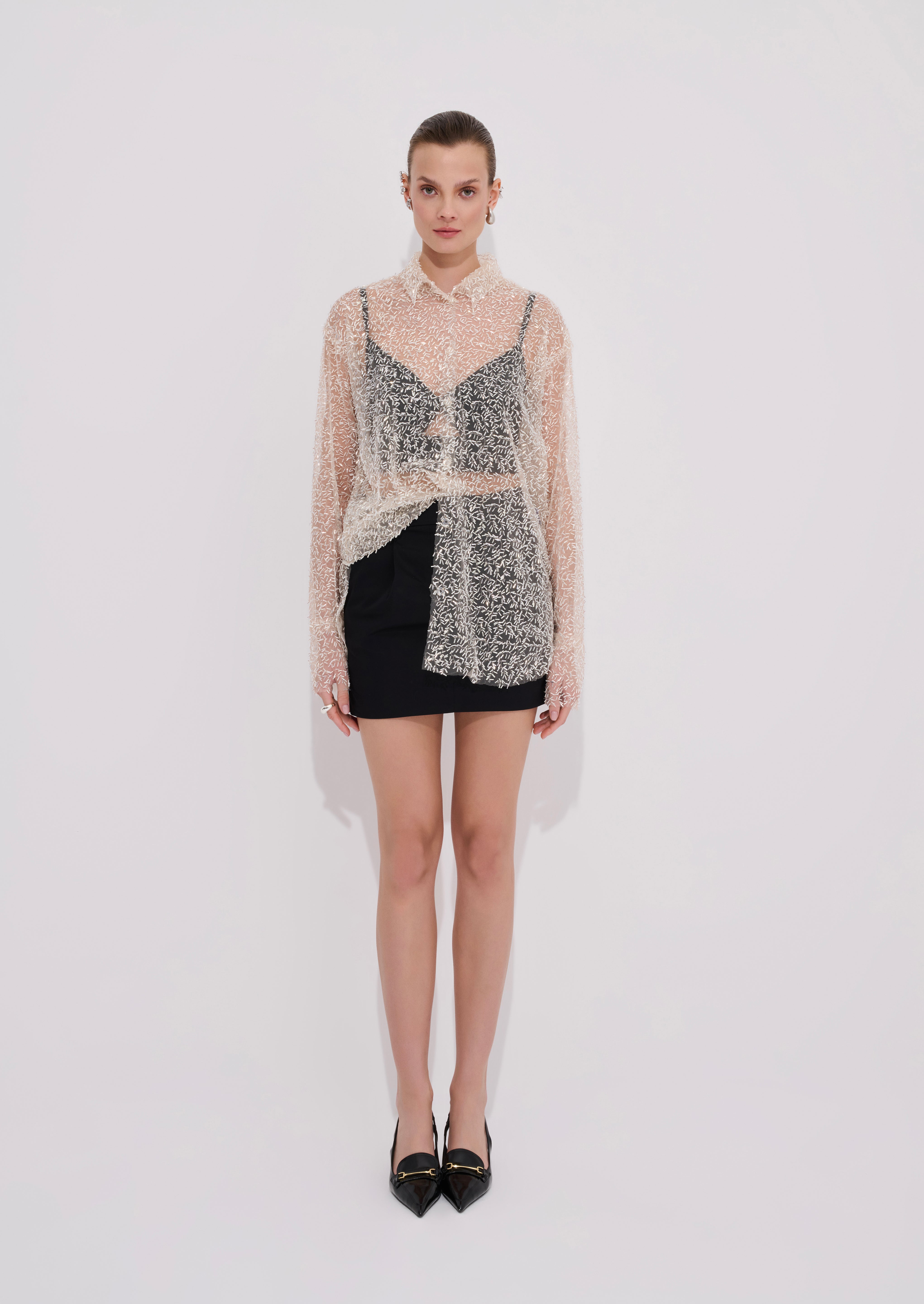 Modern zarafet ile el işçiliğini buluşturan bu transparan gömlek, cam boncuk işlemeleriyle dikkat çeker. Hafif yapısı sayesinde dökümlü bir siluet sunarken, klasik gömlek formuyla dengeli bir kontrast yaratır. Işıkla buluştuğunda yumuşak bir parıltı kazanan bu özel tasarım, gece şıklığına sanatsal bir dokunuş katmak isteyenler için ideal.