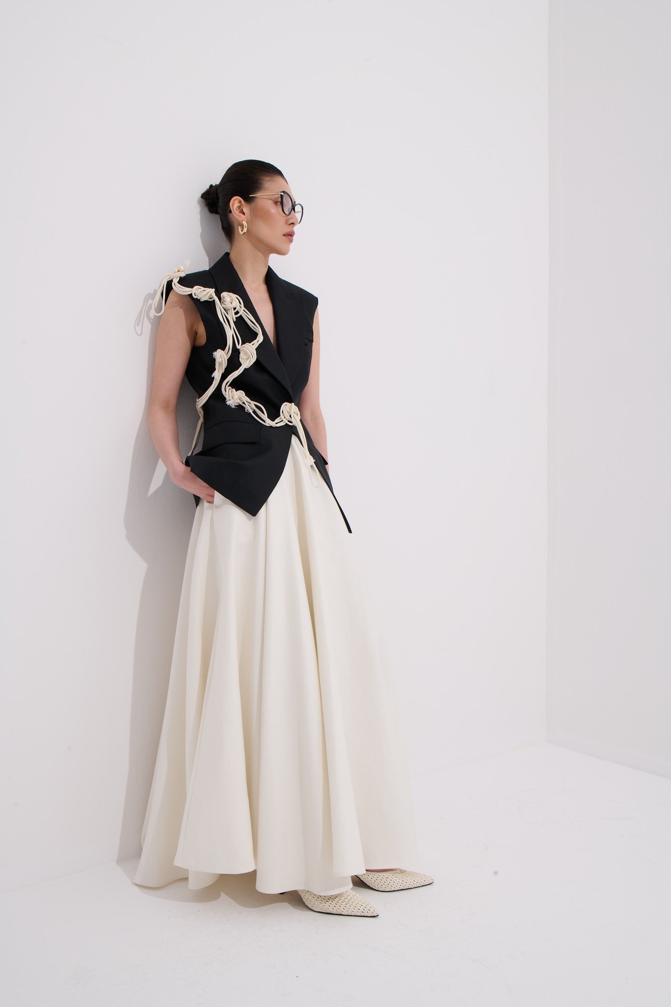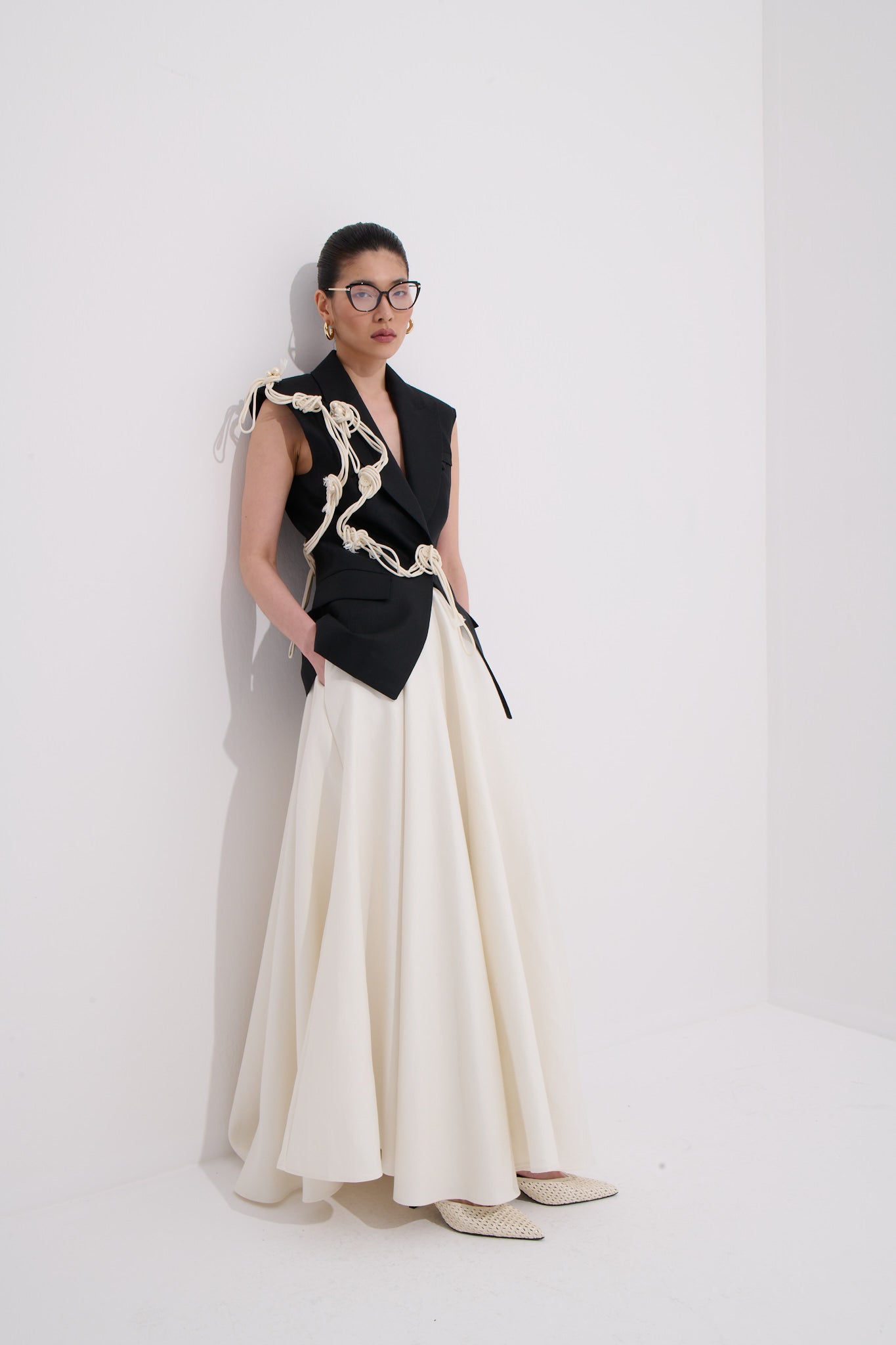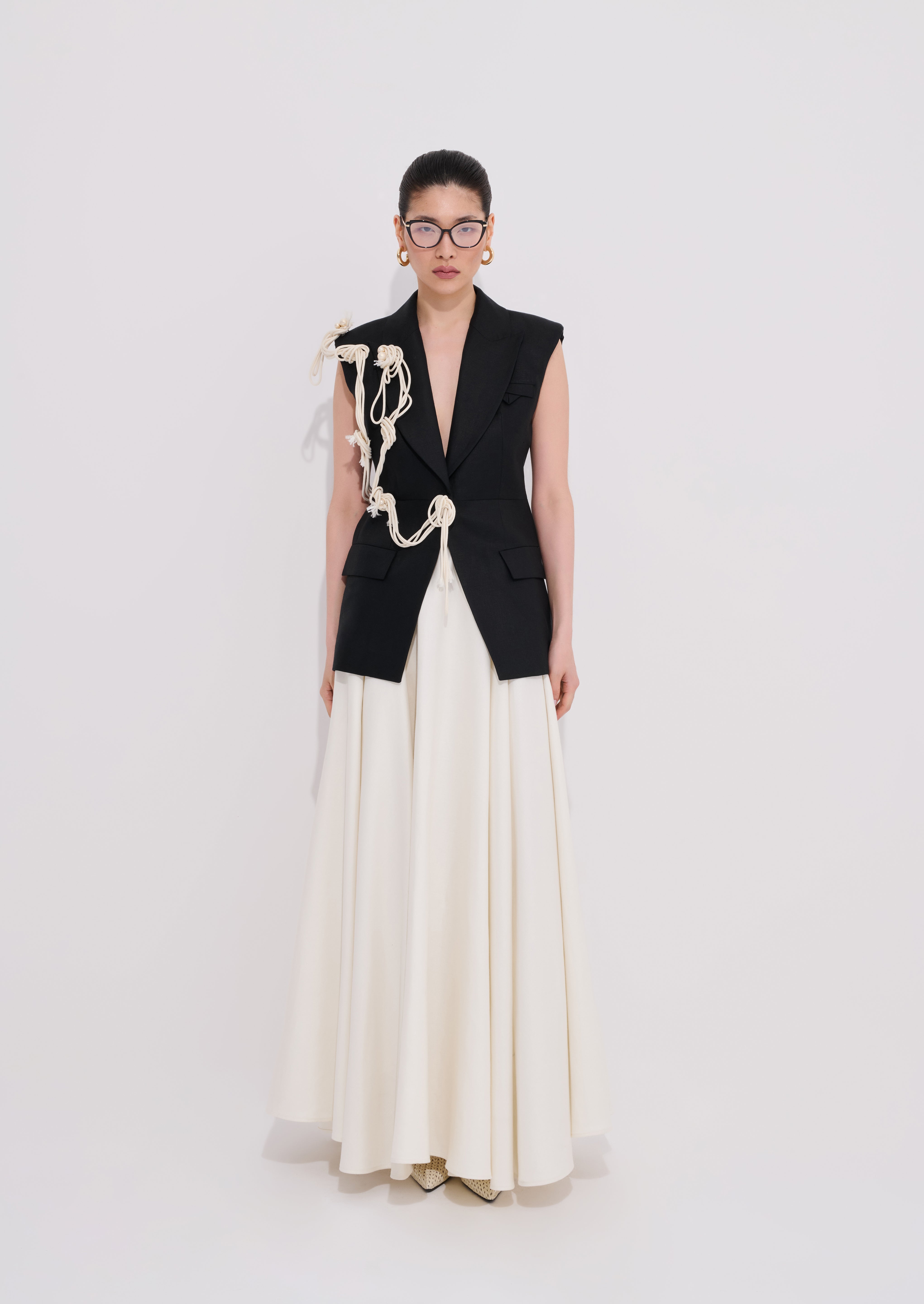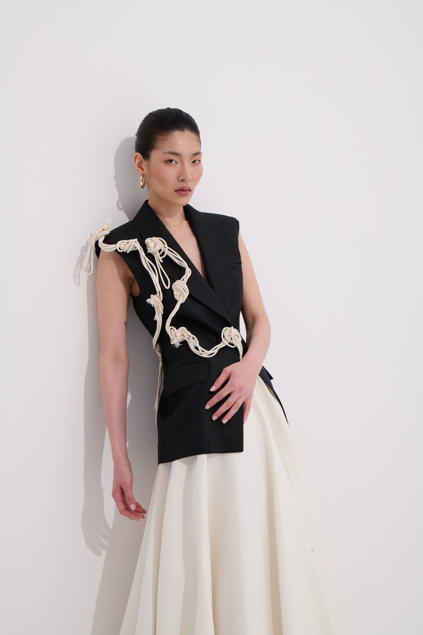 Modern tasarım çizgilerini avangart detaylarla buluşturan bu siyah yelek tek omuzdan sarkan çıkarılabilir beyaz ip detayıyla özgün bir siluet sunar. Vücuda oturan kesimi maskülen bir duruş sergilerken aksesuar detayının çıkarılabilir olması sayesinde iki farklı stil yaratma imkânı sunar. Hem sade hem de iddialı kombinler için güçlü bir tamamlayıcıdır