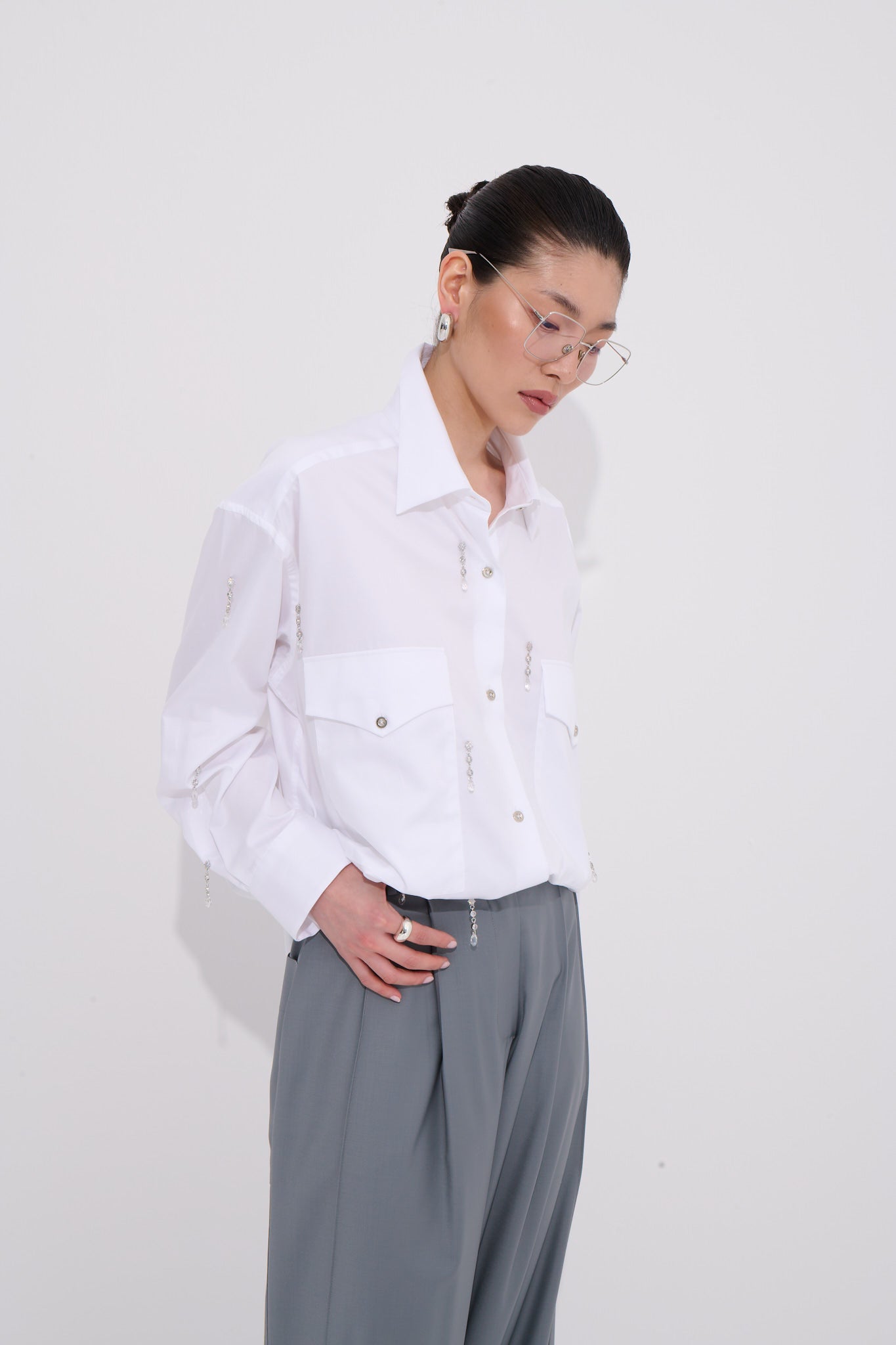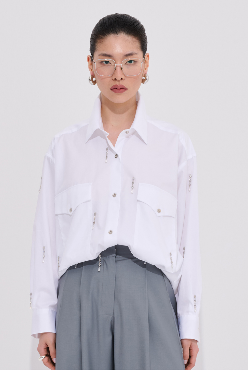 WhatIfBrand için özel olarak tasarlanan bu beyaz gömlek sade şıklığı modern detaylarla yeniden yorumlar.Swarovski taşlı kare düğmeler klasik gömlek formuna zarif ve parlak bir dokunuş katar.Net kesimi geniş cepleri ve feminen çizgileriyle iş hayatından davet stiline kadar çok yönlü bir şıklık sunar. %100 pamuktan üretilen yumuşak dokusu sayesinde gün boyu nefes alabilirlik ve konfor sağlar. Pantolonlarla zamansız eteklerle romantik bir görünüm elde etmek mümkündür