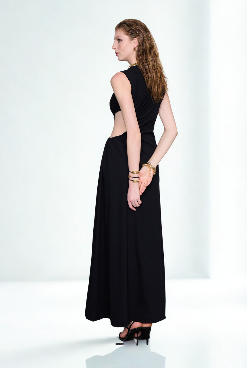 WhatIfBrand'ın siyah elbisesi, klasik silueti cesur detaylarıyla buluşuyor. Yan kısımdaki buzgü detayı ve asimetrik kesim, yüksek yırtıkla birleşerek zarif ama iddialı bir görünüm yaratır. Akıcı yapısıyla vücut şapkalarını takip eden kumaş, konforlu bir kullanım sunarken, etkileyici bir durma sergiler. Gece davetlerinden özel organizasyonlara kadar geniş bir kullanım alanına sahip bu elbise, güçlü stilinize farklı bir dokunuş katar.