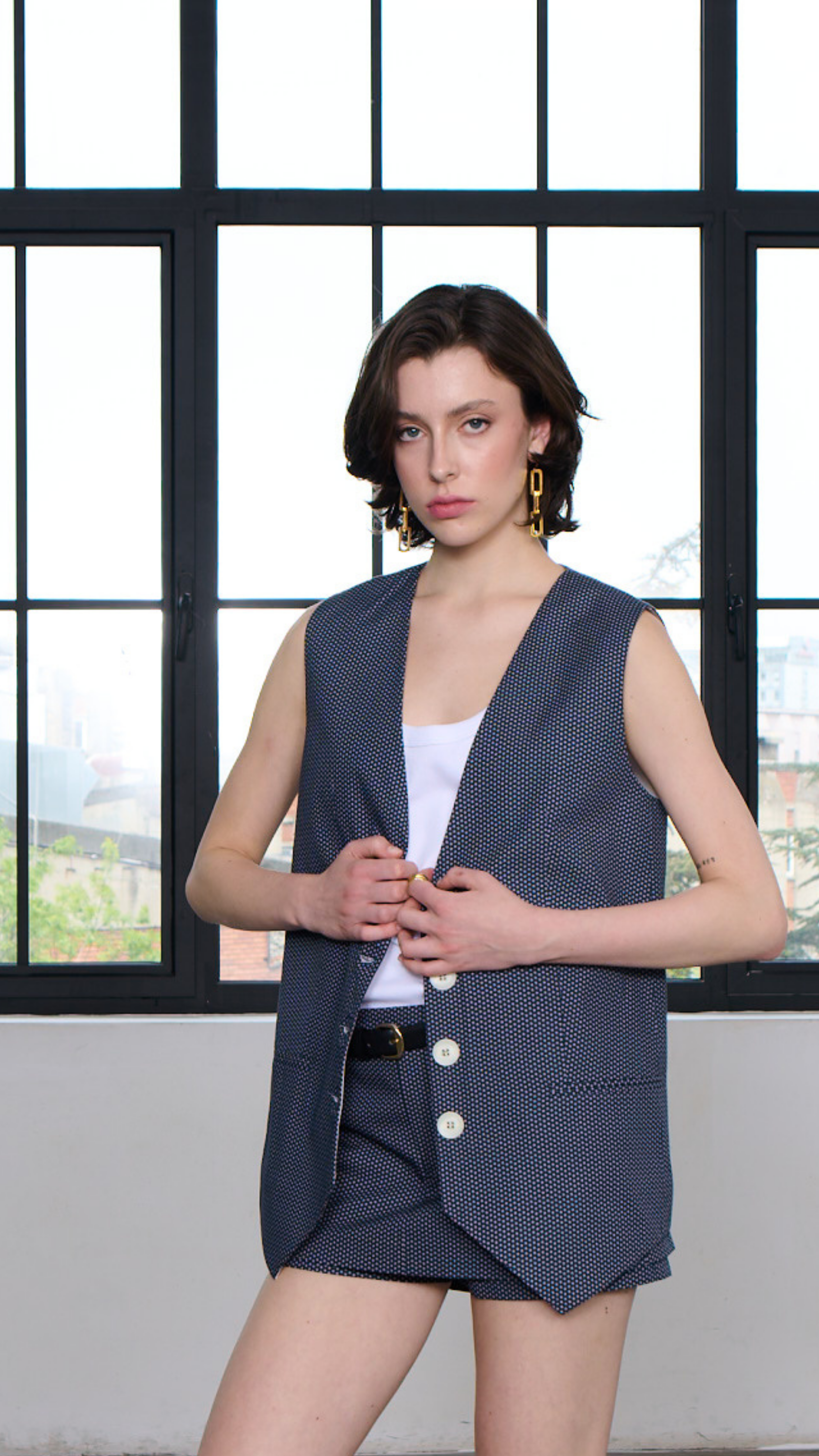 Modern ve minimalist bir stile sahip şık elbise, klasik ayrıntılara çağdaş bir yorum katıyor. Koyu mavi zemin üzerindeki mikro beyaz çiçek desenleri zarif bir doku yaratırken, önde yer alan büyük beyaz düğmeler güçlü bir kontrastla şıklığı vurguluyor. Asimetrik ve sivri kesimli yapısıyla klasik elbise formlarından ayrışan bu tasarım, karakterli ve güçlü bir siluet sunuyor.