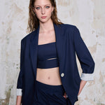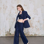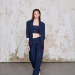 Modern çizgilerin güçlü bir yorumu: WhatIfBrand’ın lacivert çizgili büstiyeri, minimalist tasarımı ve keskin hatlarıyla stilinize cesur bir dokunuş katıyor. İnce beyaz çizgili kumaşıyla klasik maskülen dokuyu yeniden tanımlayan bu parça, bel altındaki kesik detayıyla dikkat çeken modern bir siluet sunar. Tek başına ya da takım olarak kullanıldığında etkileyici ve dengeli bir görünüm sağlar.