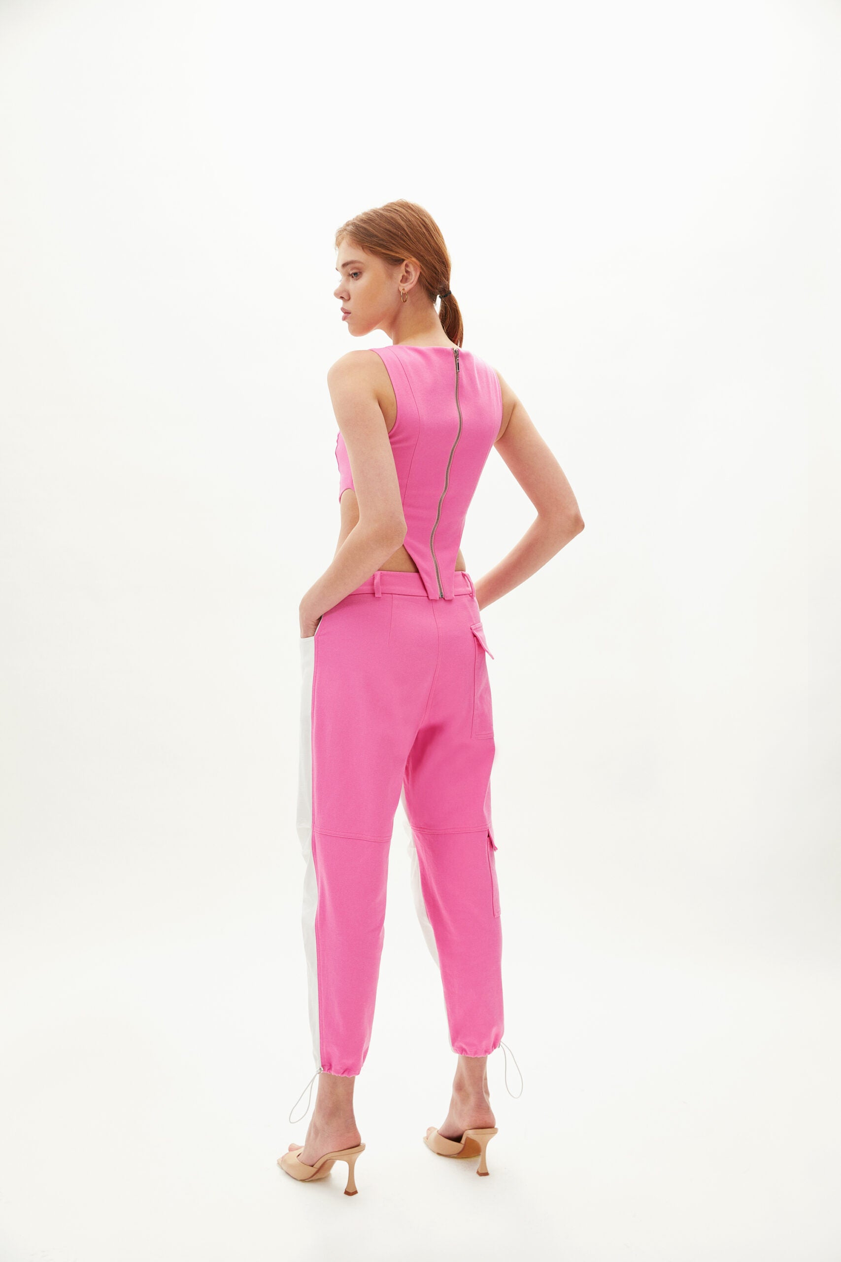 Çift renkli formülle modern bir durma sergileyen bu rahat pantolon, alçak bel tasarımı ve diz kısmıki pile detayıyla dikkat çeker. Ayarlanabilir paça lastikler sayesinde ister sallaş ister toparlanmış bir siluet yaratabilirsin. Gün boyu konfor sunan esnek yapısıyla hem dinamik hem de stil sahibi bir görünüm gereklidir.