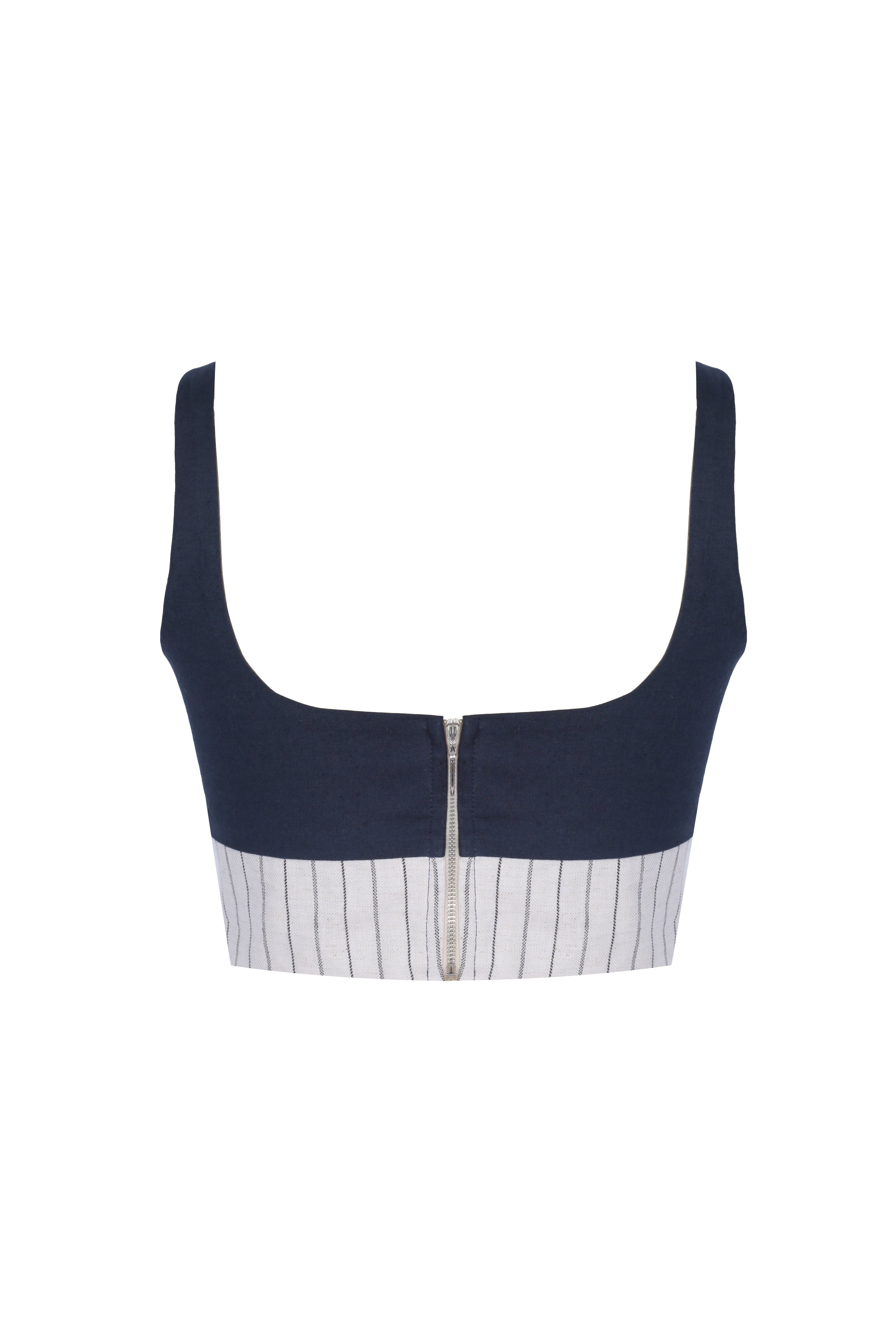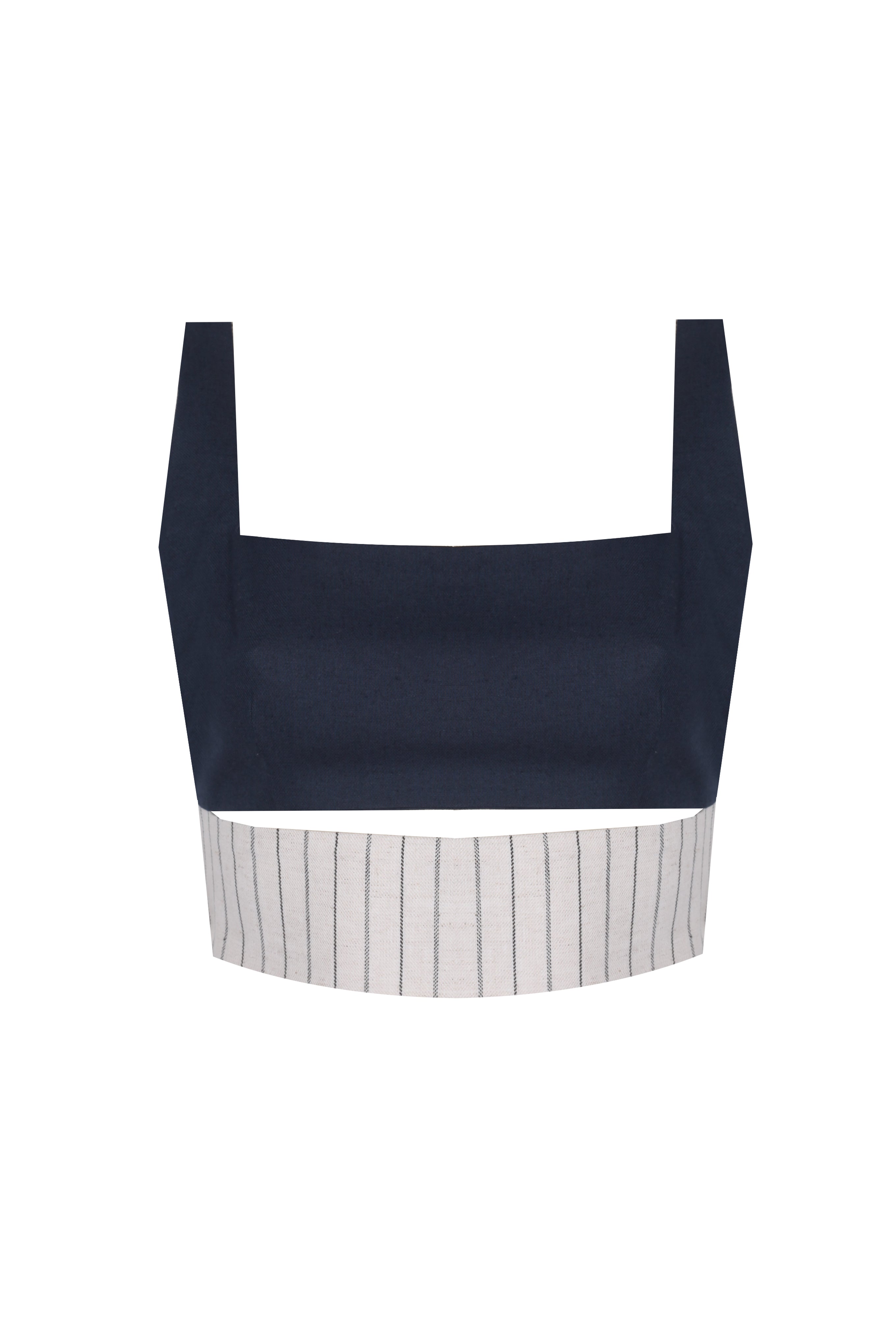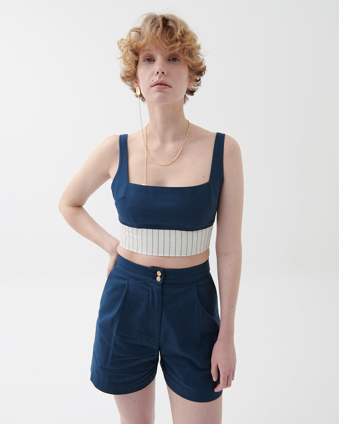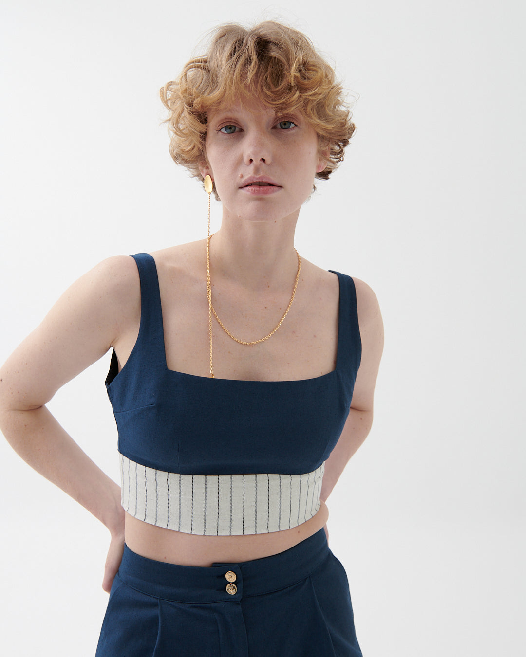 Vega Keten Crop Top, çizgili garnitür detayı ve zarif kesimiyle modern bir görünüm sunar. Ön kısımdaki küçük pencere açıklığı ve sırttaki fermuar detayı, tasarıma feminen ve dikkat çekici bir hava katar. %100 keten yapısı sayesinde hafif ve nefes alabilen bir konfor sağlar. Yaz aylarında şıklığı doğal bir duruşla birleştirmek isteyenler için ideal bir parça.