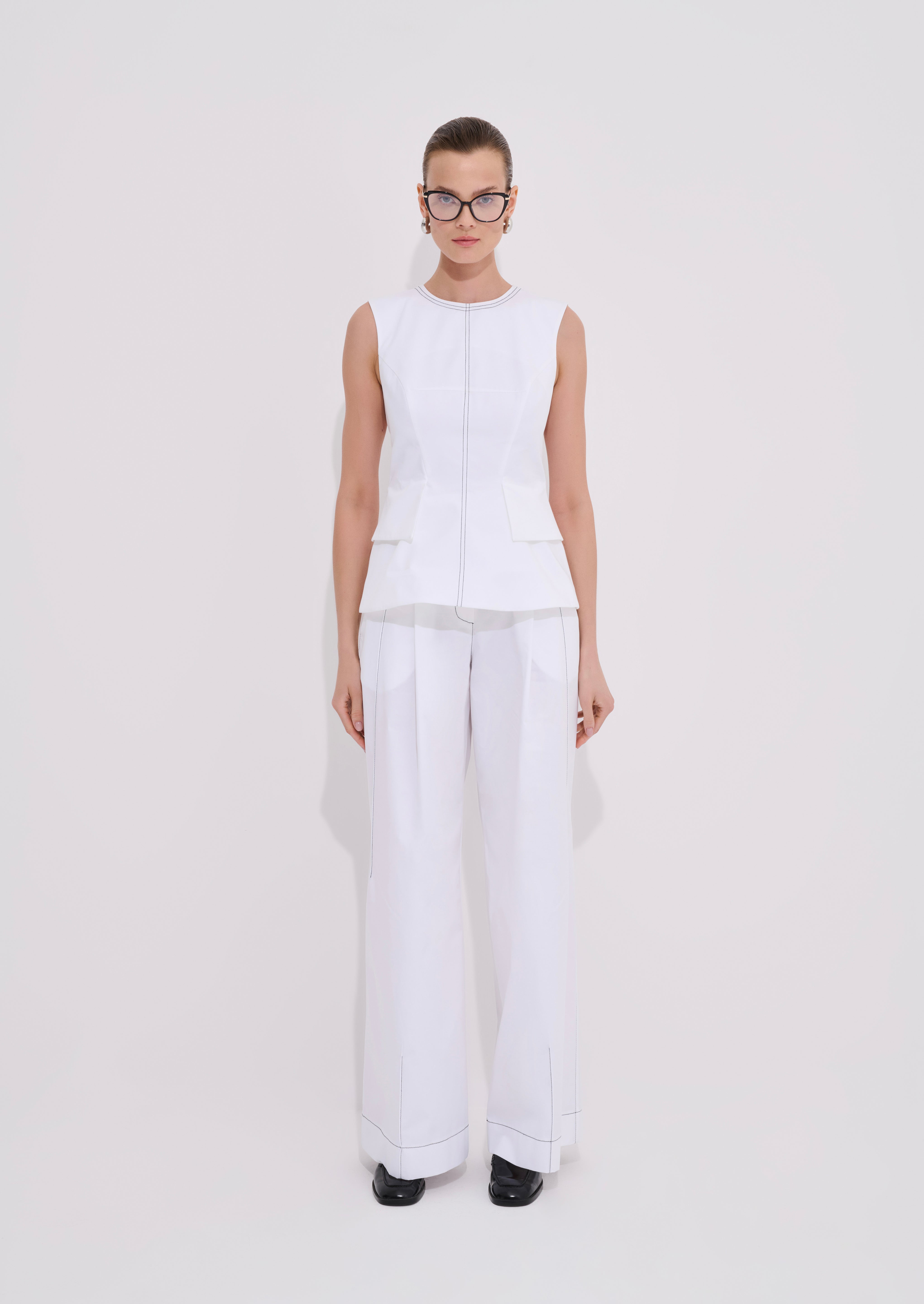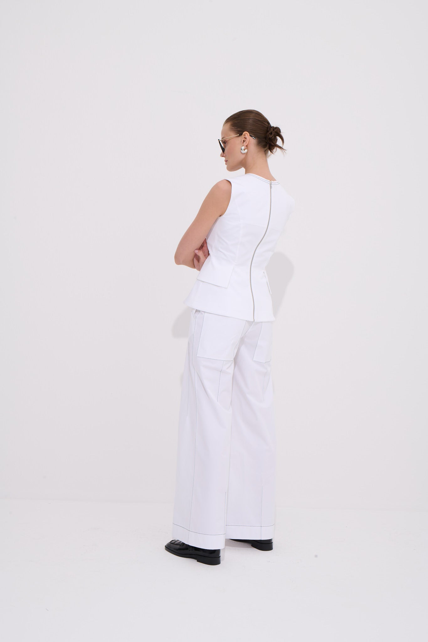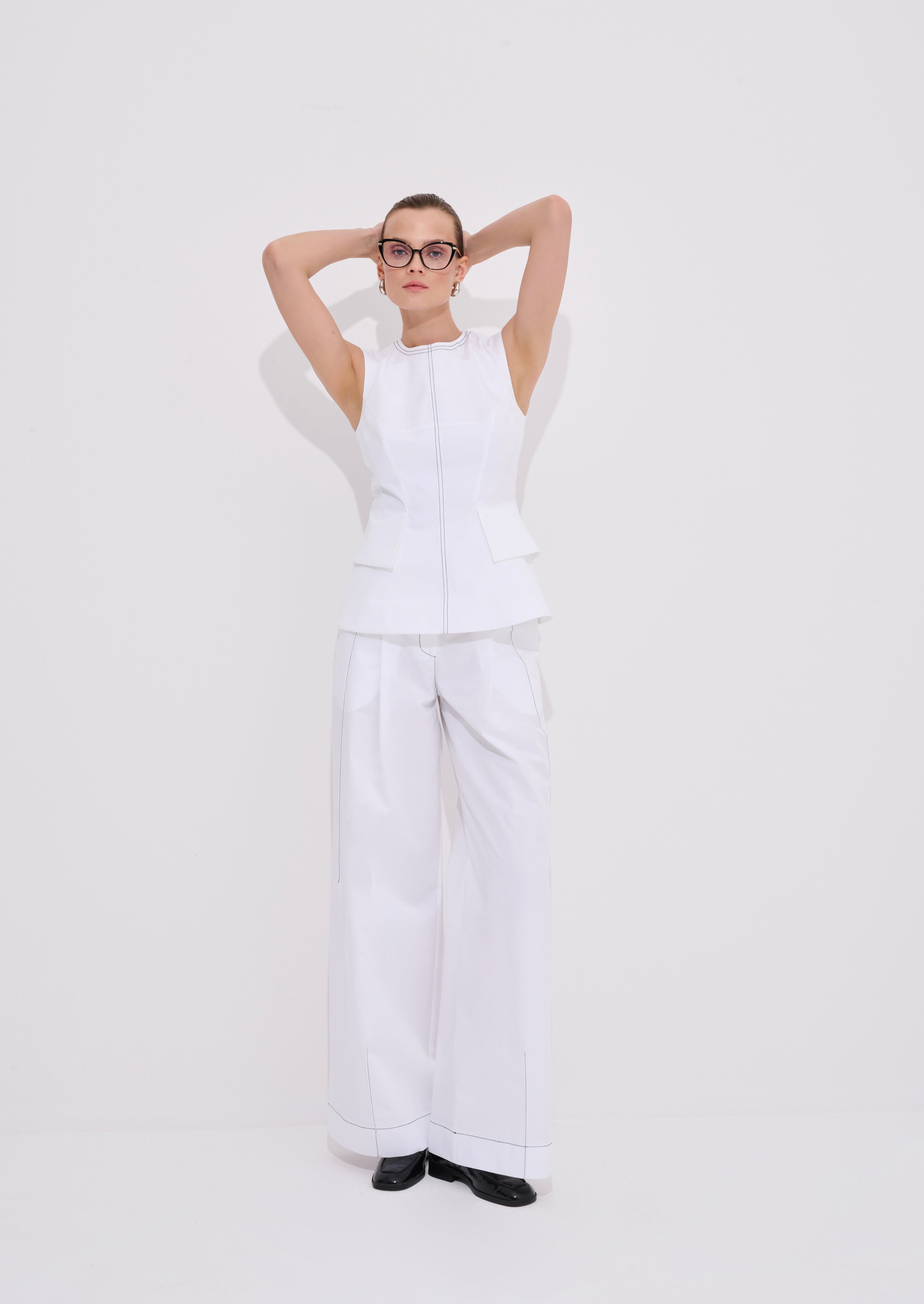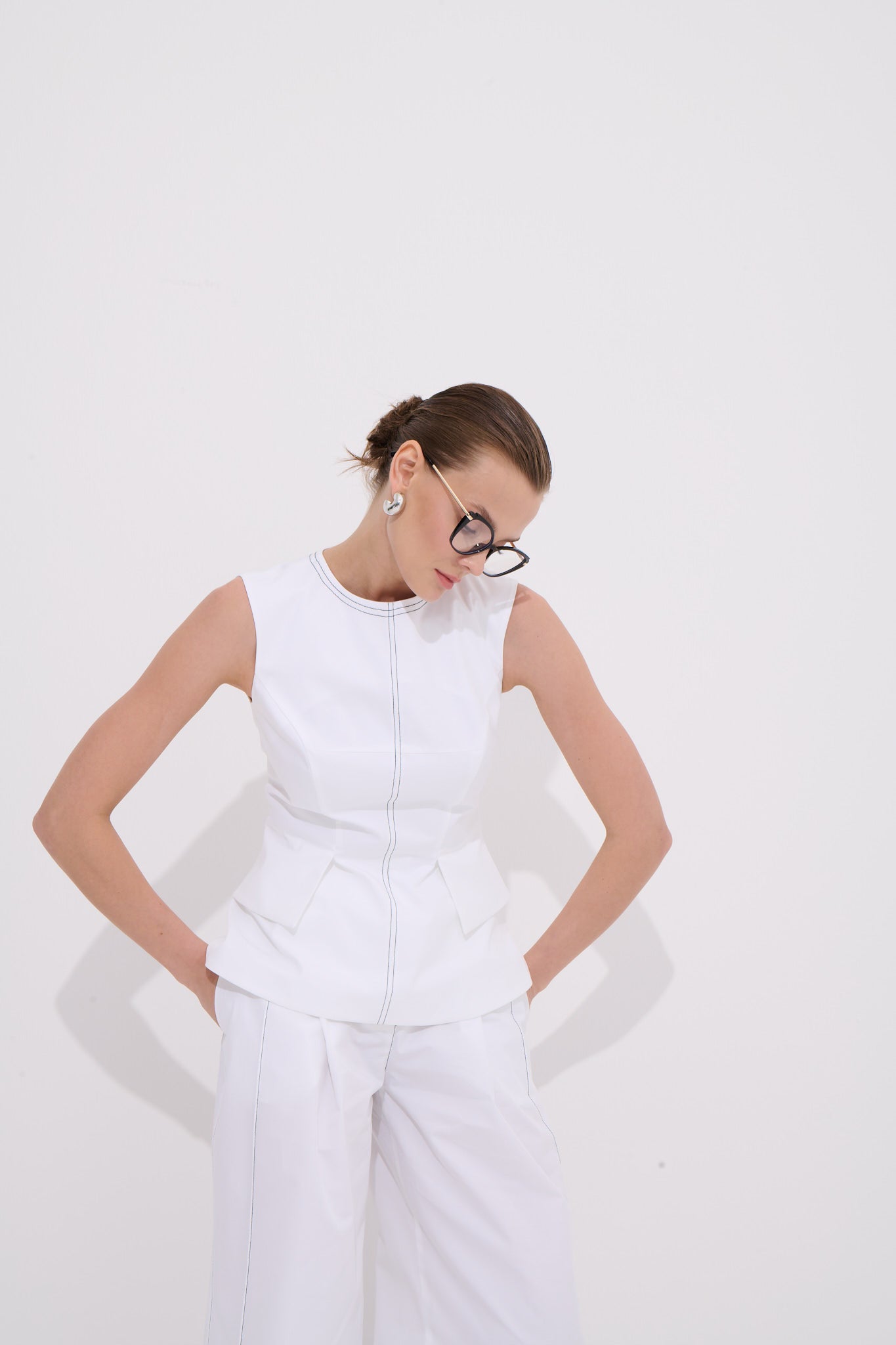 Güçlü hatlara sahip bu beyaz bluz modern şehirli stile sofistike bir yorum katar