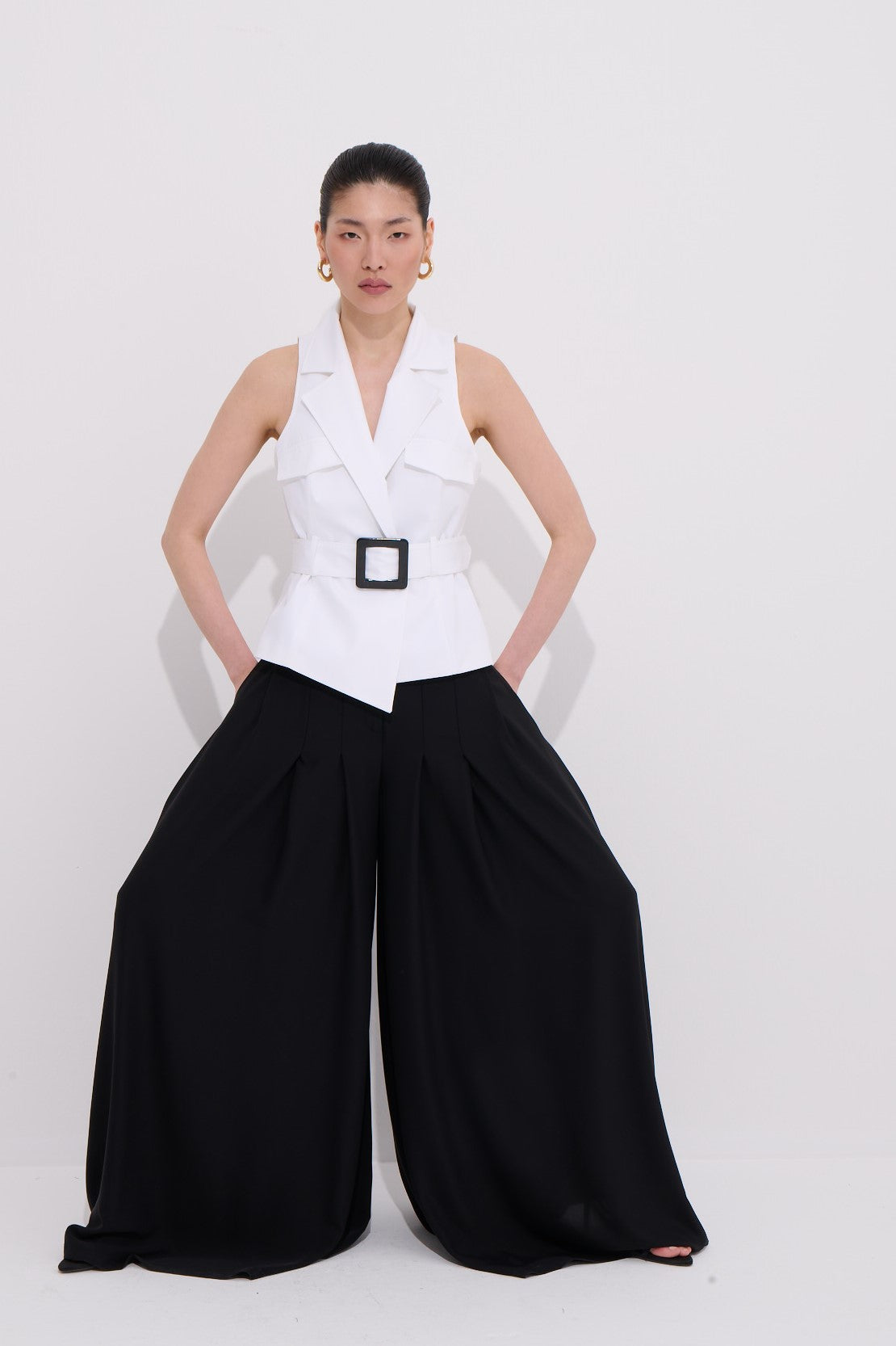 Pantolon formunda tasarlanan bu özel parça etek siluetini andıran yapısıyla zarif ve özgün bir duruş sunar. Bel çevresini tamamen saran pileli detayları ve dökümlü yapısıyla hareketli bir görünüm yaratır. Yüksek bel kesimi modern bir şıklık katarken siyah tonu zamansız stil arayanlar için ideal bir seçenektir