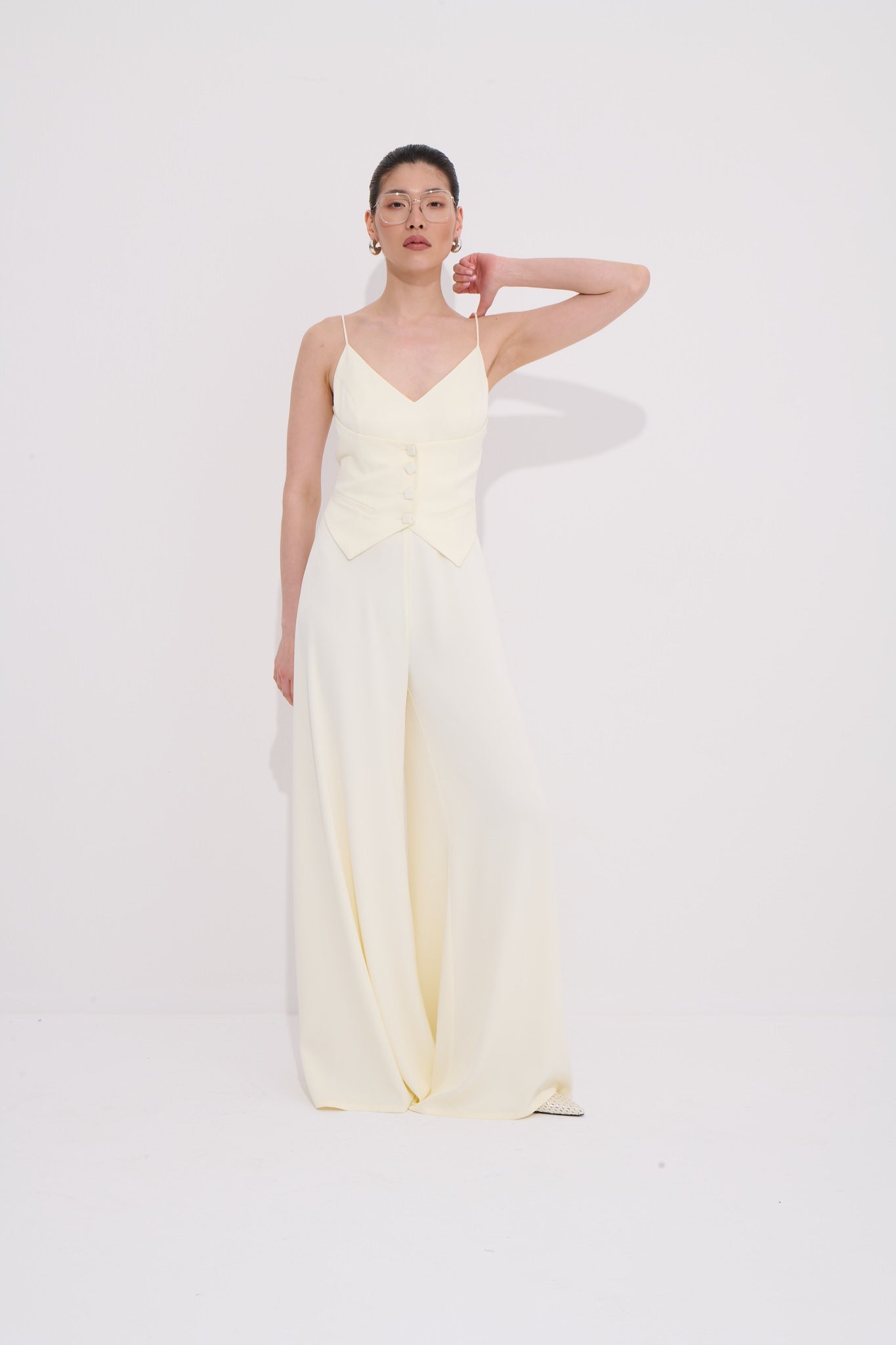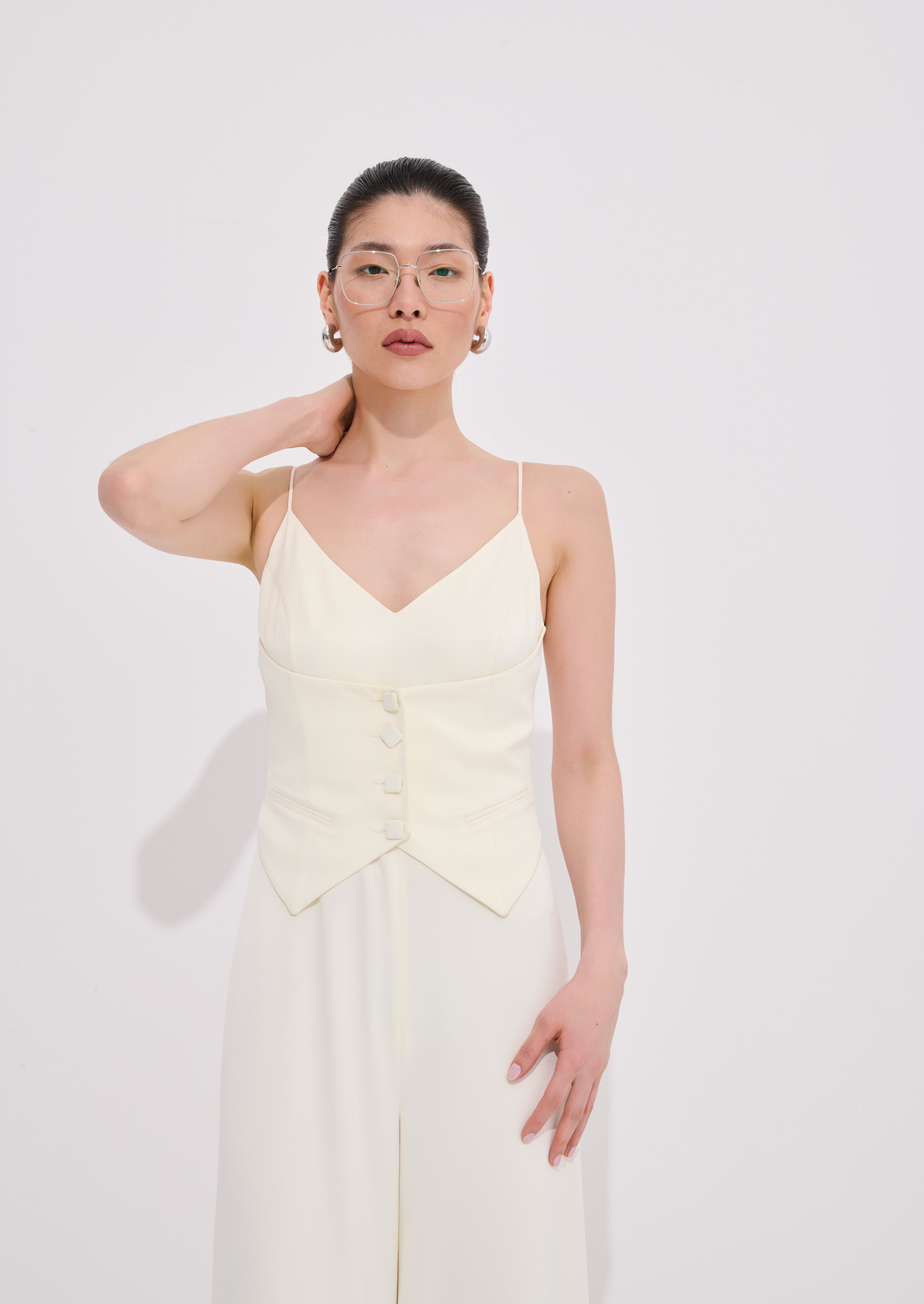 Modern çizgileri zarif bir silüetle buluşturan bu askılı tulum kıyafeti üst kısmıyla farklı bir takım etkisi yaratır. Ayarlanabilir askılar ve arka gizli fermuar detayı parçaları uyumlu ve konforlu bir kullanım sunar. Alt bölümde yer alan dökümlü geniş paçalar akıcı bir hareket sağlar ve günlük şıklığı modern bir dokunuşla tamamlar