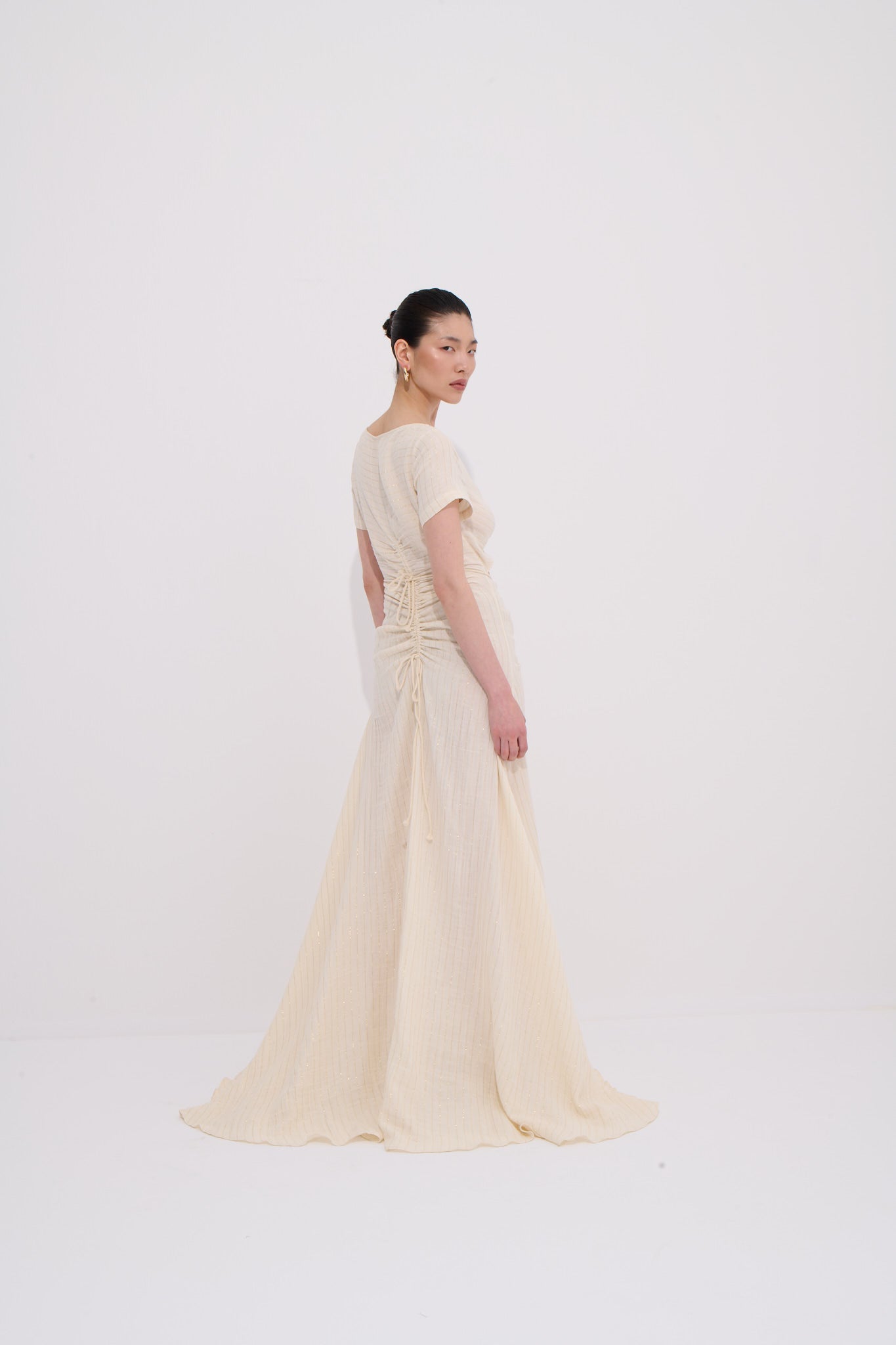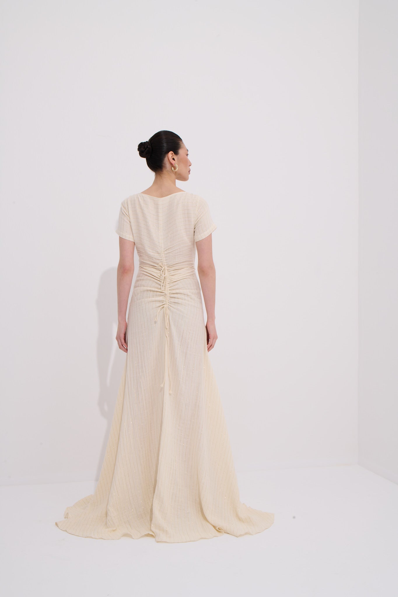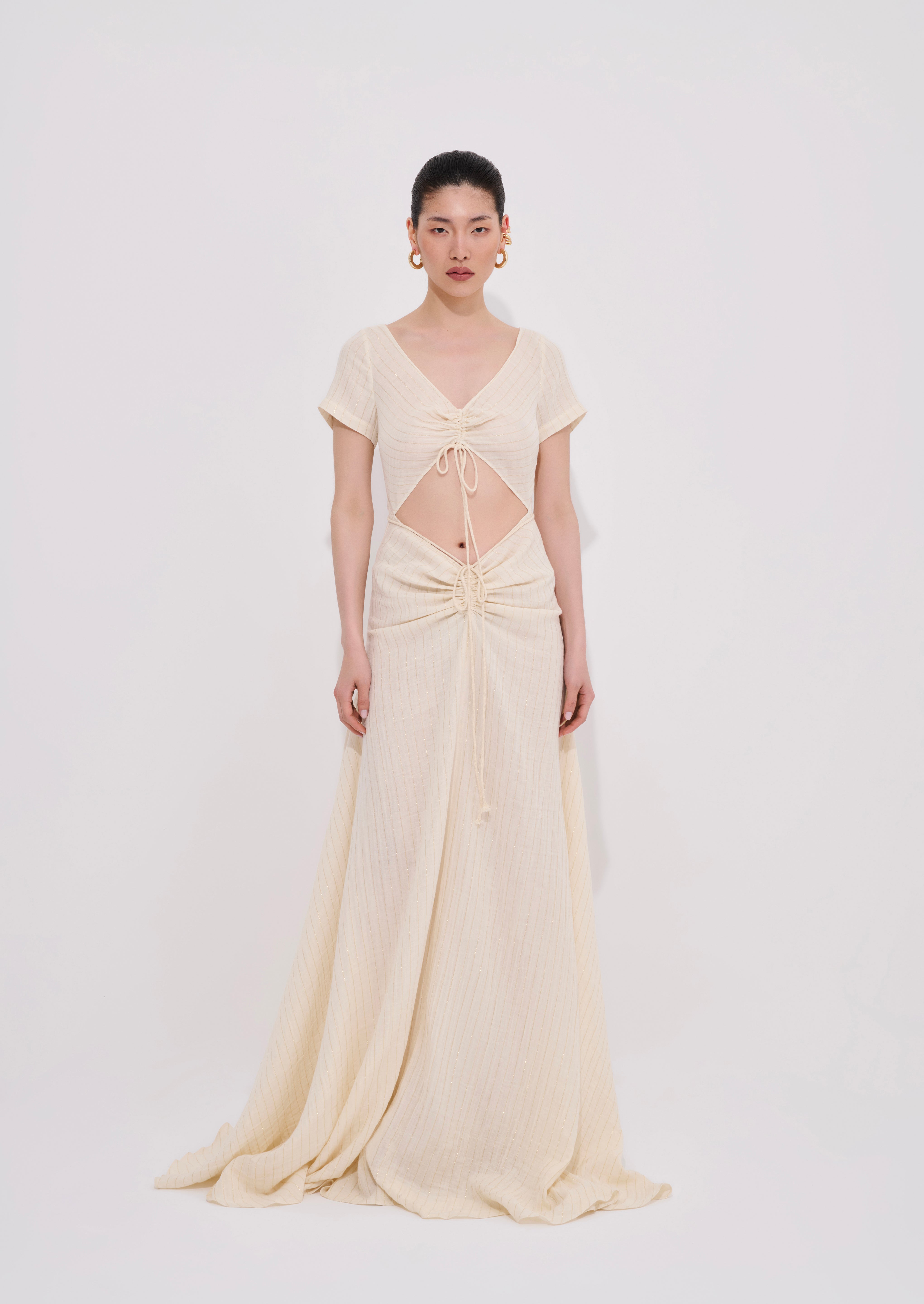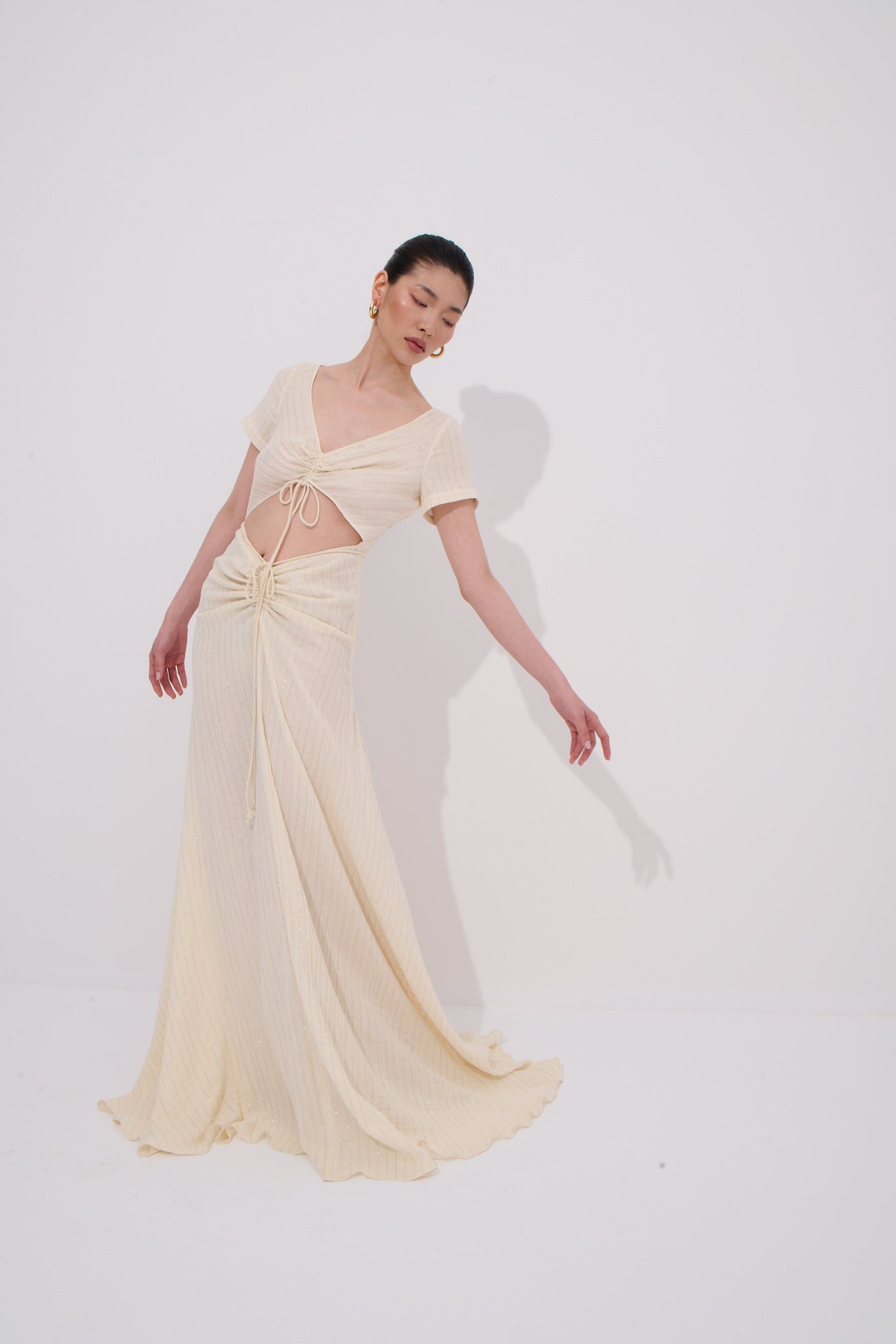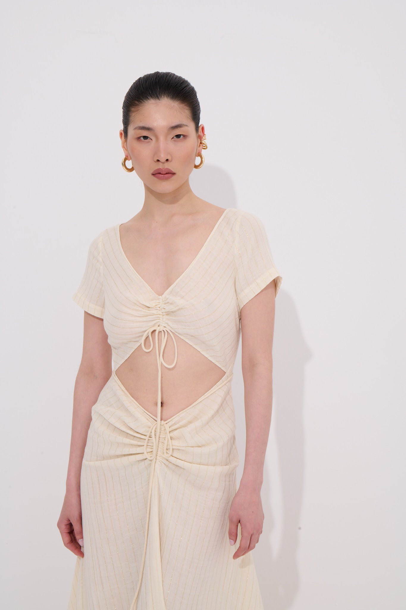 Yaz mevsimi için özel olarak tasarlanan bu maxi elbise doğal dokusu ve ışığı yansıtan zarif altın çizgileriyle kusursuz bir görünüm sunar.Vücudu saran formu ve beldeki kesim detayı feminen bir siluet yaratırken önde ortada ve arkada yer alan ayarlanabilir buzgüler hareketli bir stil kazandırır. Hafif kumaşı sayesinde şehirde ya da tatilde konforlu bir şıklık sunar