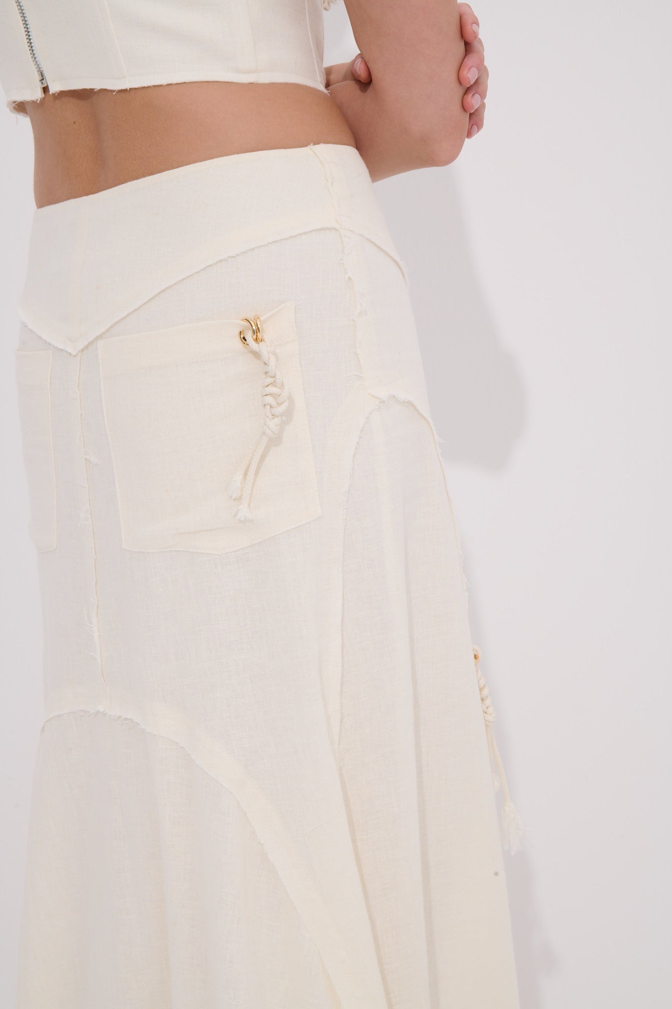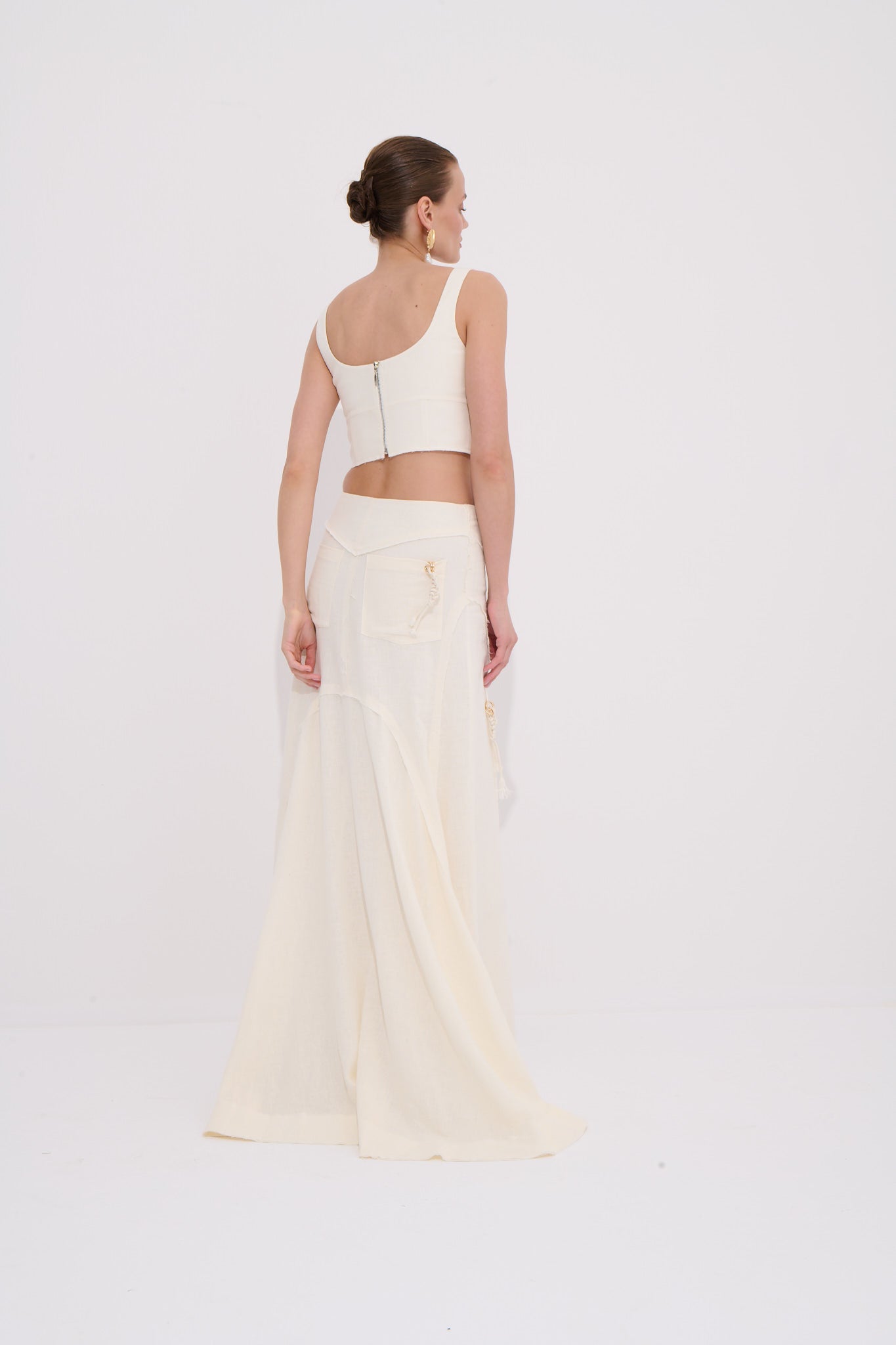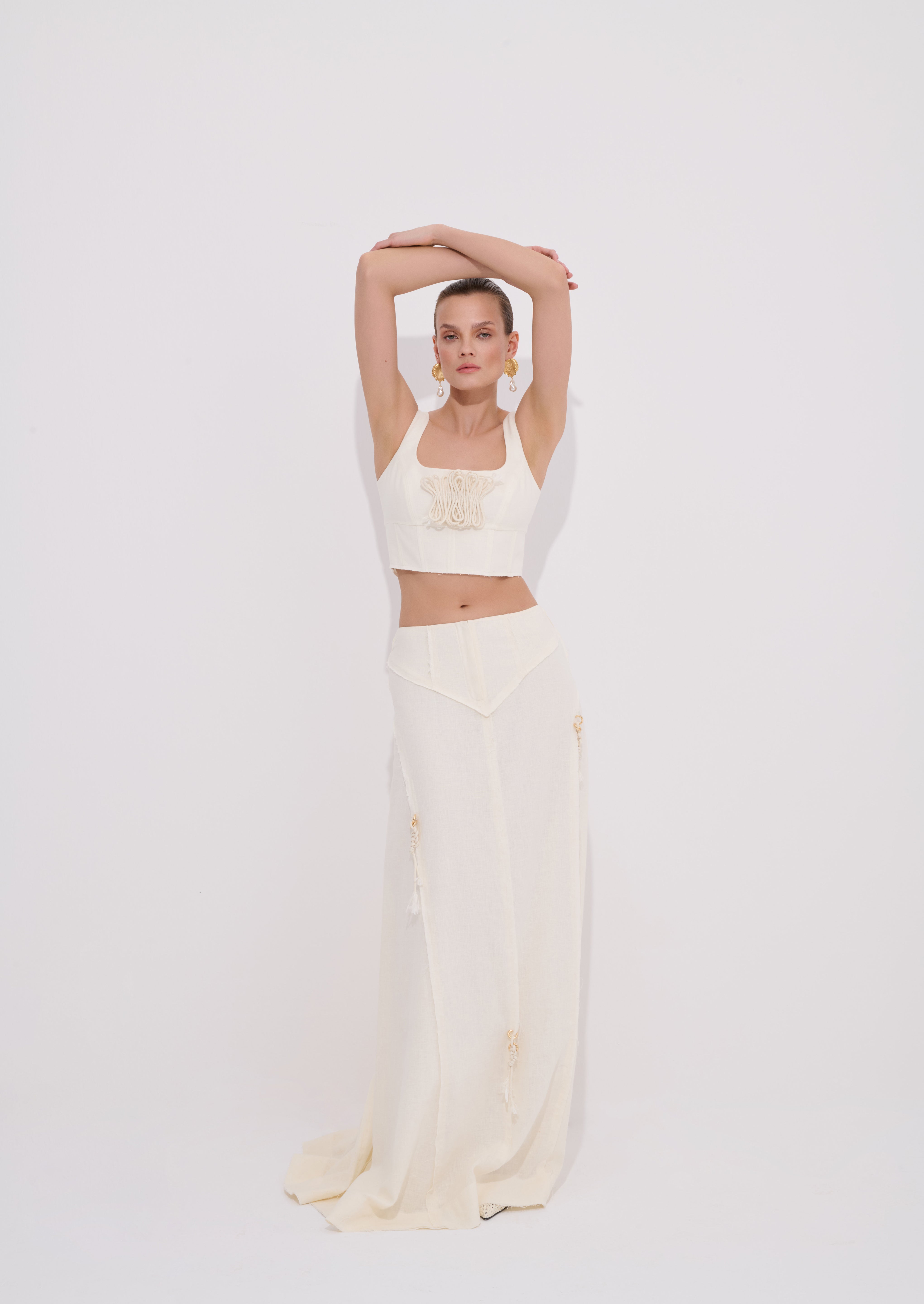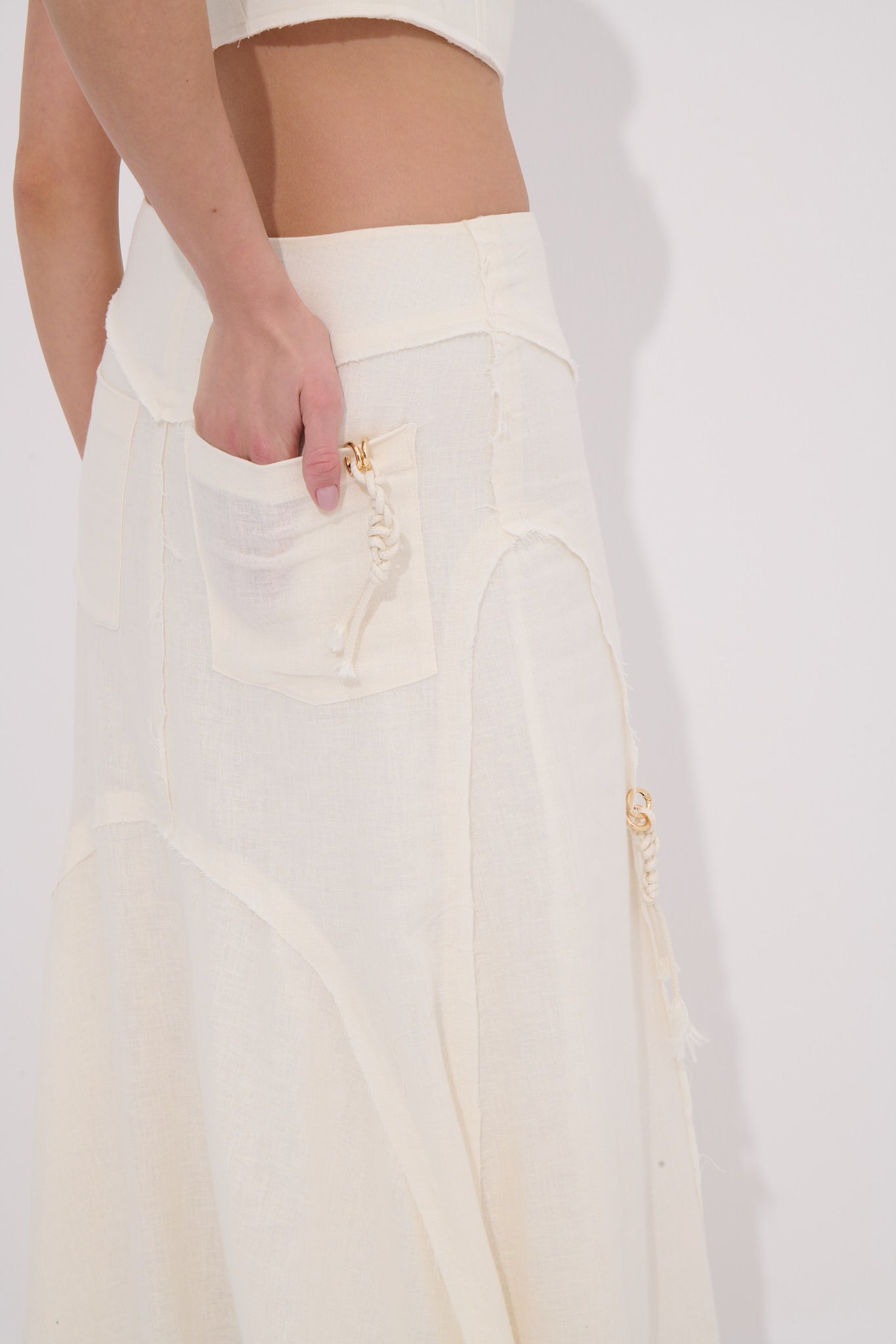 El işçiliğiyle tamamlanan doğal dokusu ve kuyruklu arka formuyla bu düşük bel uzun etek zarif ve özgün bir yaz stili arayanlara hitap eder