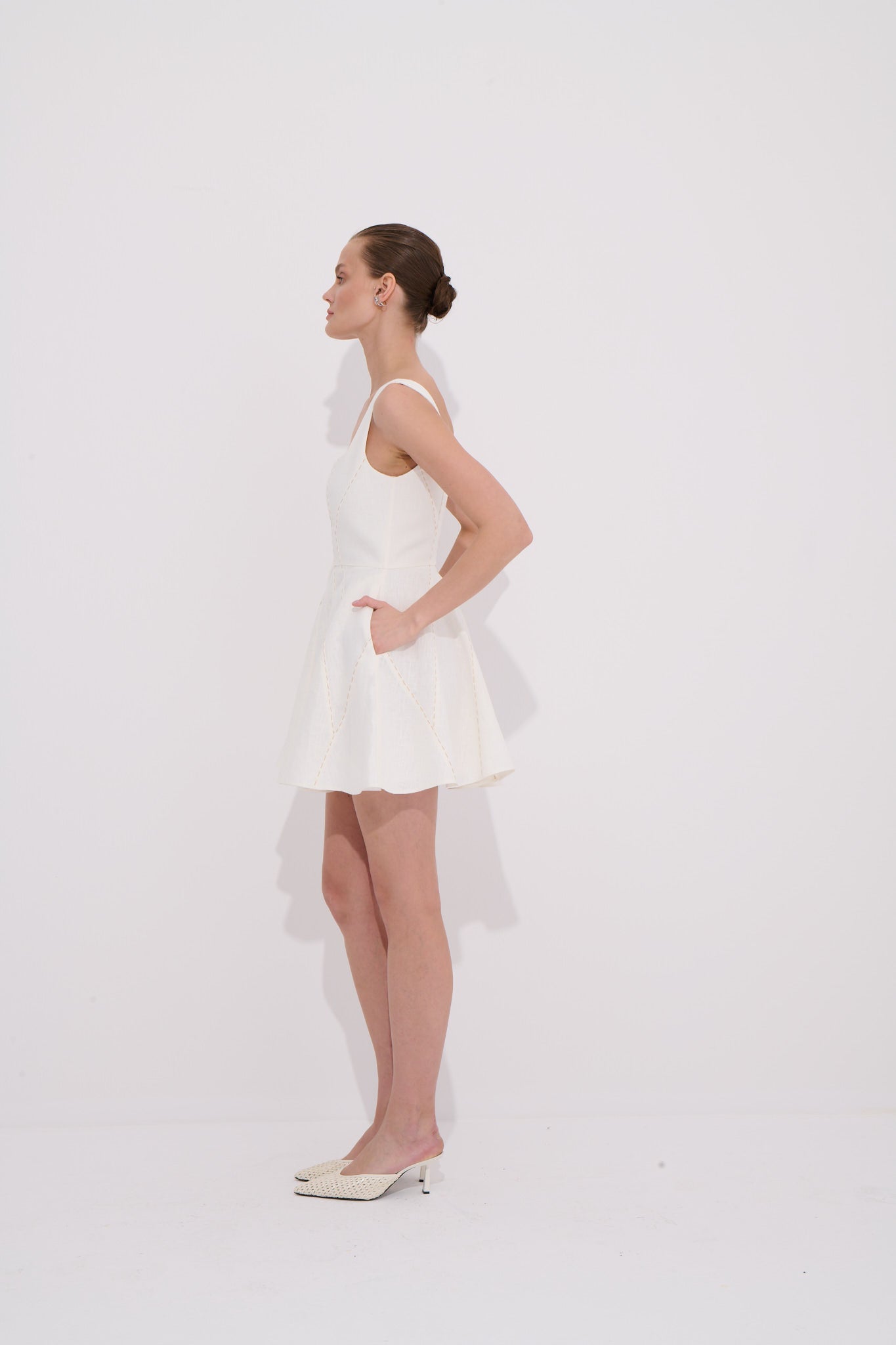 Ivory Kısa Elbise %100 Keten Punto Dikiş Detaylı