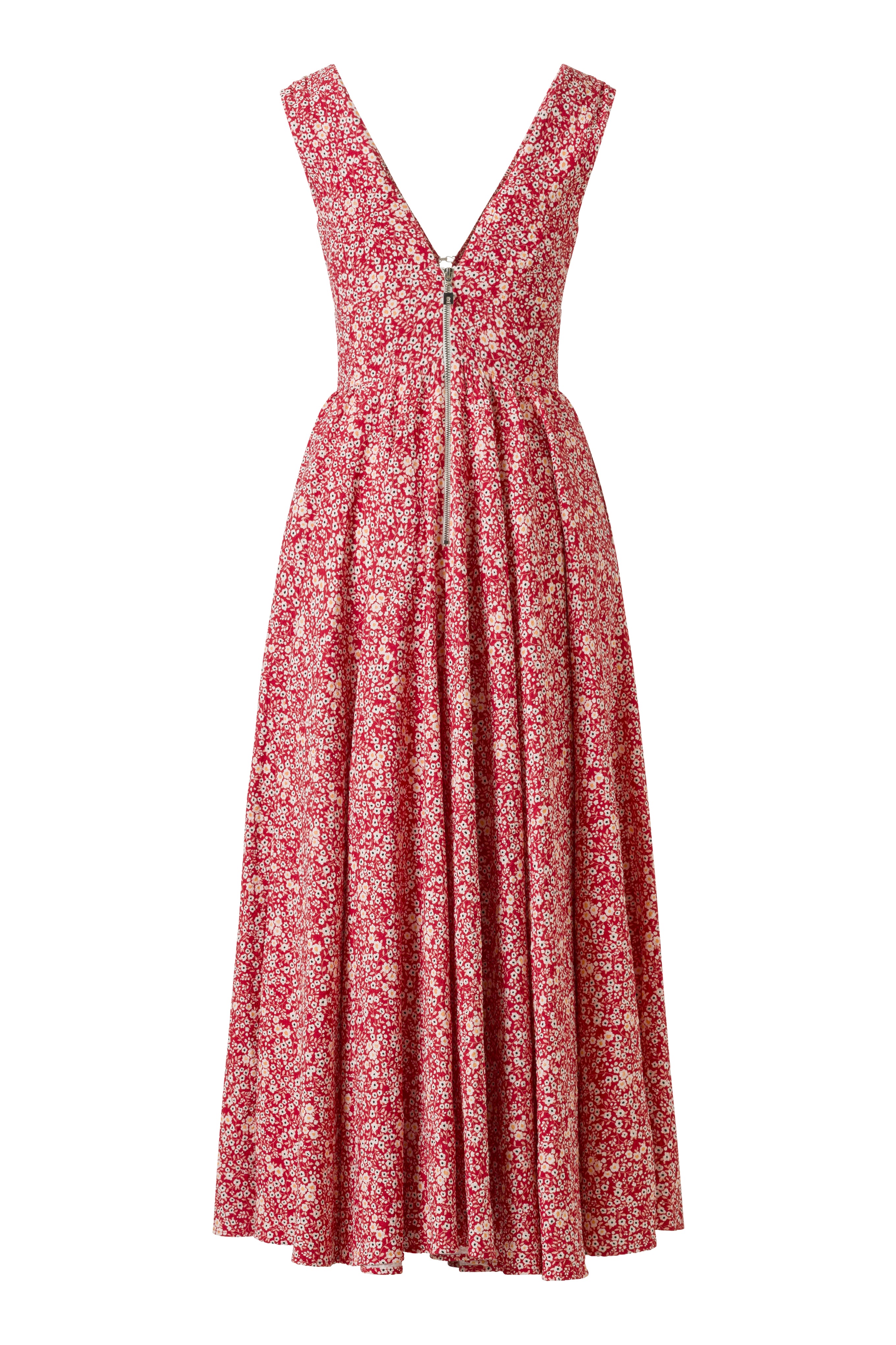 Canlı kırmızı zemin üzerine beyaz ve sarı küçük çiçek desenleriyle tasarlanan bu elbise yaz stiline enerji katar. Üst kısmı vücuda oturan formda tasarlanırken 360 derece dönen kloş eteğiyle akıcı ve zarif bir hareket sunar.Derin V yaka ve ortadaki zarif metal aksesuar feminen detaylarla modern çizgiyi buluşturur