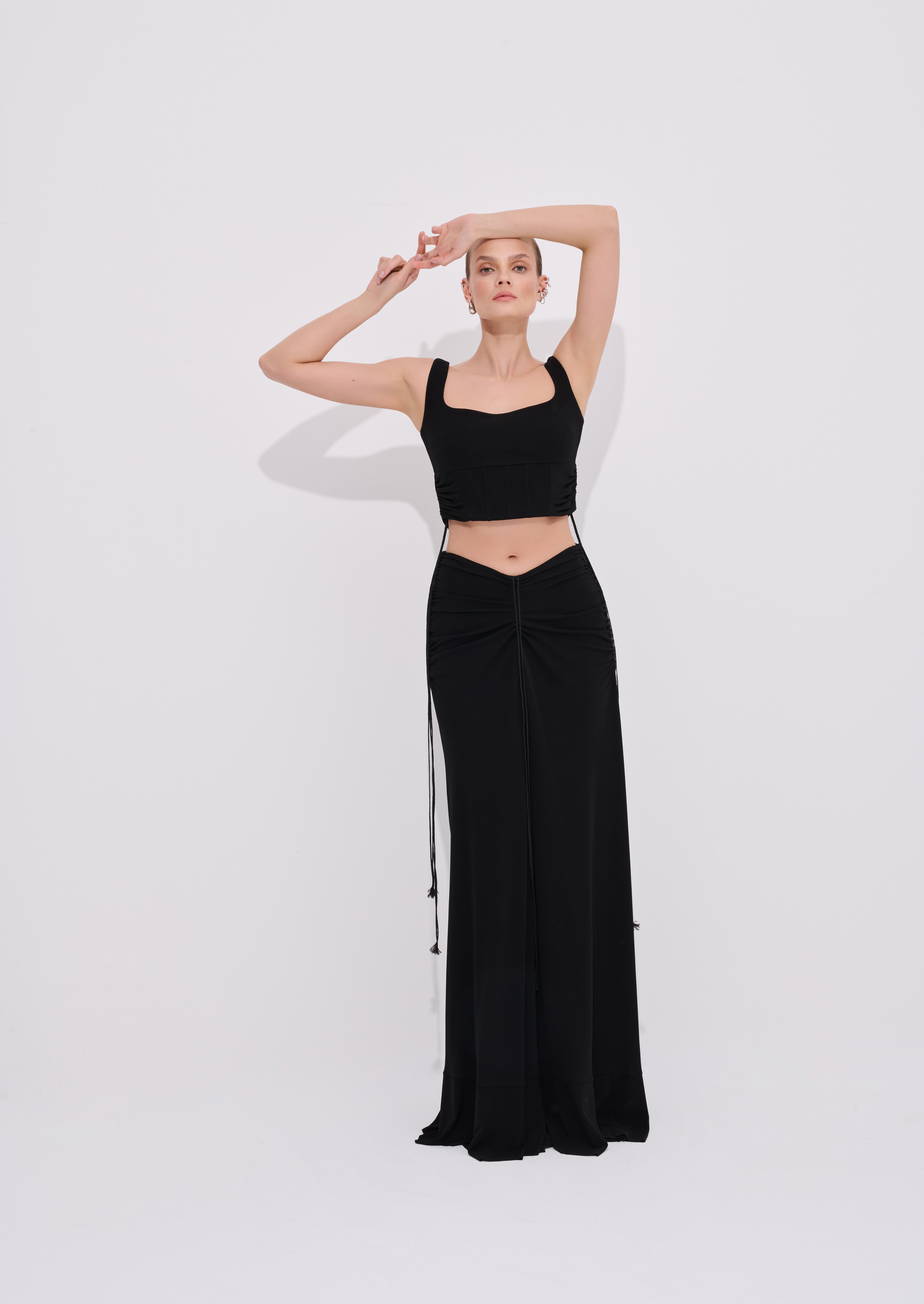 Modern ve güçlü bir siluet sunan bu siyah büstiyer korse formundan ilham alan yapısıyla dikkat çeker. Parlak ve esnek floş kumaşı yanlardaki buzgü detaylarıyla birleşerek feminen bir görünüm yaratır. Minimal tasarımı sayesinde hem gece hem de gündüz kombinlerinde iddialı bir duruş sergiler