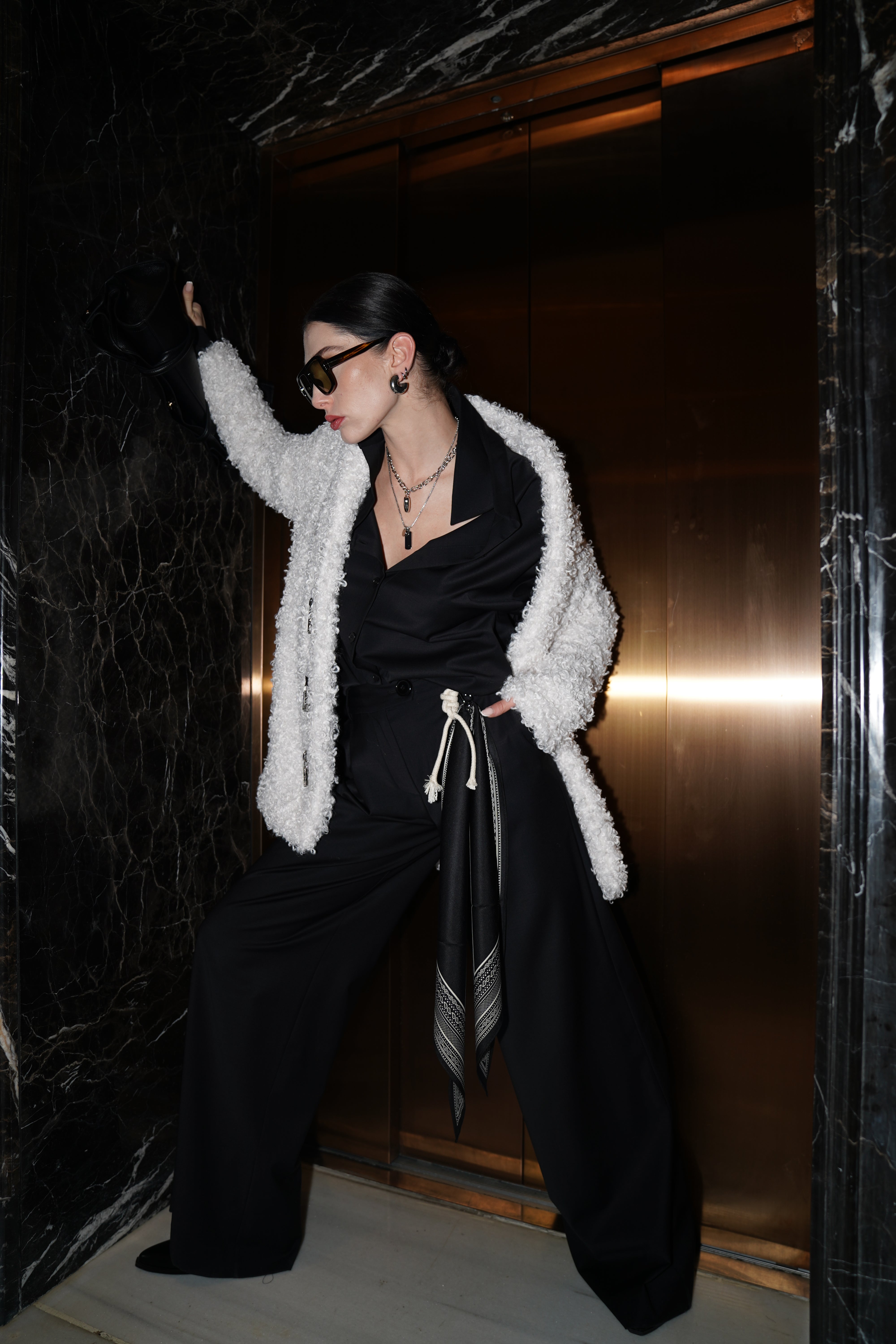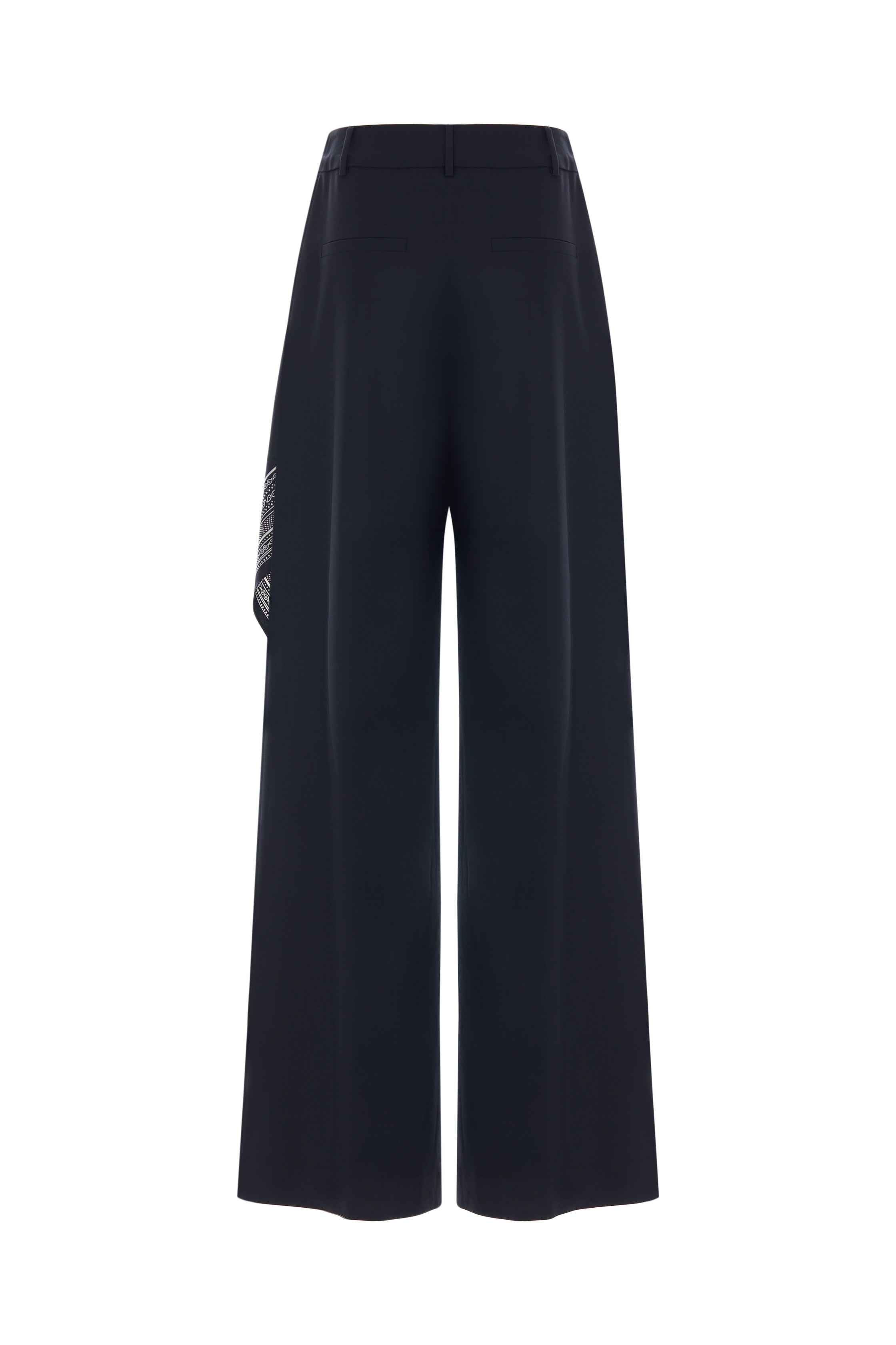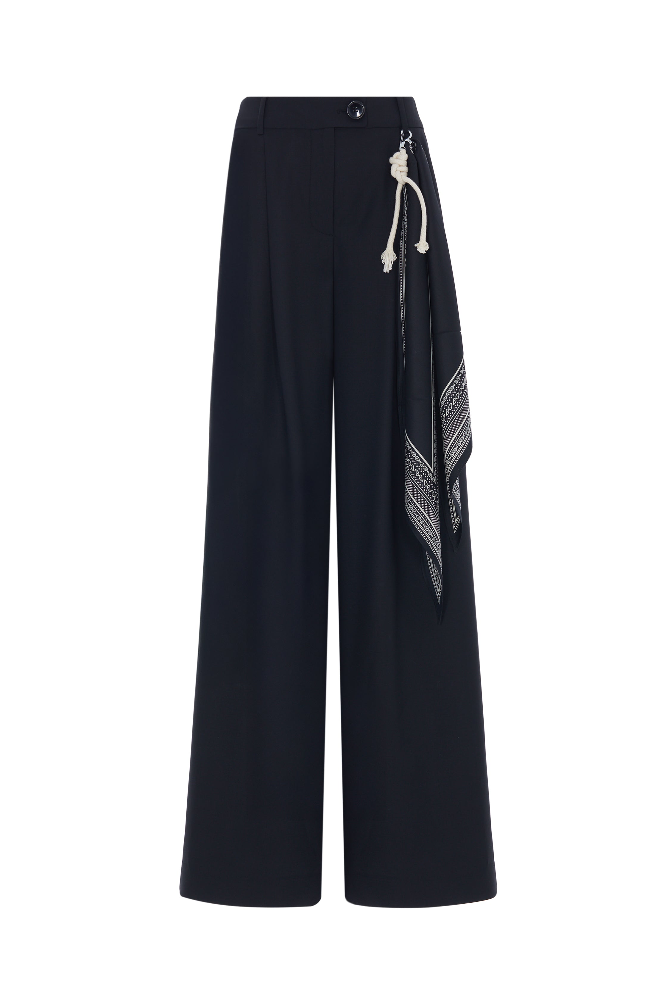 Klasik çizgileri modern detaylarla buluşturan bu geniş paçalı pantolon, rahat kesimiyle gün boyu konfor sunarken zarif duruşundan ödün vermez. Yün karışımlı kaliteli kumaşı dökümlü bir siluet oluşturur. Yan kısmındaki çıkarılabilir fular detayı tasarıma özgün bir dokunuş katarken, kemer halkaları ve özenli dikiş hatlarıyla sofistike bir görünüm tamamlanır.