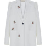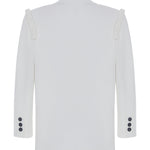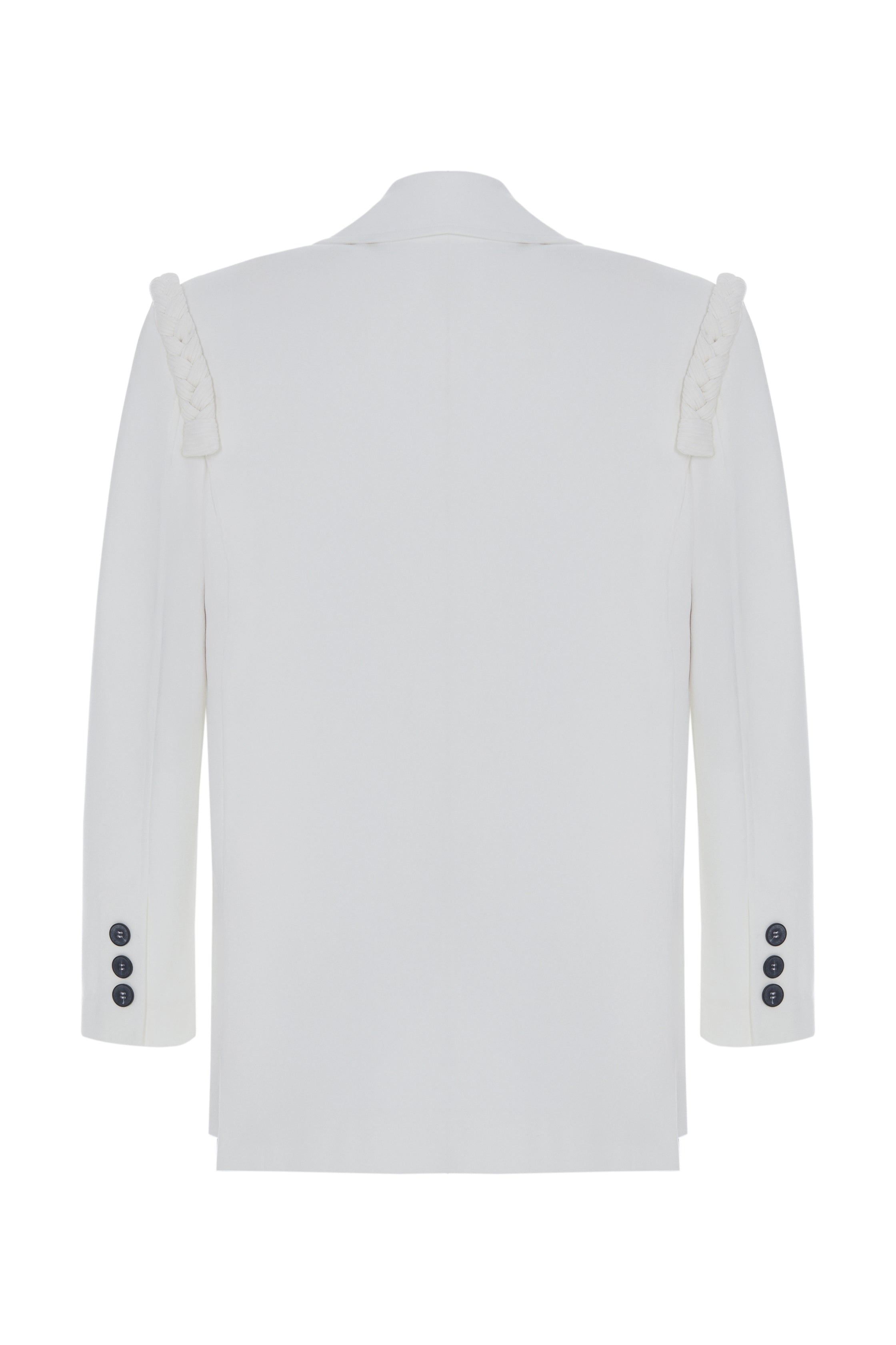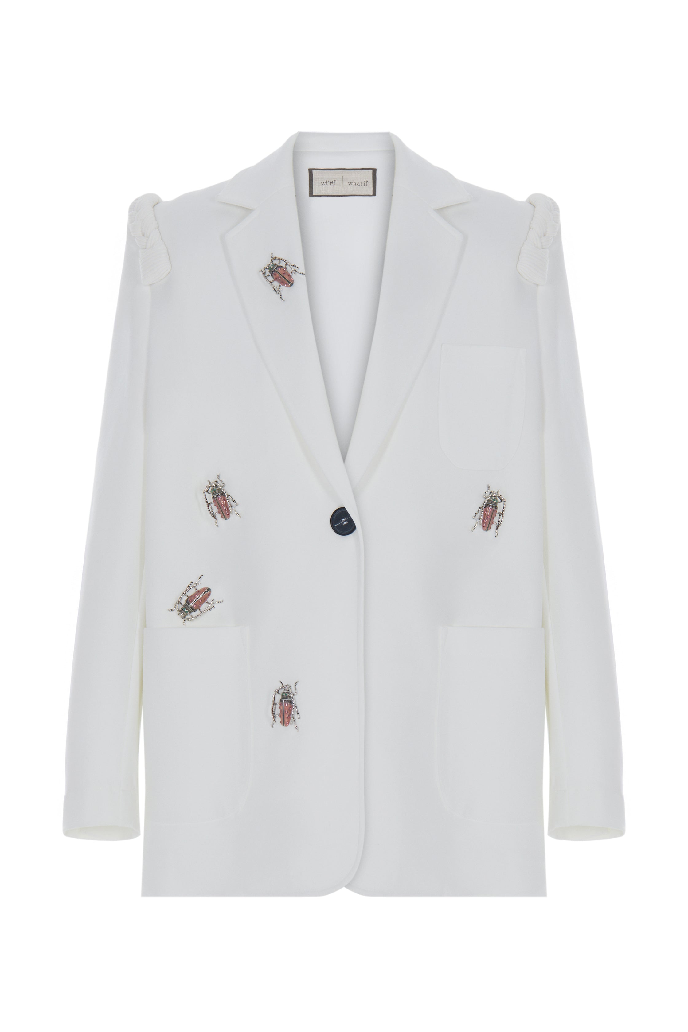 Maëlle Ceket, modern çizgilerle şekillendirilmiş zarif ve özgün bir görünüm sunar. Bol ve rahat kesimiyle güçlü bir siluet yaratan bu tasarım, saf beyaz tonunun zarafetini el işçiliğiyle işlenmiş böcek aksesuar detaylarıyla buluşturur. Omuzlarda yer alan örgü dokulu şeritler, tasarıma el işçiliği vurgusu ve heykelsi bir yapı kazandırır. Tek düğmeli kapanış formu ve büyük cep detayları, klasik terziliği modern bir sanatsal dokunuşla yeniden yorumlar. Günlük şıklığı ve özel görünümleri birleştiren seçkin bir parça olarak koleksiyonda öne çıkar.
