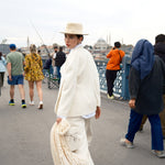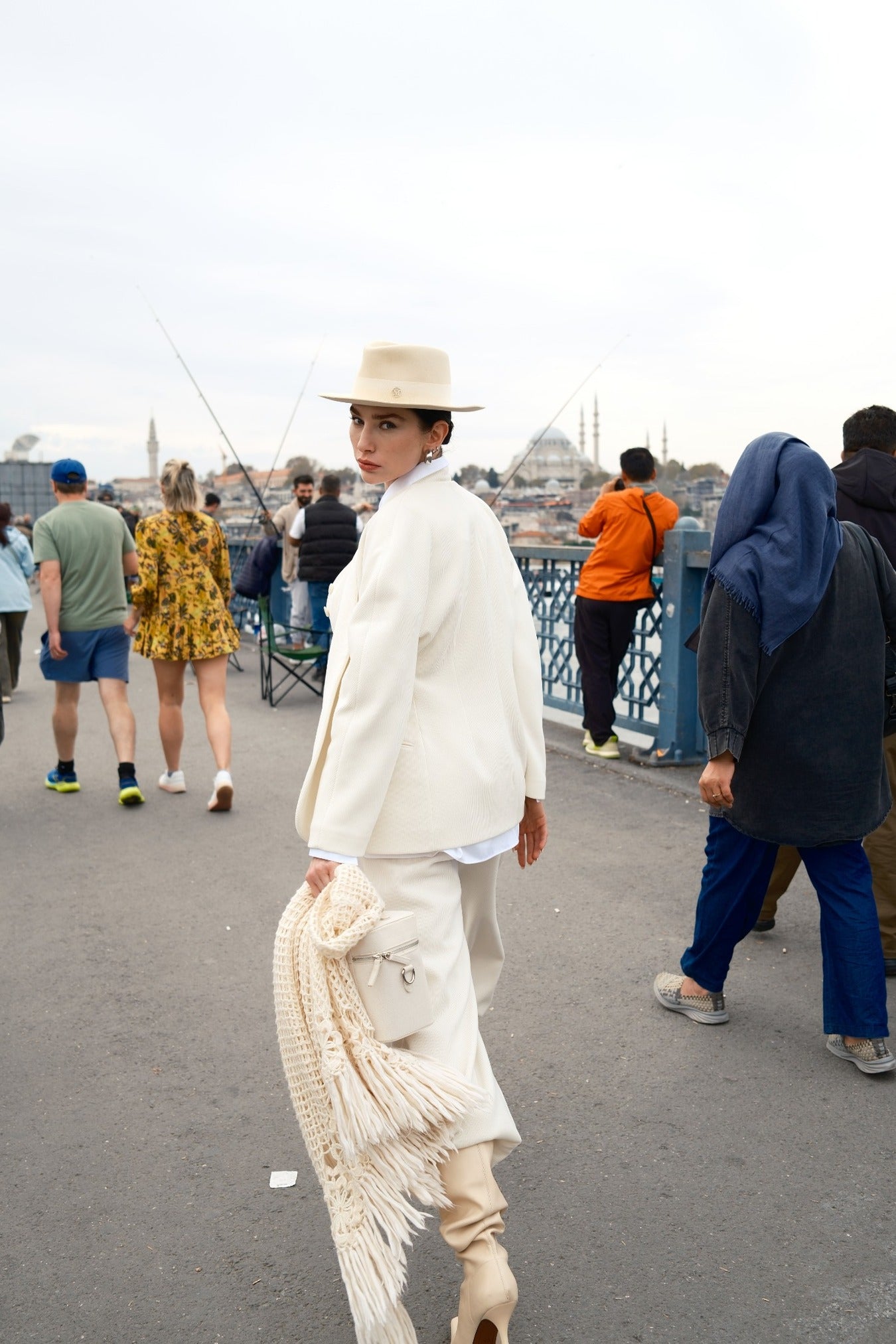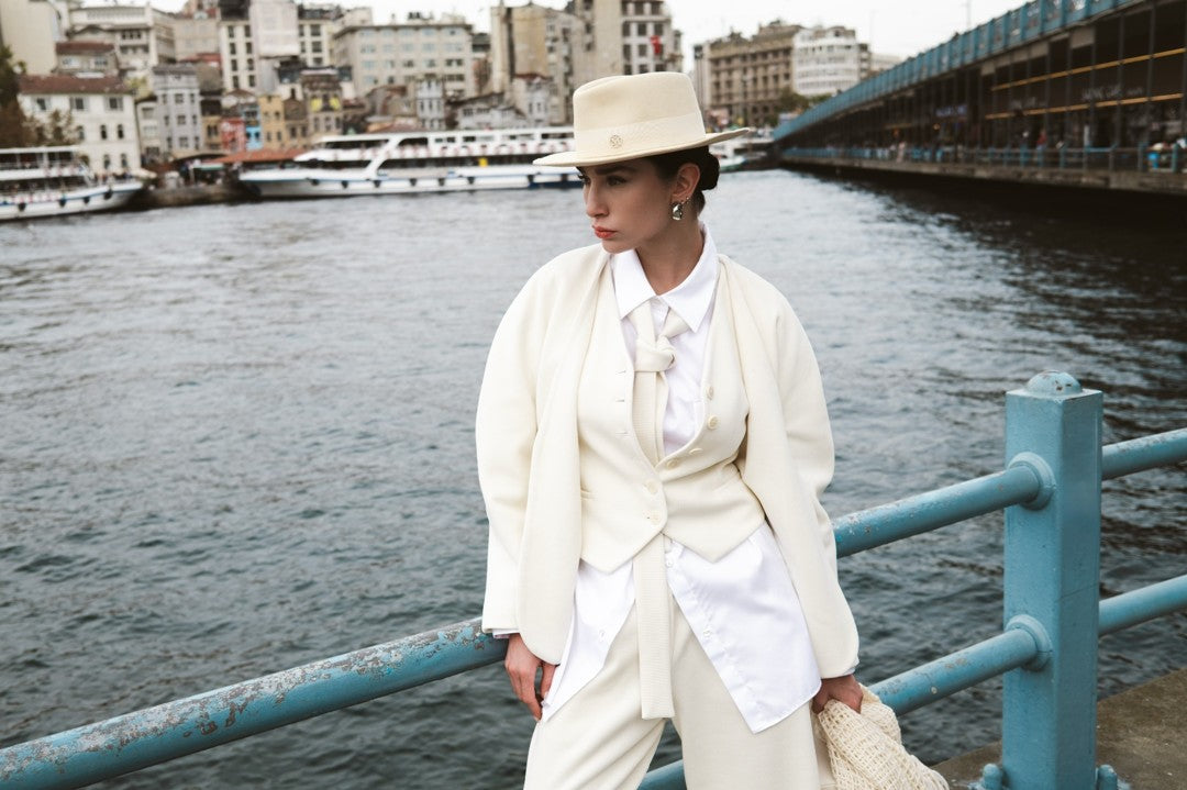 Krem ton yüzey akıcı kesim ve minimal çizgilerle birleşerek zarif bir görünüm sağlar