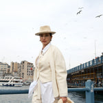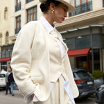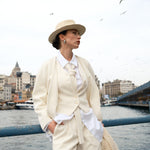 Modern zarafet ve maskülen çizgiyi bir araya getiren bu kadife yelek, heykelsi duruşu ve kusursuz formuyla dikkat çeker. Yumuşak dokulu krem tonu, yapısal omuz hattı ve temiz bitişleriyle güçlü, sade ve zamansız bir siluet sunar. Şehir şıklığından özel davetlere kadar birçok stile uyum sağlayan tasarım, minimal ama etkileyici bir ifade yaratır. Gardırobunuzda uzun yıllar değerini koruyacak sofistike bir parçadır.