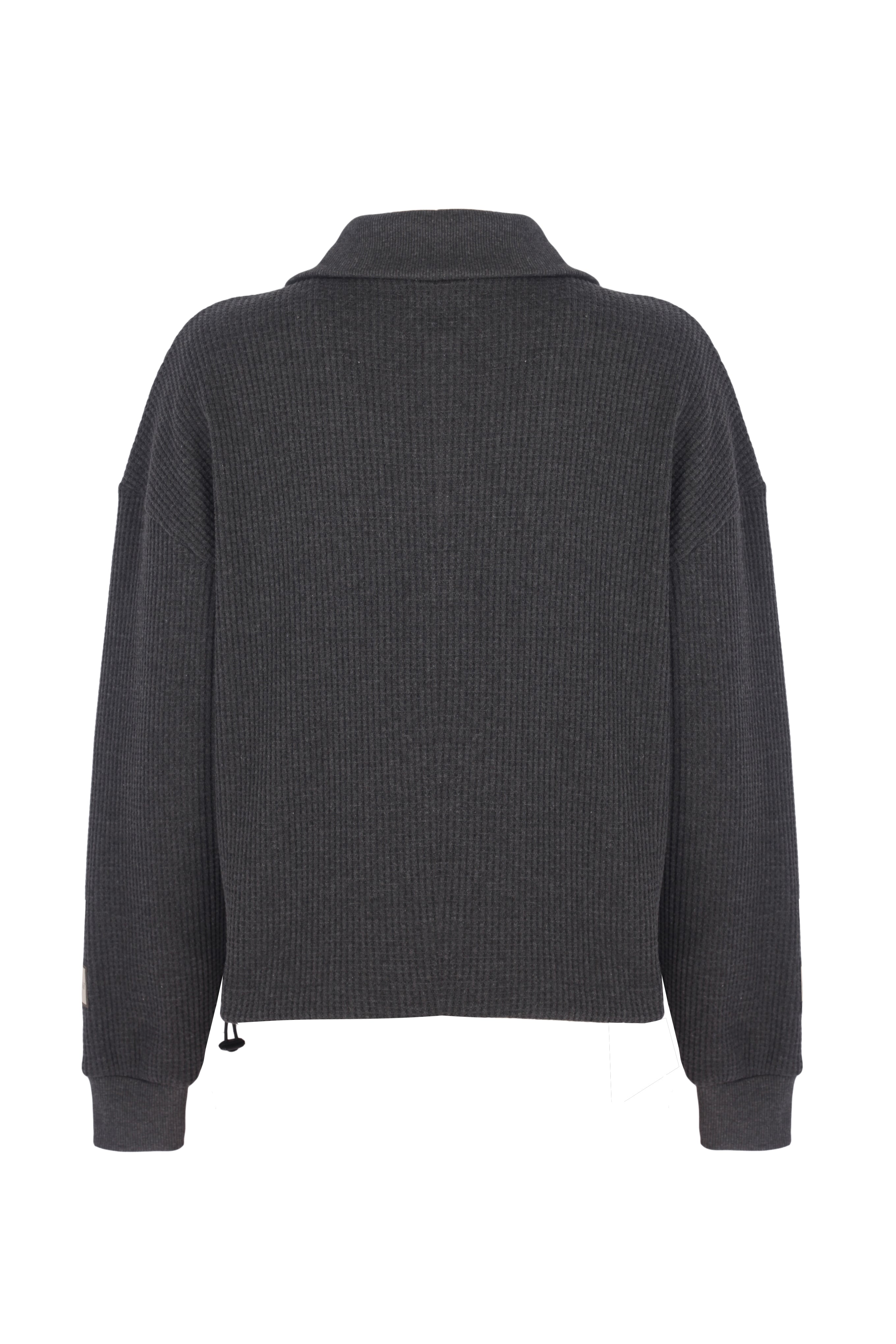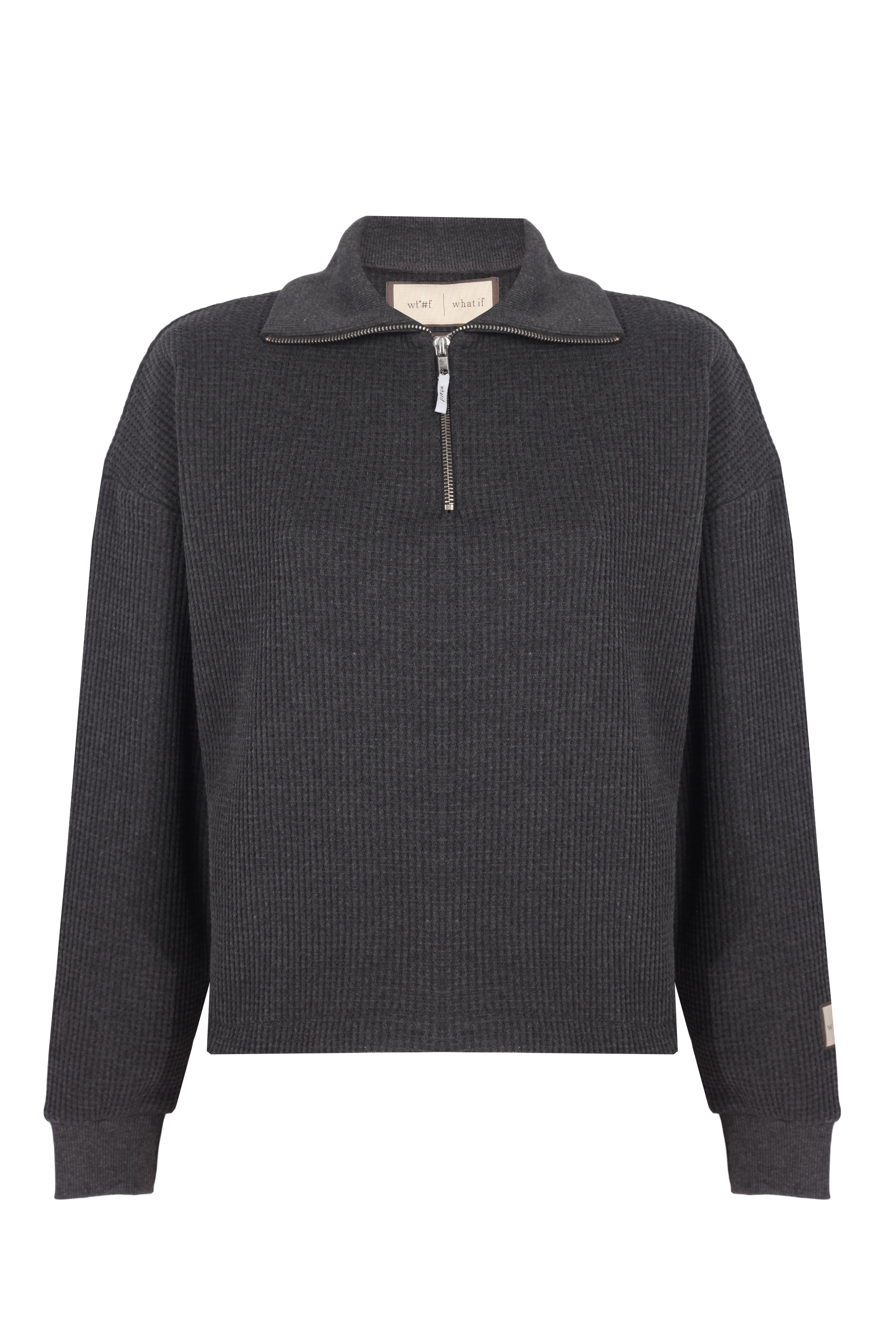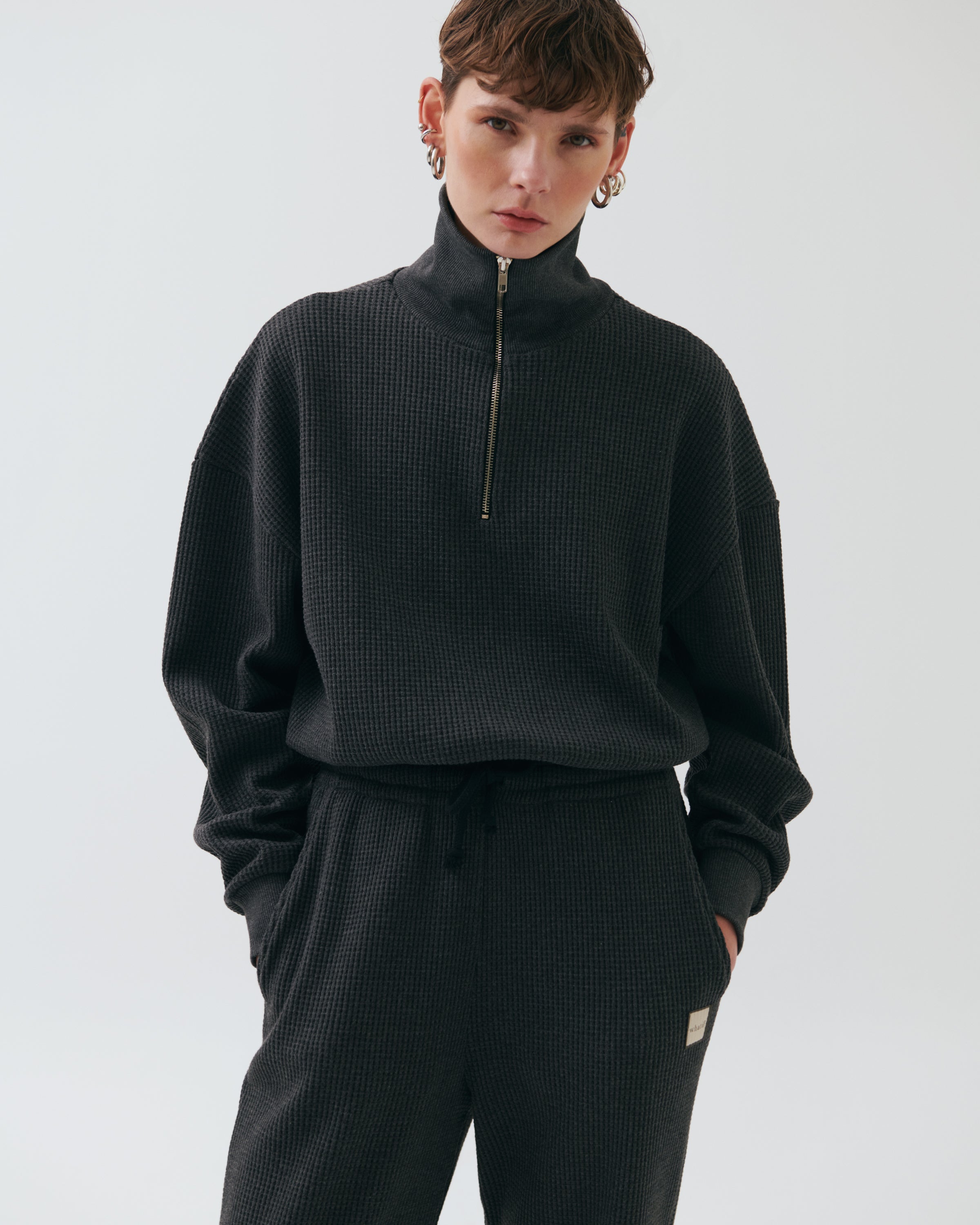 Karin sweatshirt gofreli yüzeyiyle modern ve dinamik bir görünüm sunar. Yarı fermuarlı formu ile kolay kullanım sağlar ve farklı stillere uyum gösterir. Kabartmalı manşet ve yakası tasarıma güçlü bir karakter kazandırır. Alt kenarındaki ayarlanabilir tünel detay sayesinde ürün formu tercihe göre daraltılabilir veya serbest bırakılabilir. Konfor ve işlevselliği aynı anda sunan bu sweatshirt hem günlük kullanım hem de stil sahibi kombinler için ideal.