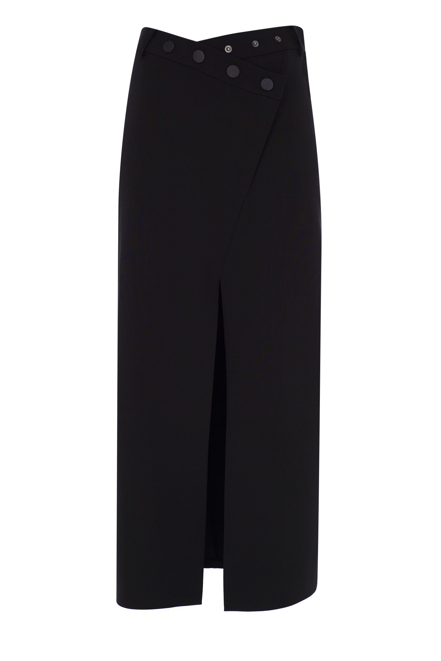 Asimetrik Düğme Detaylı Siyah Etek minimalist tarzı ve zarif detaylarıyla öne çıkıyor. Yüksek belli yapısı mükemmel bir şekilde sararken önden yırtmaç detayı hem hareket kabiliyeti hem de kadınsı bir dokunuş katıyor. Asimetrik kesim ve ön yüzeydeki düğme detayları eteği benzersiz kılarak her ortama uygun modern bir görünüm sunar. Arka kısmındaki sade ve düz tasarım ise genel şıklığını zarif bir şekilde tamamlıyor.