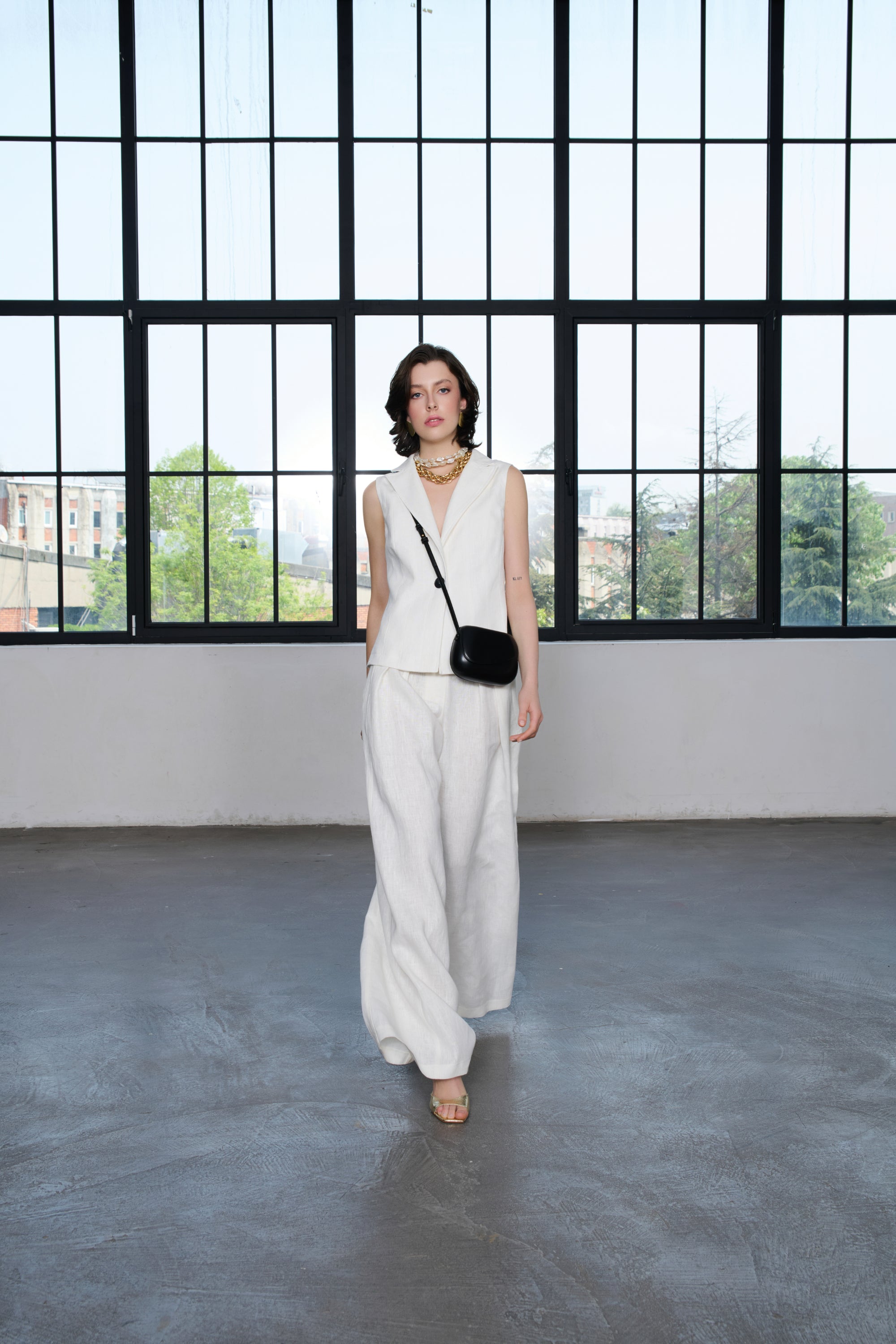 Hem stile hem de konfora önem verenler için tasarlanan bu zarif keten pantolon gardırobunuzun özel ve dikkat çeken parçalarından biri olmaya aday. Düşük bel kesimi ve geniş paçalı siluetiyle modern rahat ve iddialı bir görünüm sunar. %100 organik keten kumaşı nefes alabilir yapısıyla sıcak havalarda serinlik sağlar. Ön kısımdaki pile detayı ve el işçiliğiyle yapılmış puntolu nakışlar tasarıma özgün ve incelikli bir karakter kazandırır