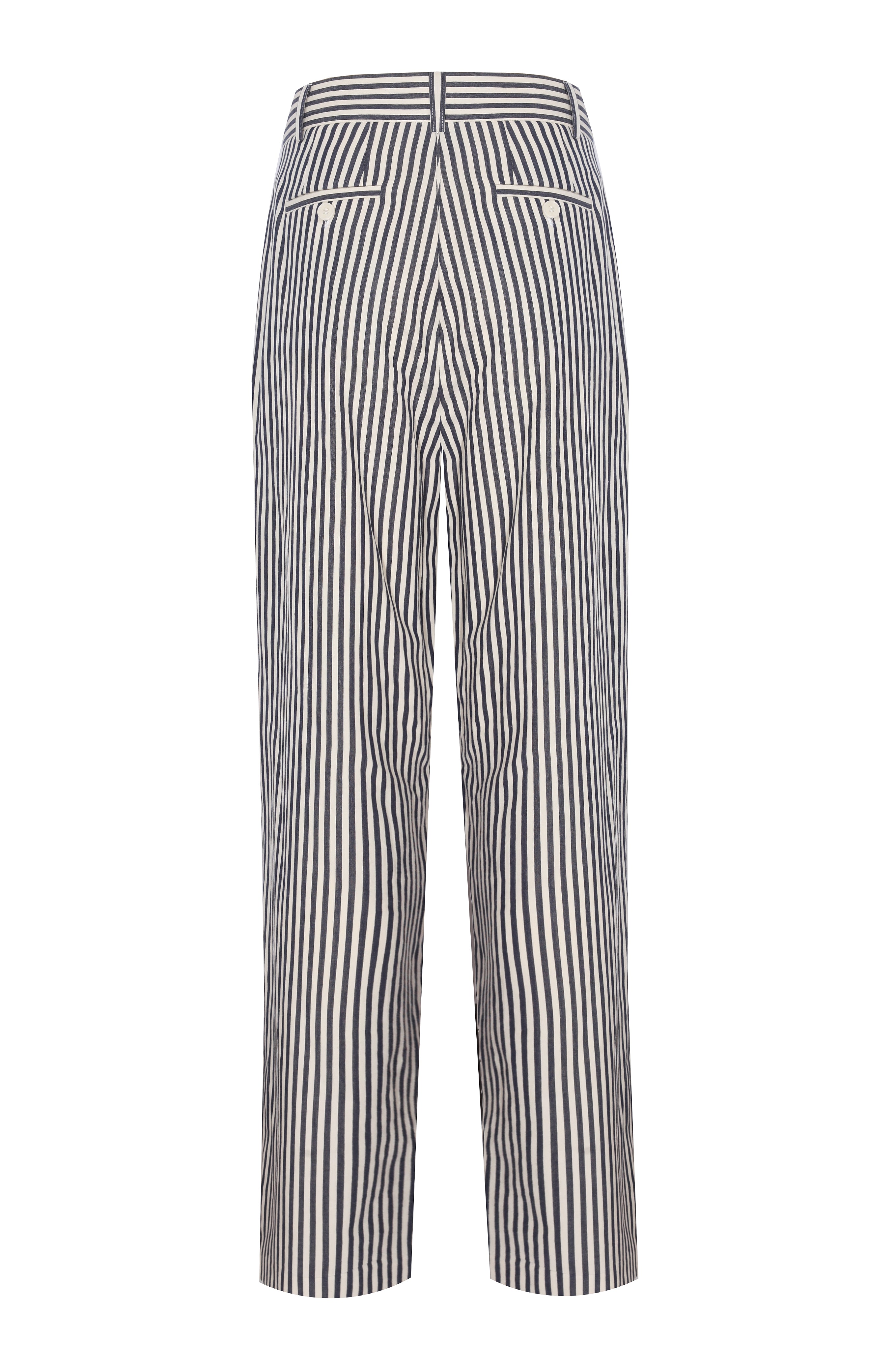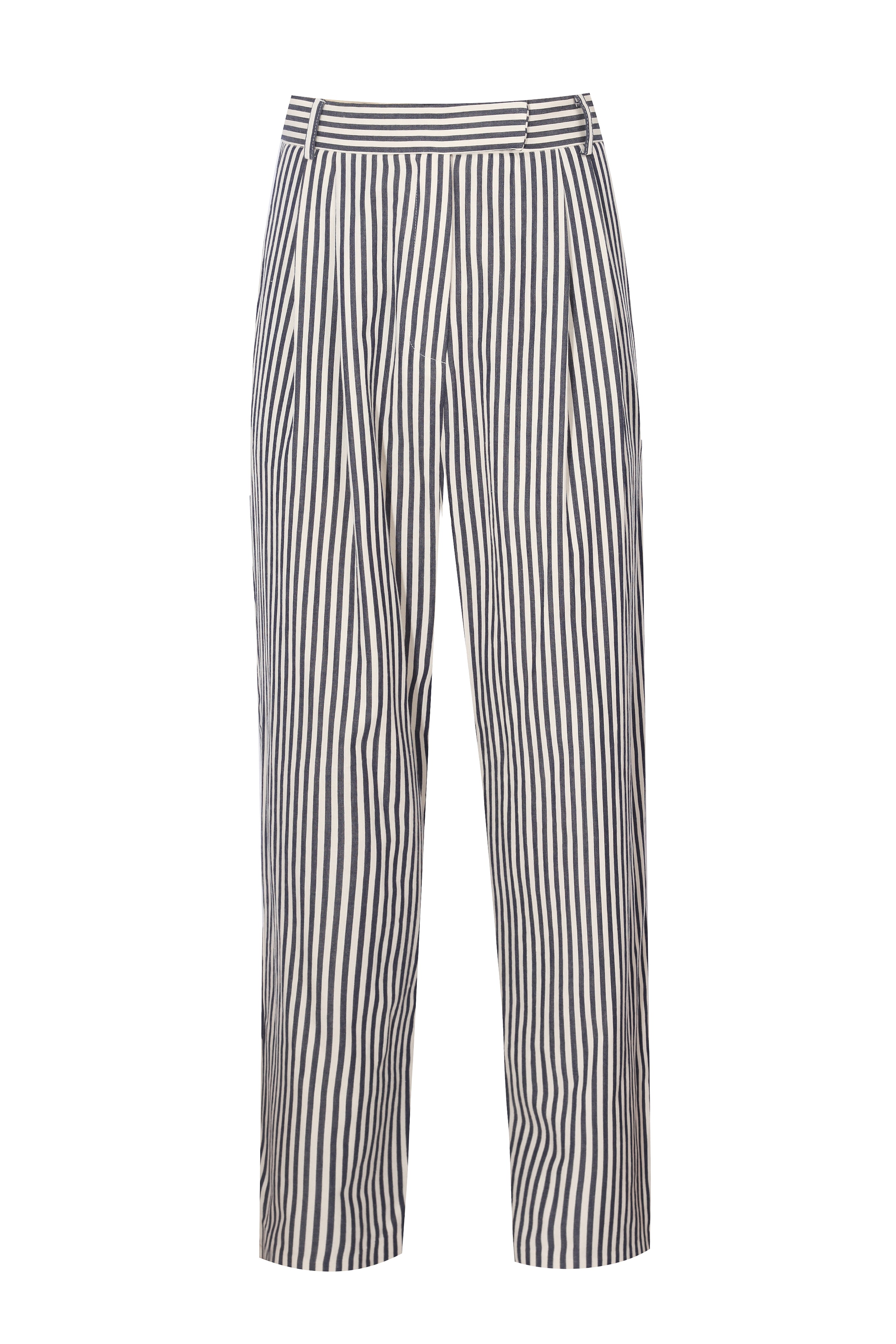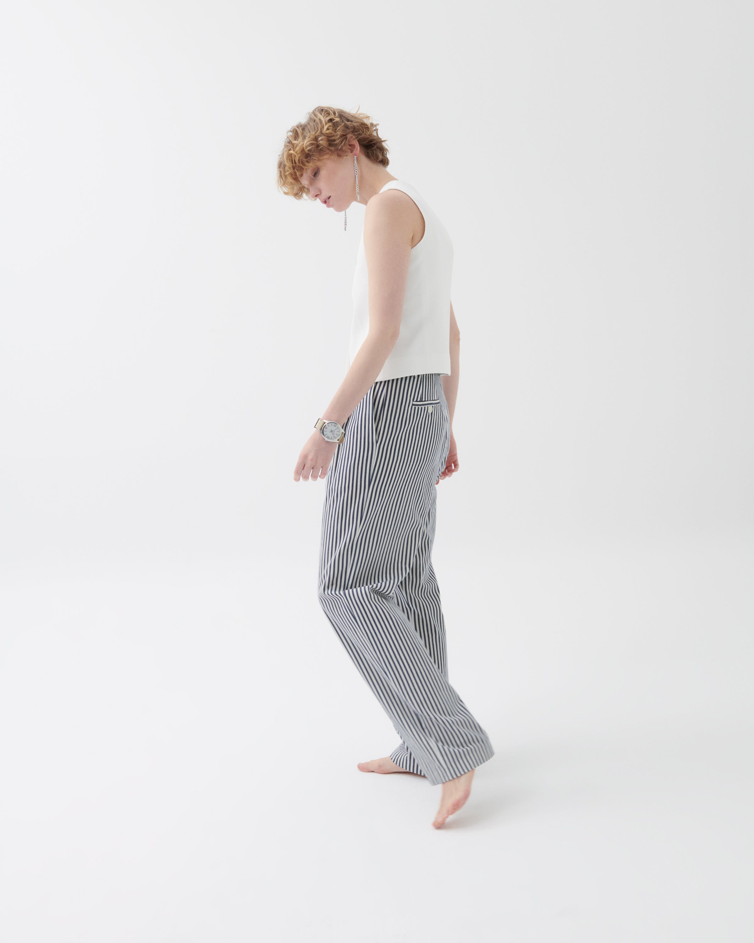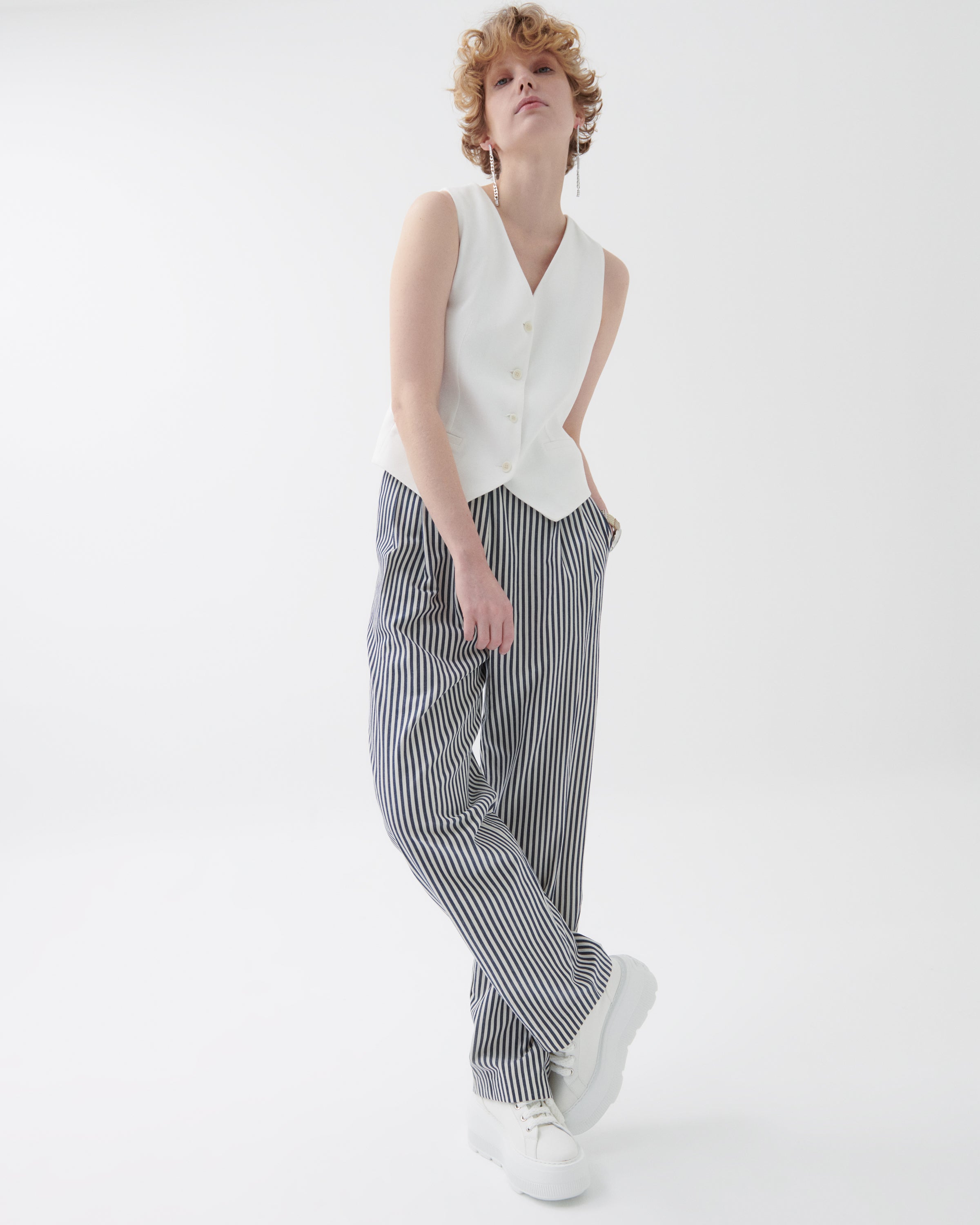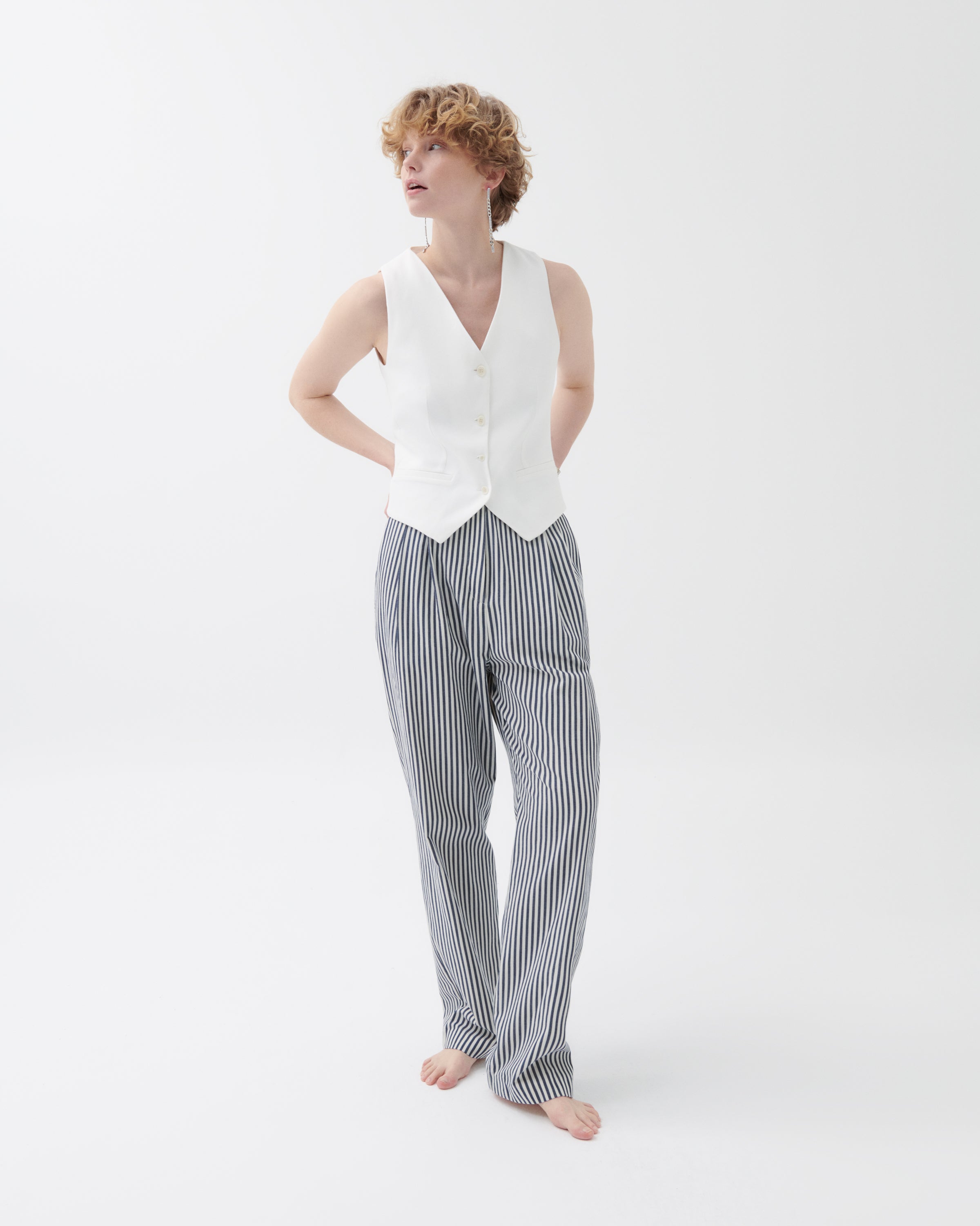 Lacivert ve ekru renk bloklarıyla tasarlanan bu önden pilili pantolon, modern şehir stilini zarif ayrıntılarla buluşturuyor. Kavisli formül ve yüksek bel bölümüyle sağlanan sıradan bir oturuş sağlarken, doğal pamuk ve yün karışımlı kumaşı sayesinde hafif sıcaklık ve konfor sunar. Mevsim geçişlerinde hem şık hem de kullanışlı bir seçenektir.