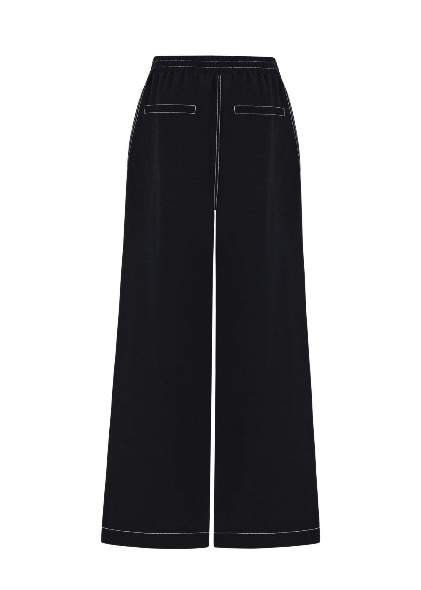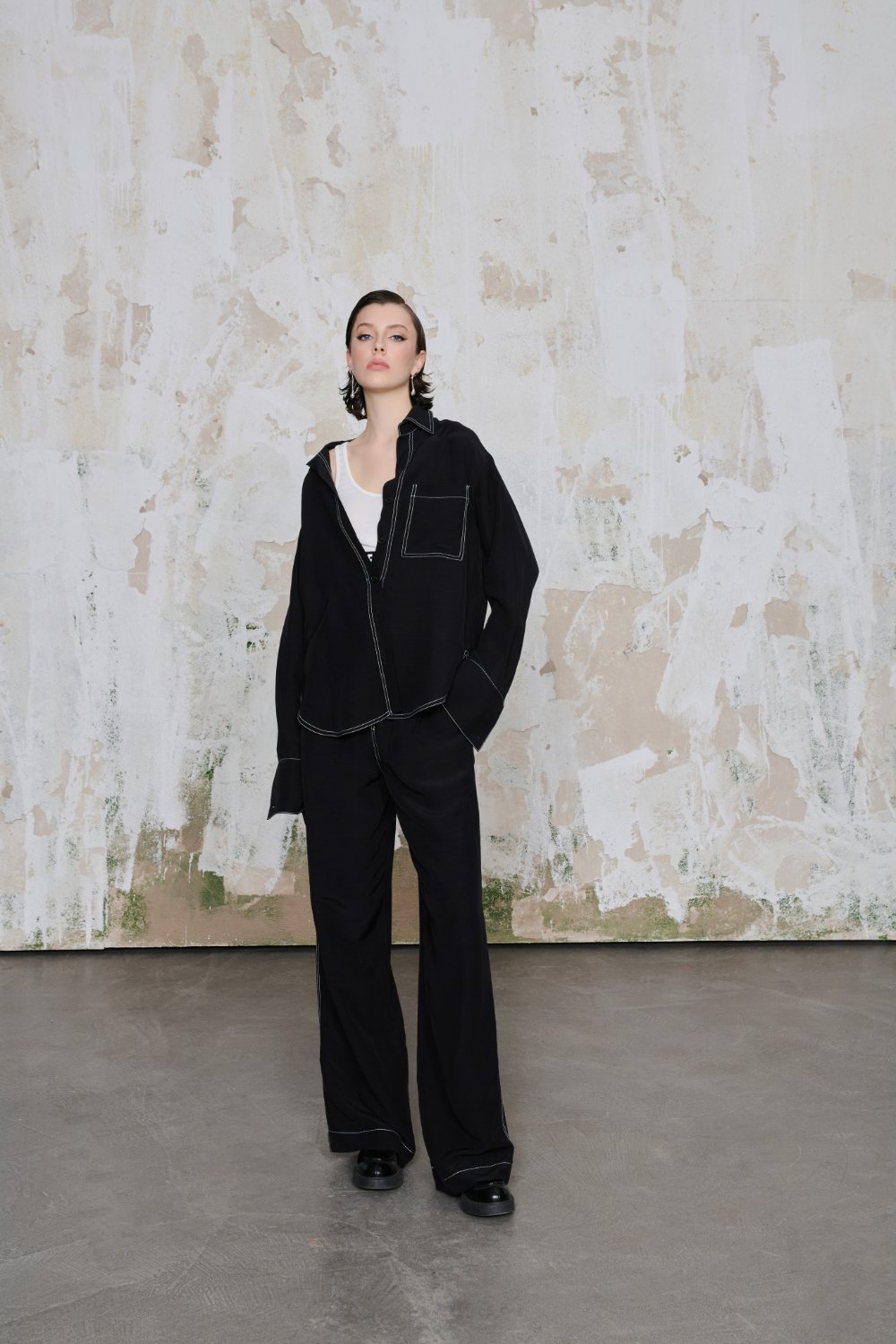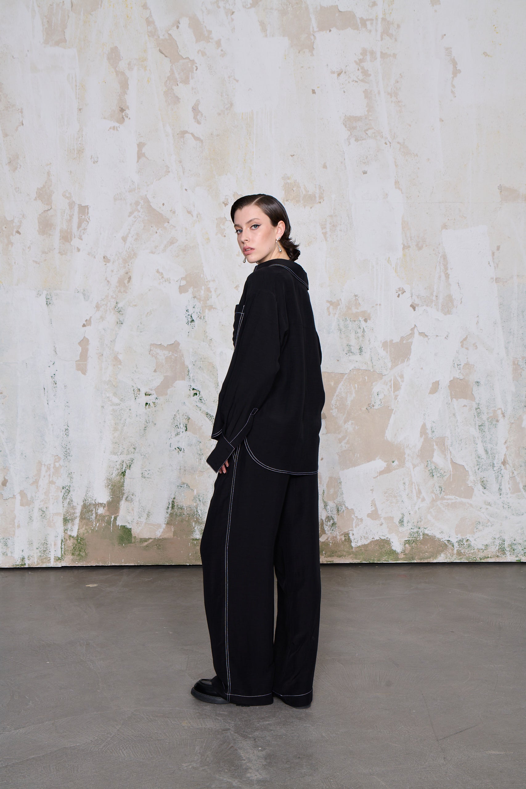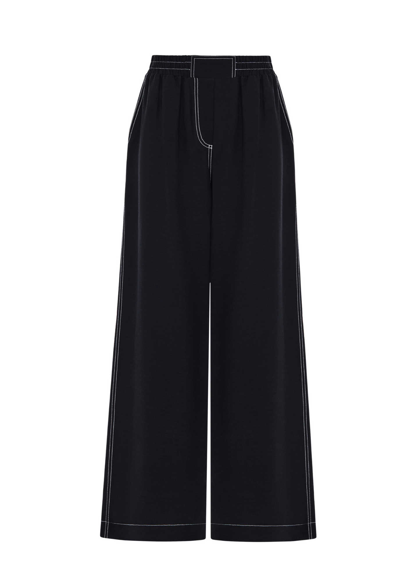 WhatIfBrand’ın Noaor Pantolonu, minimal çizgilerle tasarlanmış zamansız bir görünüm sunar. Siyah zemin üzerindeki beyaz kontrast dikişler modern bir duruş katarken, geniş paça kesimi rahat ve akıcı bir siluet yaratır. Bel kısmındaki lastik detayı gün boyu konfor sağlarken, viskon-keten karışımlı kumaşı hafifliği ve dayanıklılığı bir araya getirir. Günlük şehir stilinden ofis kombinlerine kadar her ortama uyum sağlar.