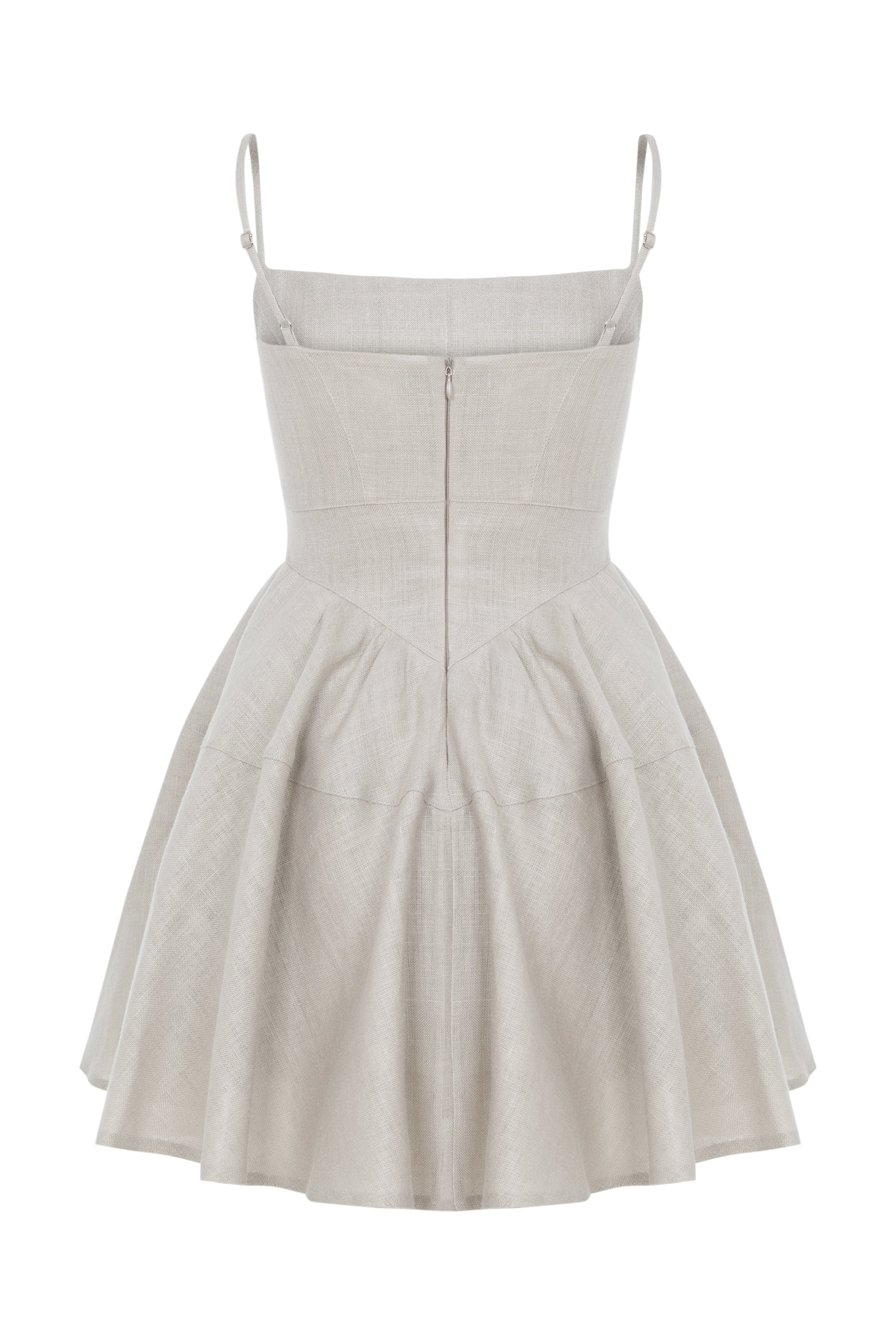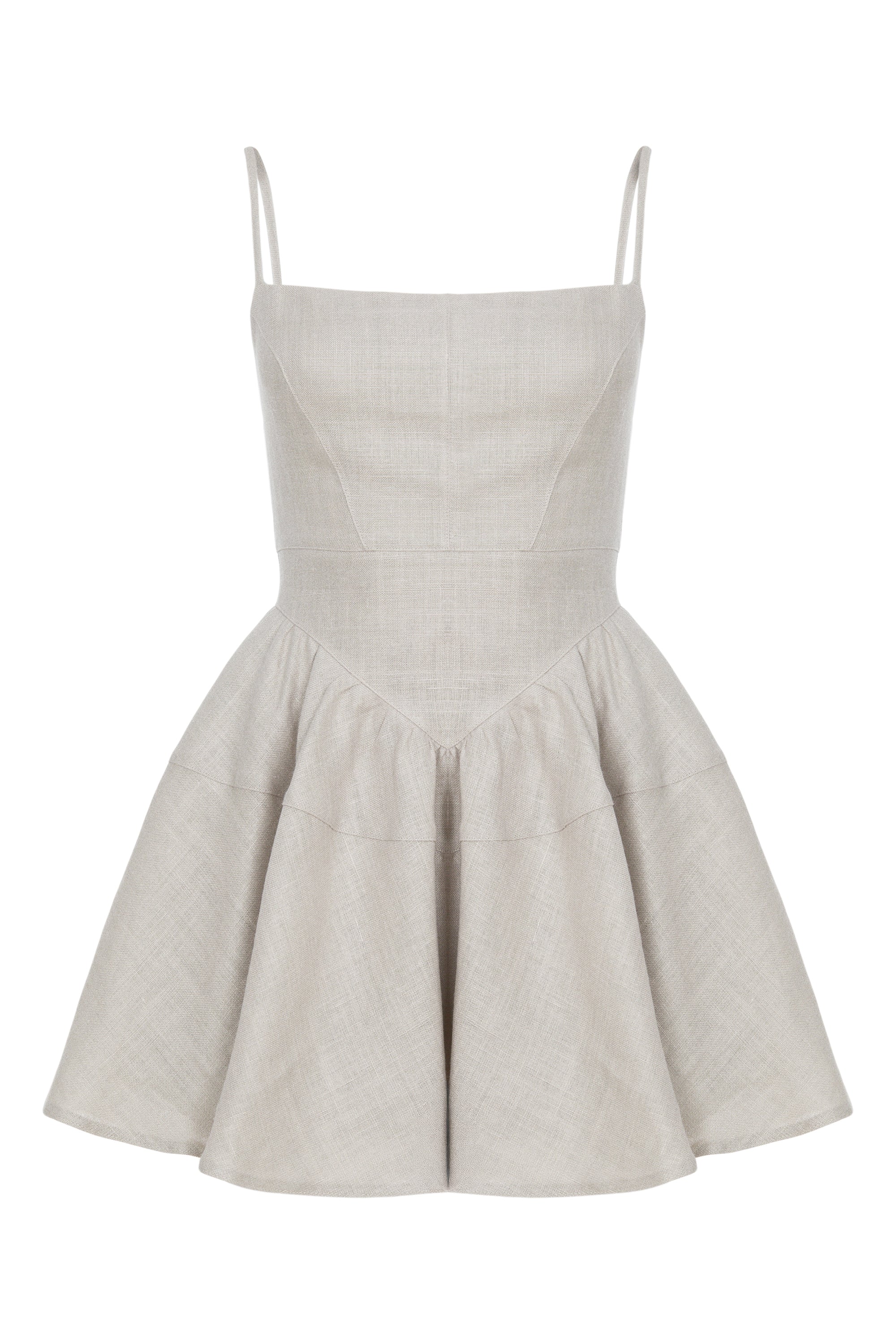 Minimal çizgilerle romantik bir siluet sunan bu mini elbise, zarif detayları ve doğal yapısıyla dikkat çeker. İnce askılı üst bölümü feminen bir duruş sağlarken, kloş eteği hareket özgürlüğü ve zarafet katar. Bel kısmındaki V formu, silueti zarifçe vurgular ve incelik hissi yaratır.