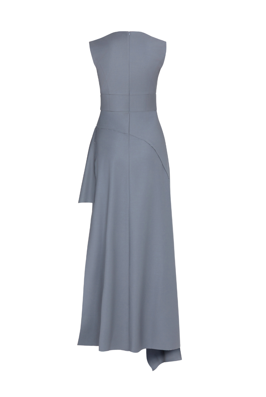 Minimalist zarafeti güçlü bir duruşla buluşturan bu elbise asimetrik etek formuyla modern bir siluet sunar. Bel hattındaki dikişler vücudu zarifçe sararken dökümlü etek yapısı elbiseye akıcı bir hareket kazandırır.Kolsuz tasarımı ve net çizgileriyle sade ama etkileyici bir görünüm sunar. Asil gri tonu sayesinde hem gündüz hem gece davetlerinde şıklığınızı tamamlar