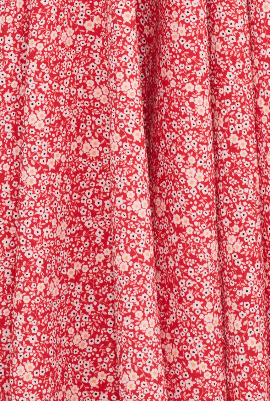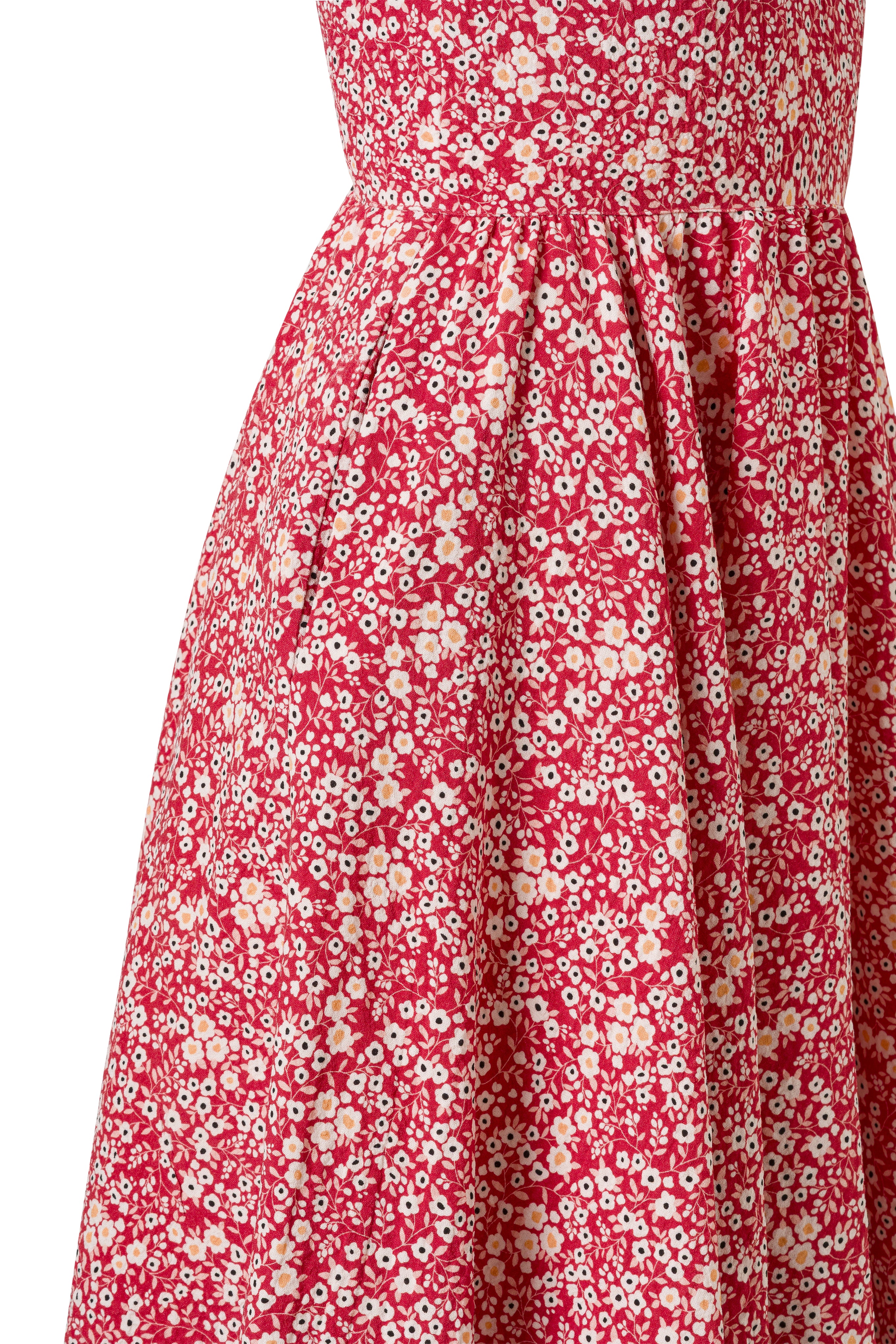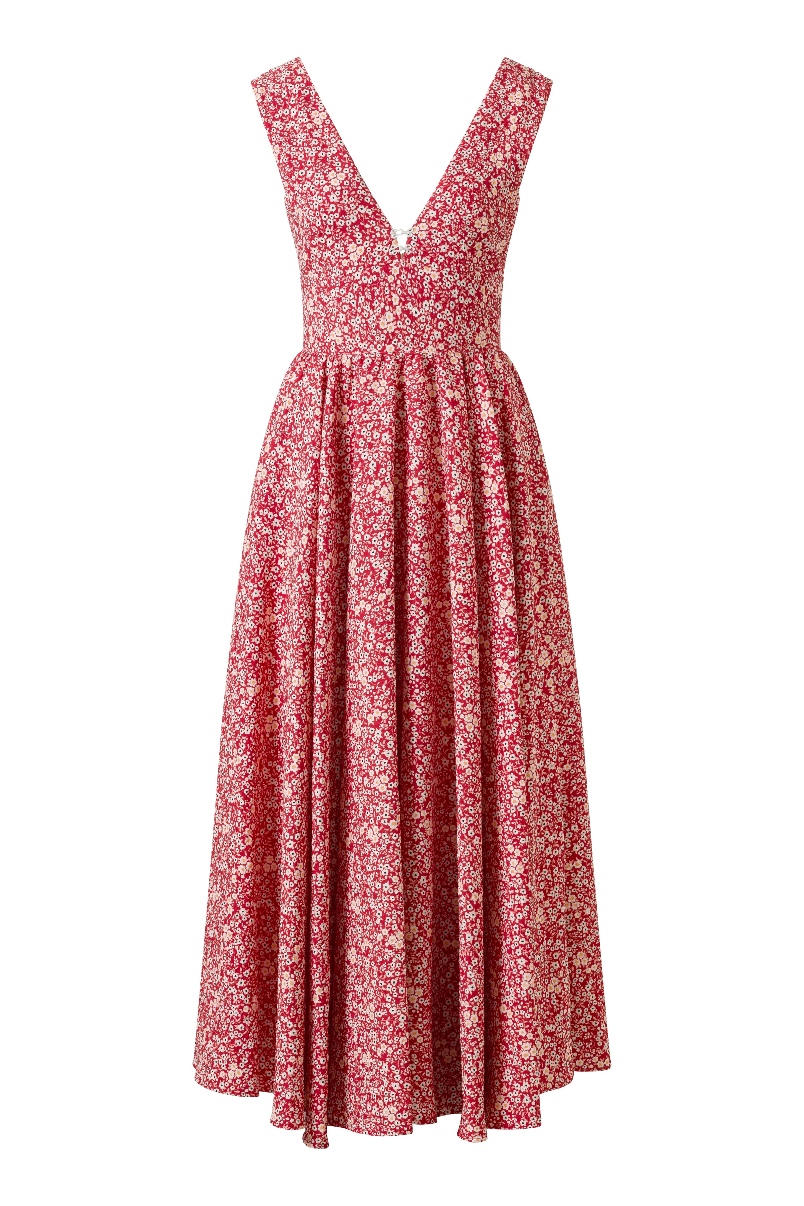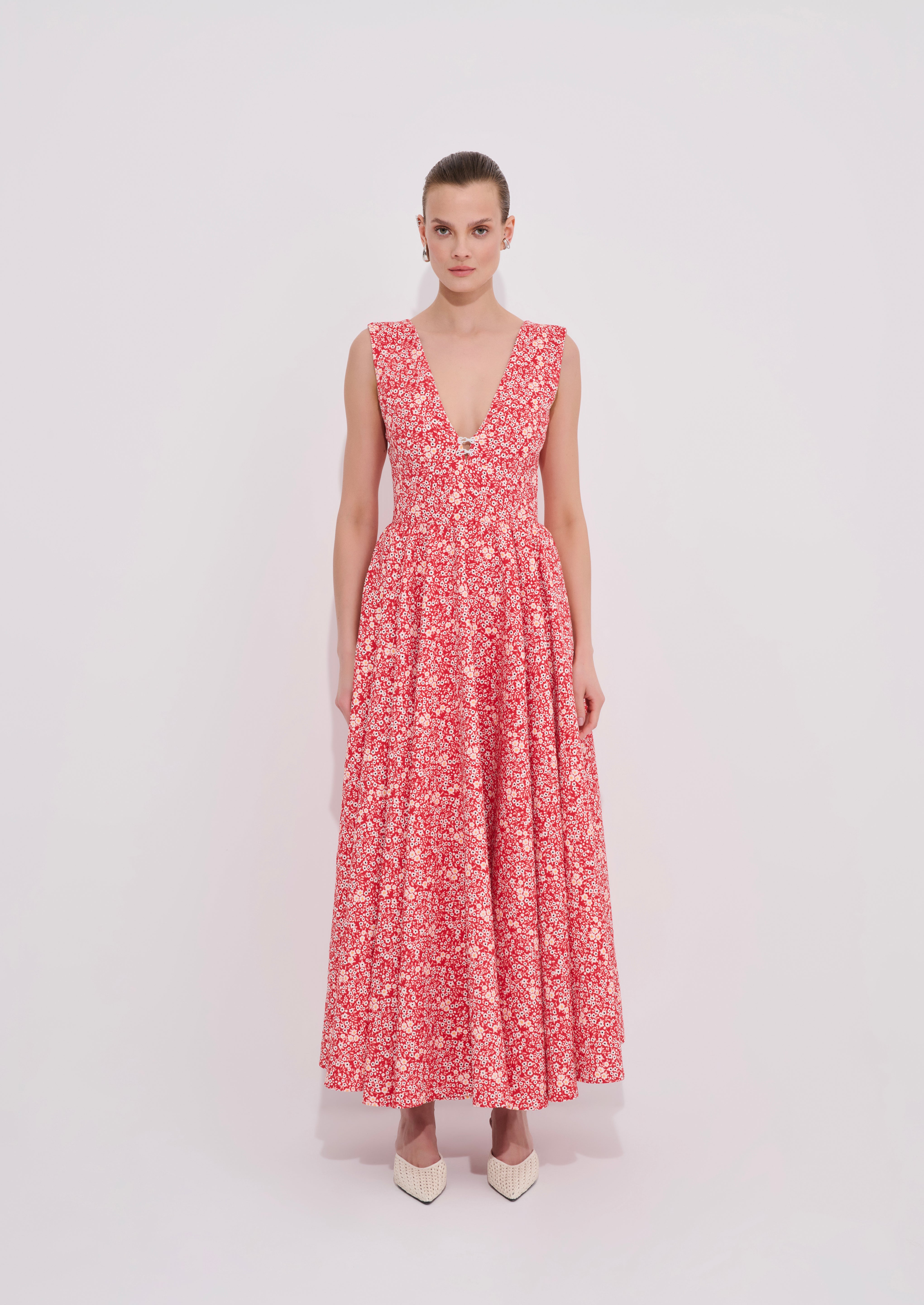 Canlı kırmızı zemin üzerine beyaz ve sarı küçük çiçek desenleriyle tasarlanan bu elbise yaz stiline enerji katar. Üst kısmı vücuda oturan formda tasarlanırken 360 derece dönebilen kloş eteğiyle akıcı ve zarif bir hareket sunar. Derin V yaka ve ortadaki metal aksesuar feminen detaylarla modern çizgiyi bir araya getirir.