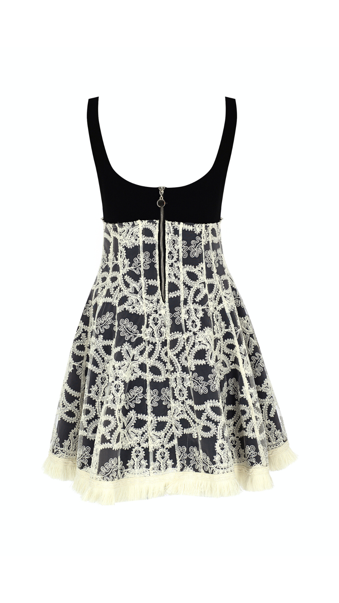 Dantel Detaylı Siyah Elbise sofistike dantel işlemeleri ve modern tasarımı ile zarafeti ve feminenliği buluşturuyor. Üst kısımdaki siyah ve alt kısımdaki beyaz dantel detayları güçlü bir kontrast oluşturarak elbiseye göz alıcı bir etki katıyor. Etek kısmında yer alan püskül detayları hareket özgürlüğü sunarken zarif bir dokunuş sağlar. Arka kısmındaki fermuar detayı ise hem pratiklik hem de estetik bir görünüm kazandırır. Bu elbise her özel etkinlikte sofistike ve feminen bir stil sunmak isteyenler için ideal bir seçimdir.
