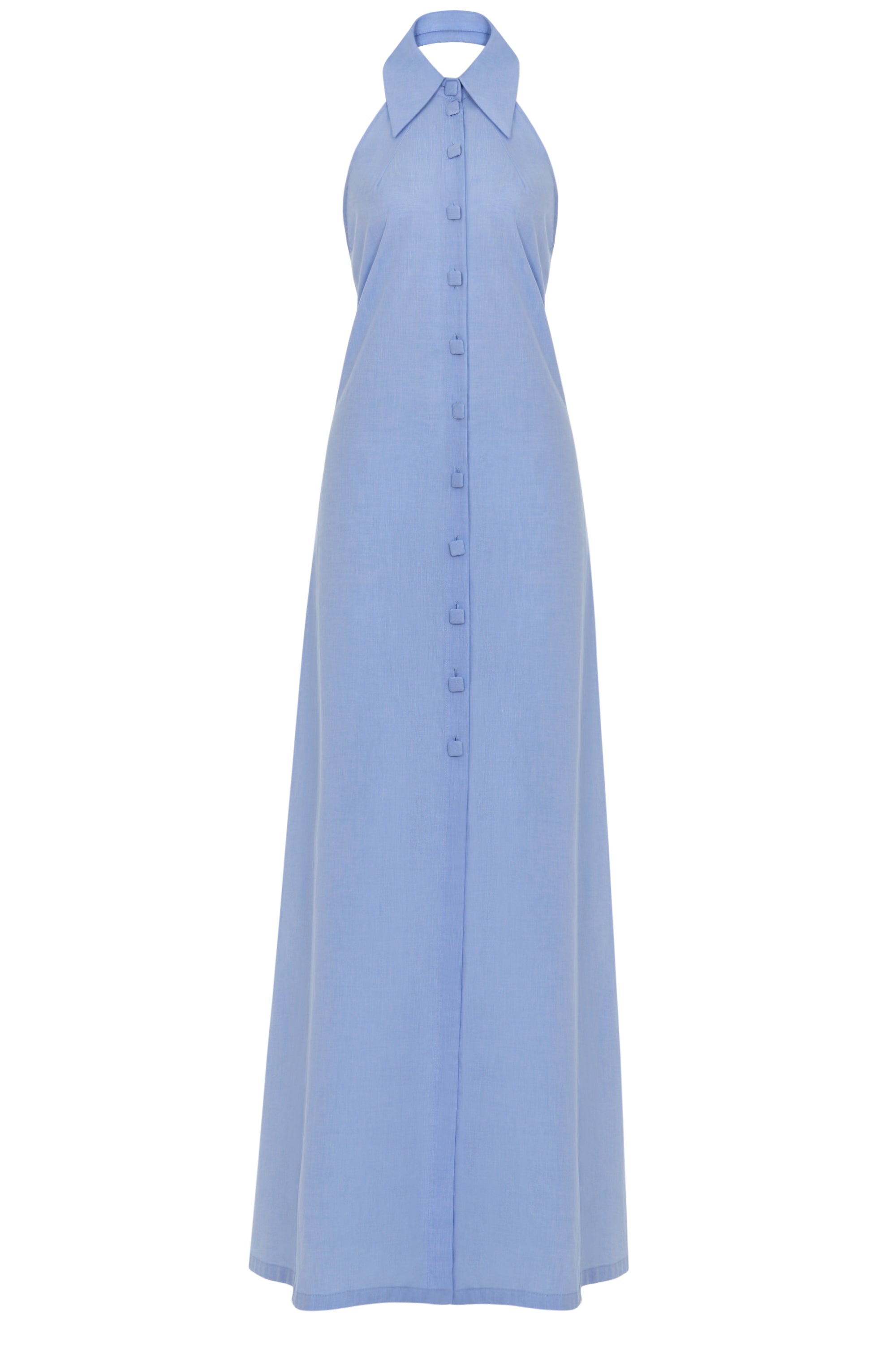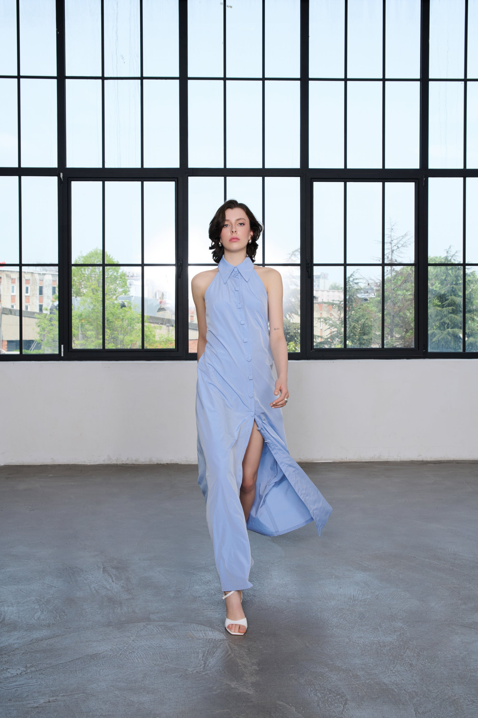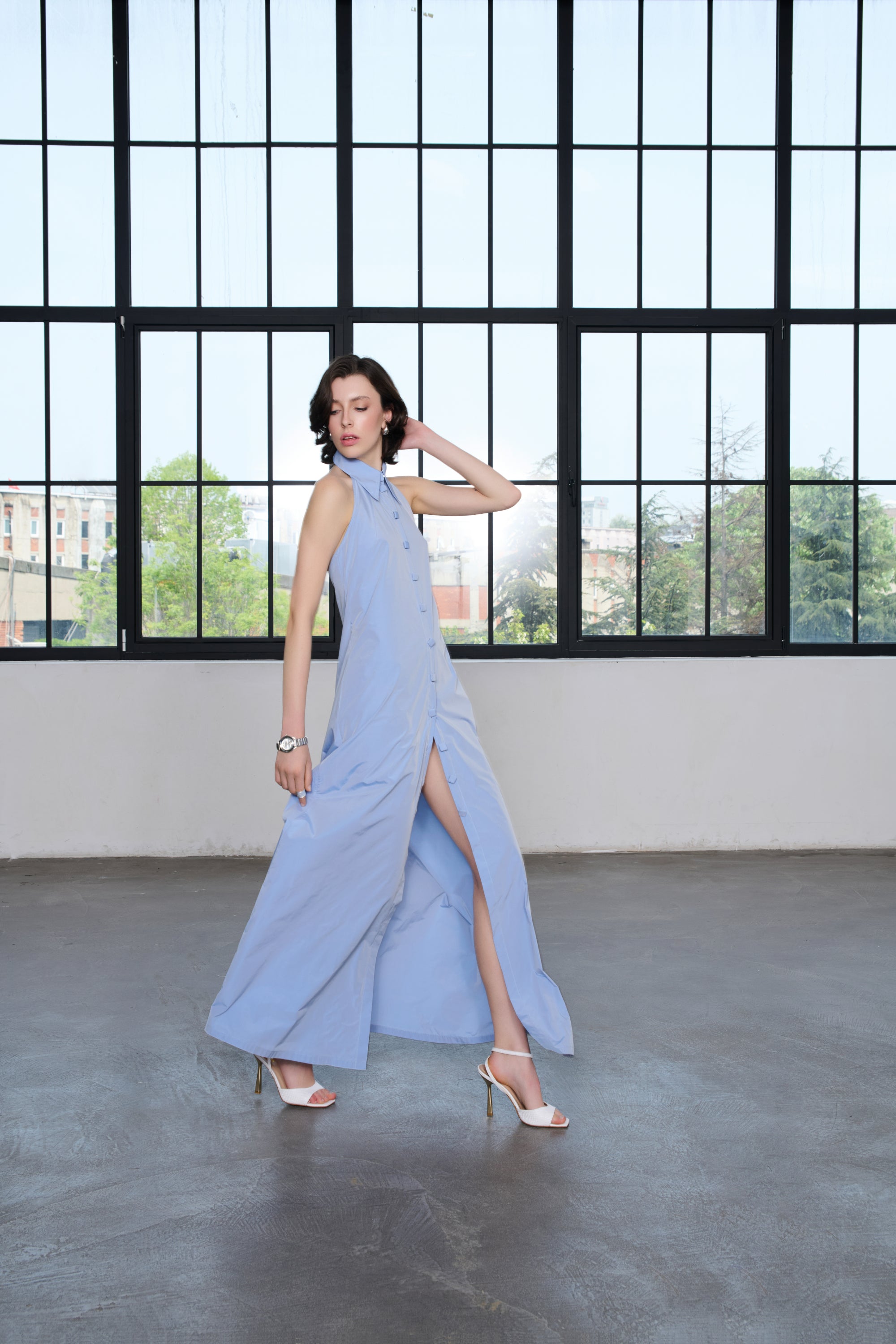 Açık mavi tonuyla ferah bir yaz görünümü sunan bu elbise, modern kesimi ve cesur detaylarıyla öne çıkıyor. Yüksek yakasıyla zarif bir duruş sunarken, tamamen açık sırt detayı ile güçlü ve feminen bir siluet yaratır. Öndeki uzun düğme sistemi ve yüksek yırtmaçlı etek tasarımı elbiseye hareket ve akıcılık kazandırır. Yaz davetlerinden şehir içi akşamlarına kadar her an için ideal bir tercih.