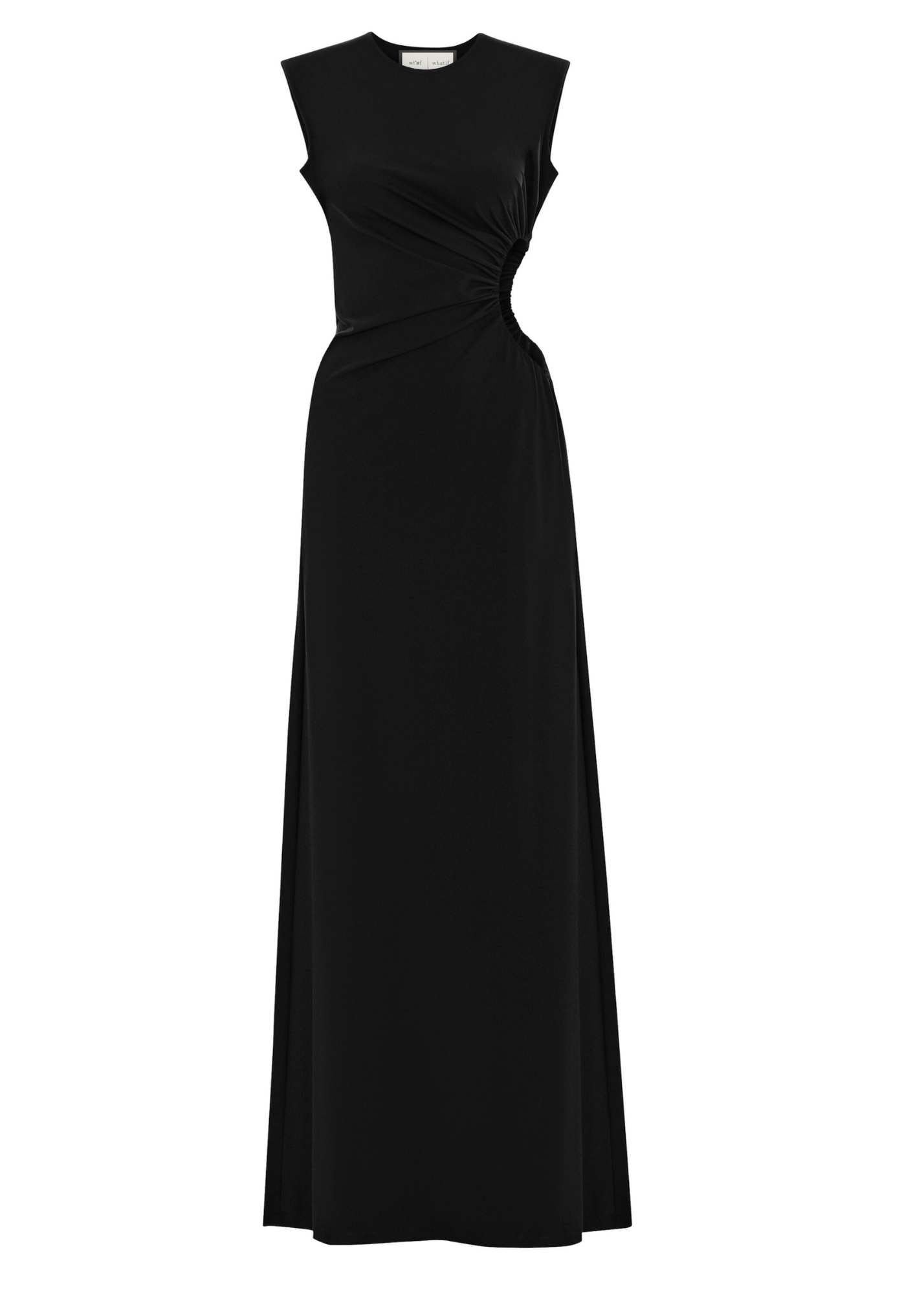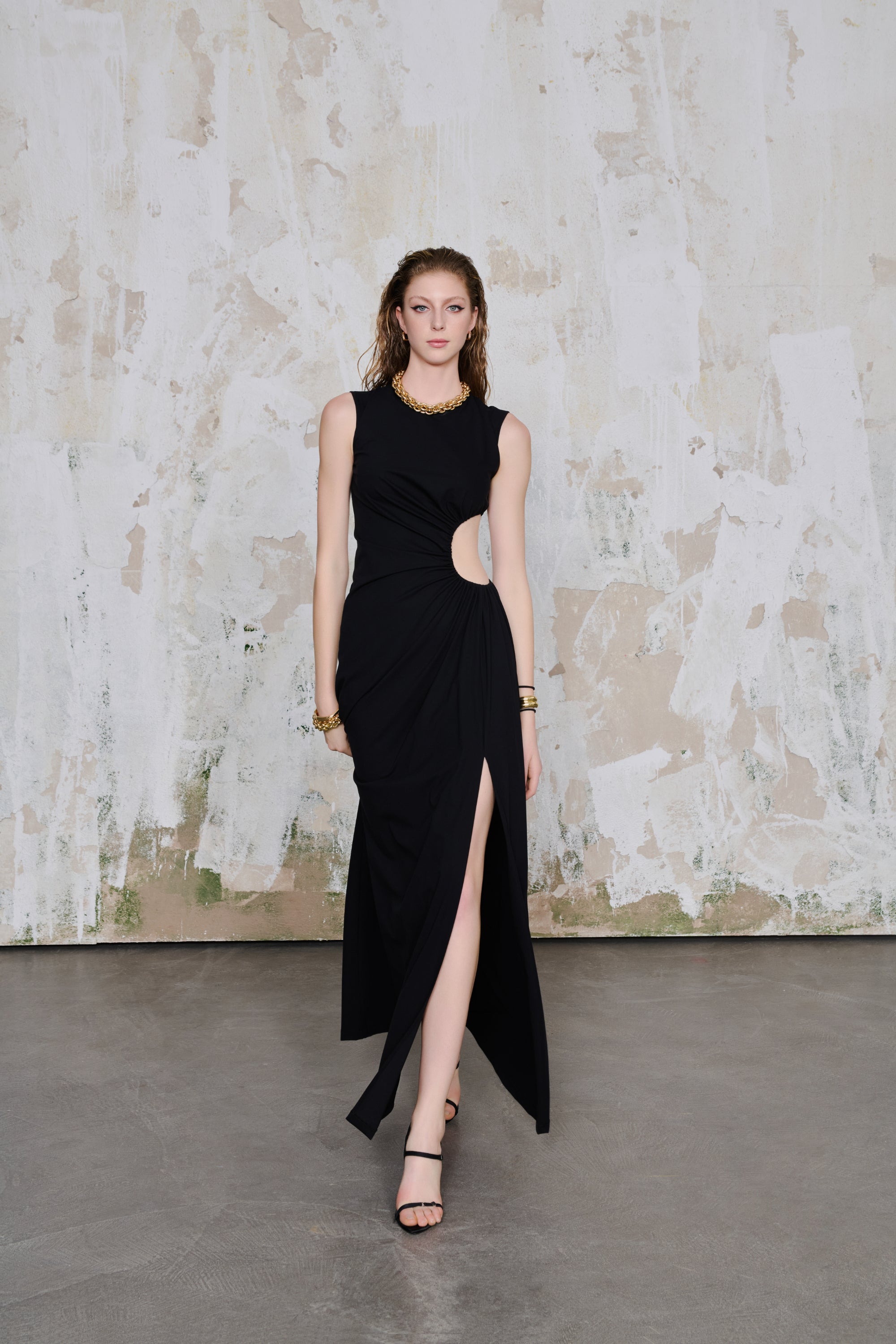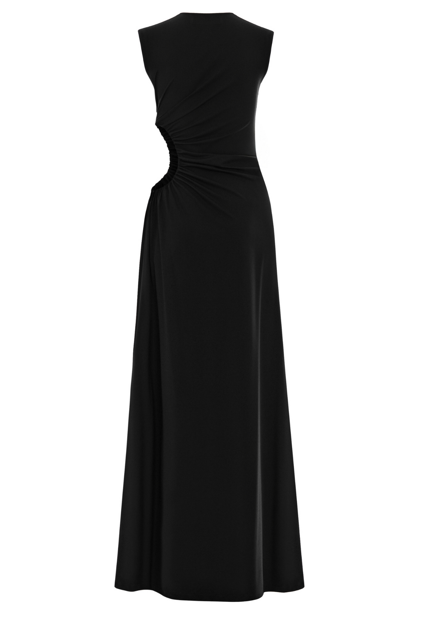 • Model: Yanı büzgülü, asimetrik kesimli uzun elbise