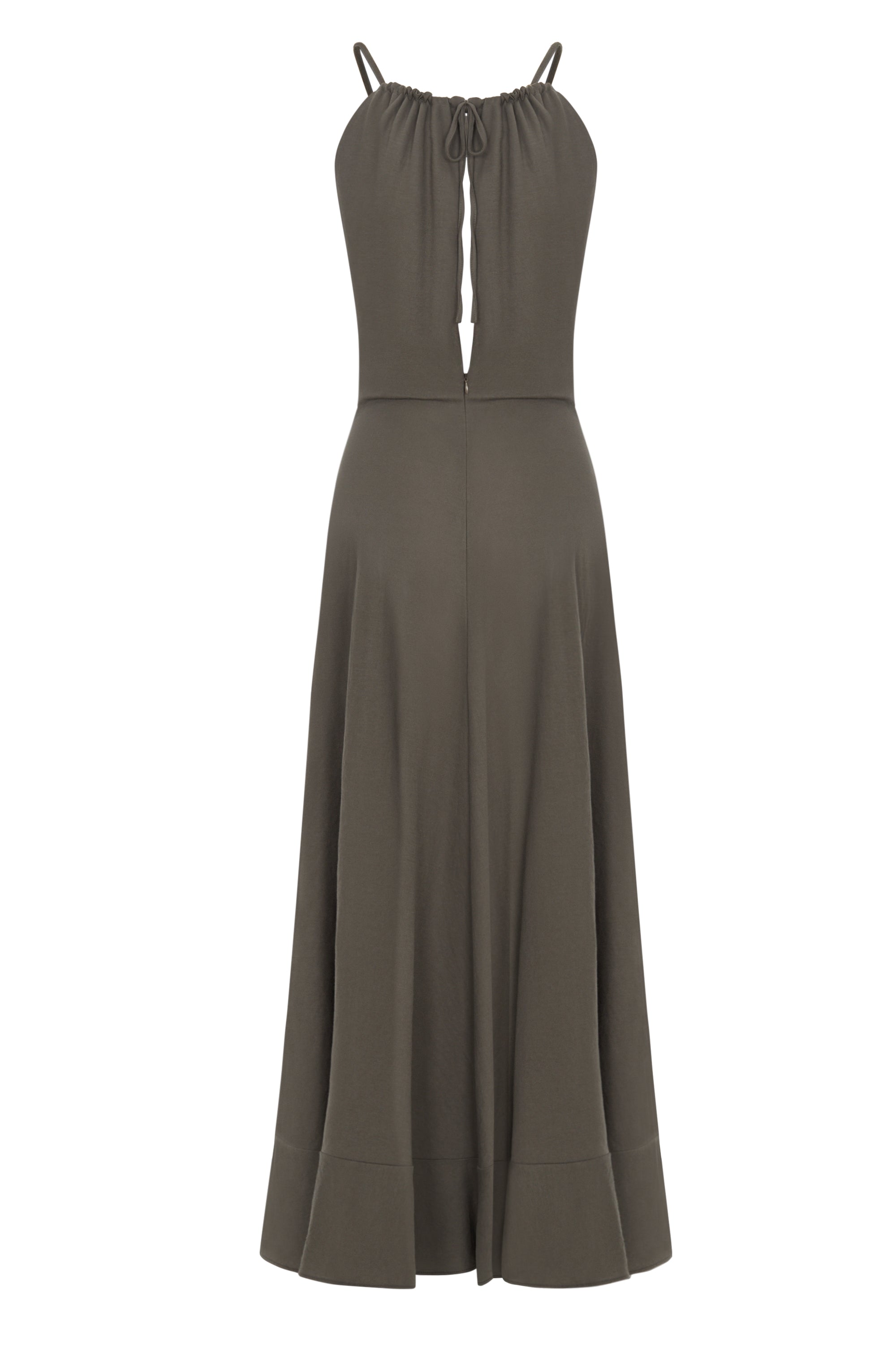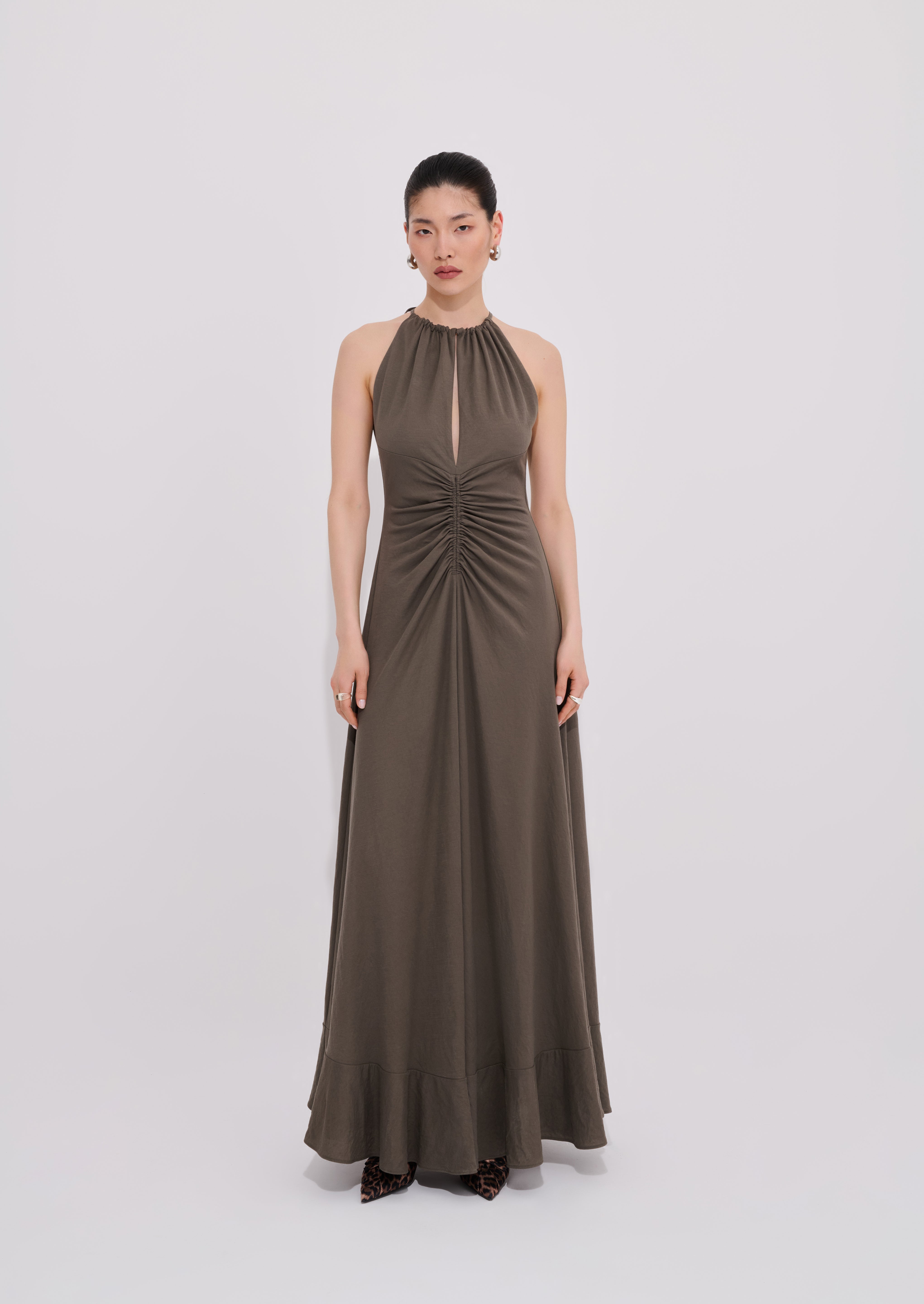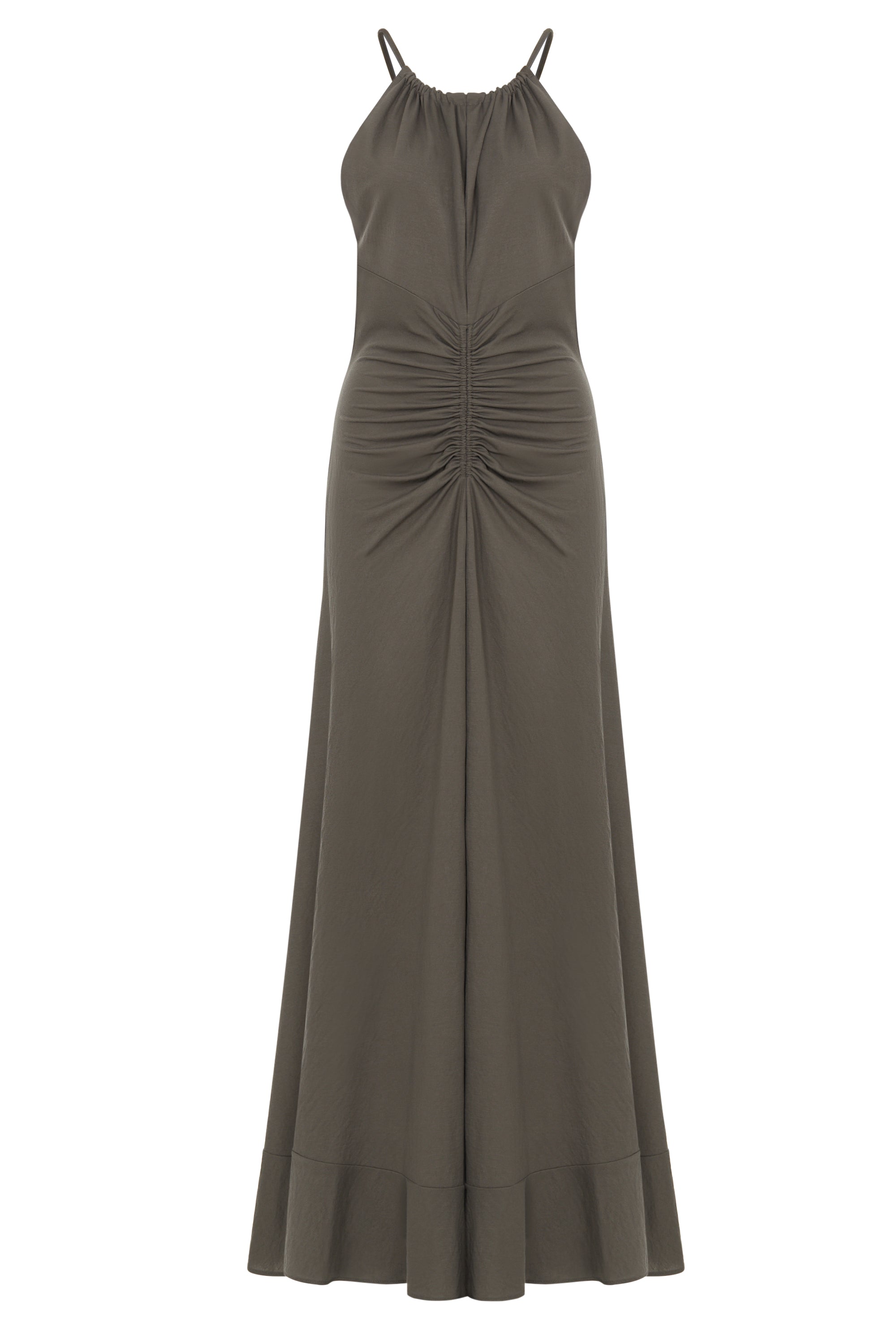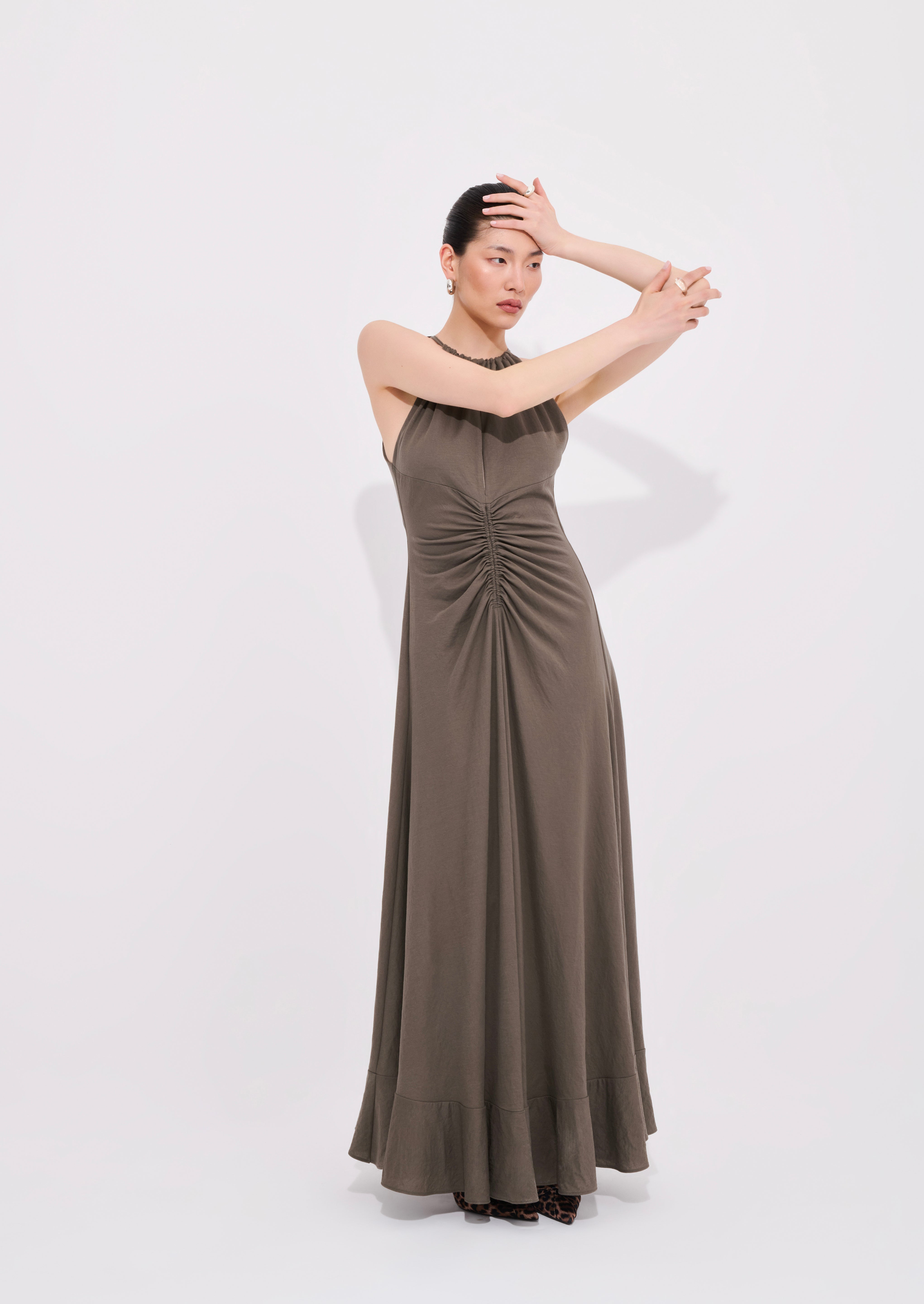 Dökümlü yapısıyla sade ama etkileyici bir duruş sergileyen bu elbise modern tasarımıyla zarif bir siluet sunar. Yüksek yaka ve sırt dekoltesiz kesimi ile farklı bir görünüm  oluştururken bel kısmındaki toplanma detayı elbiseye doğal bir hareket kazandırır.