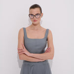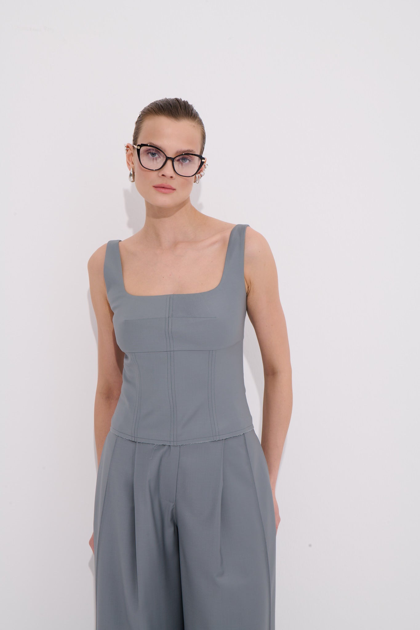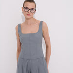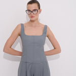 Kare yaka detayı ve belirgin dikiş çizgileri silueti zarifçe vurgularken kalın askıları ve bele oturan formu vücut hatlarını dengeli bir şekilde ortaya çıkarır. Arka kısımdaki metal fermuar hem işlevsel hem estetik bir tamamlayıcıdır. Asil gri tonu ile sofistike bir etki yaratır ister takım pantolonla ister farklı parçalarla kolayca kombinlenebilir
