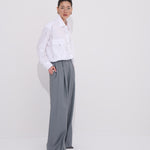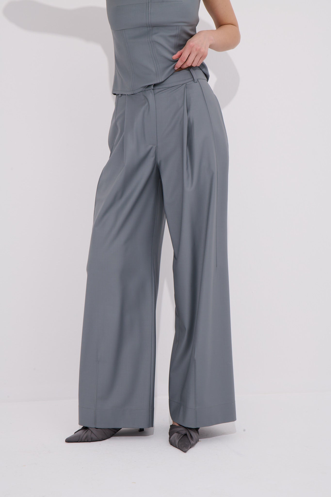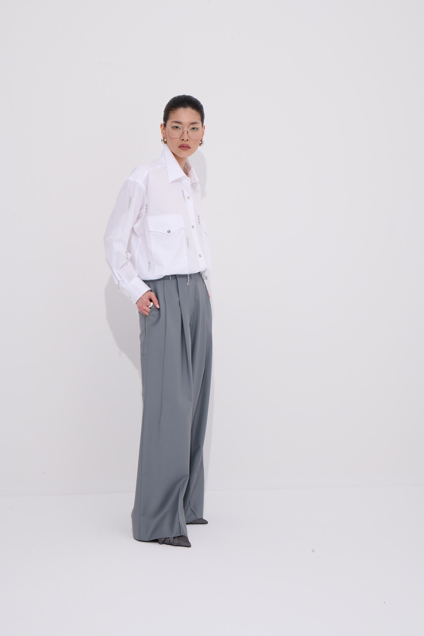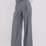 Modern kesimi ve yüksek beliyle dikkat çeken bu pantolon şehirli kadının zamansız gardırobuna güçlü bir dokunuş katar. Ön kısımdaki derin pililer hacimli ancak dengeli bir siluet oluştururken arkadaki büyük cepler hem işlevsel hem de sportif bir görünüm sunar