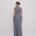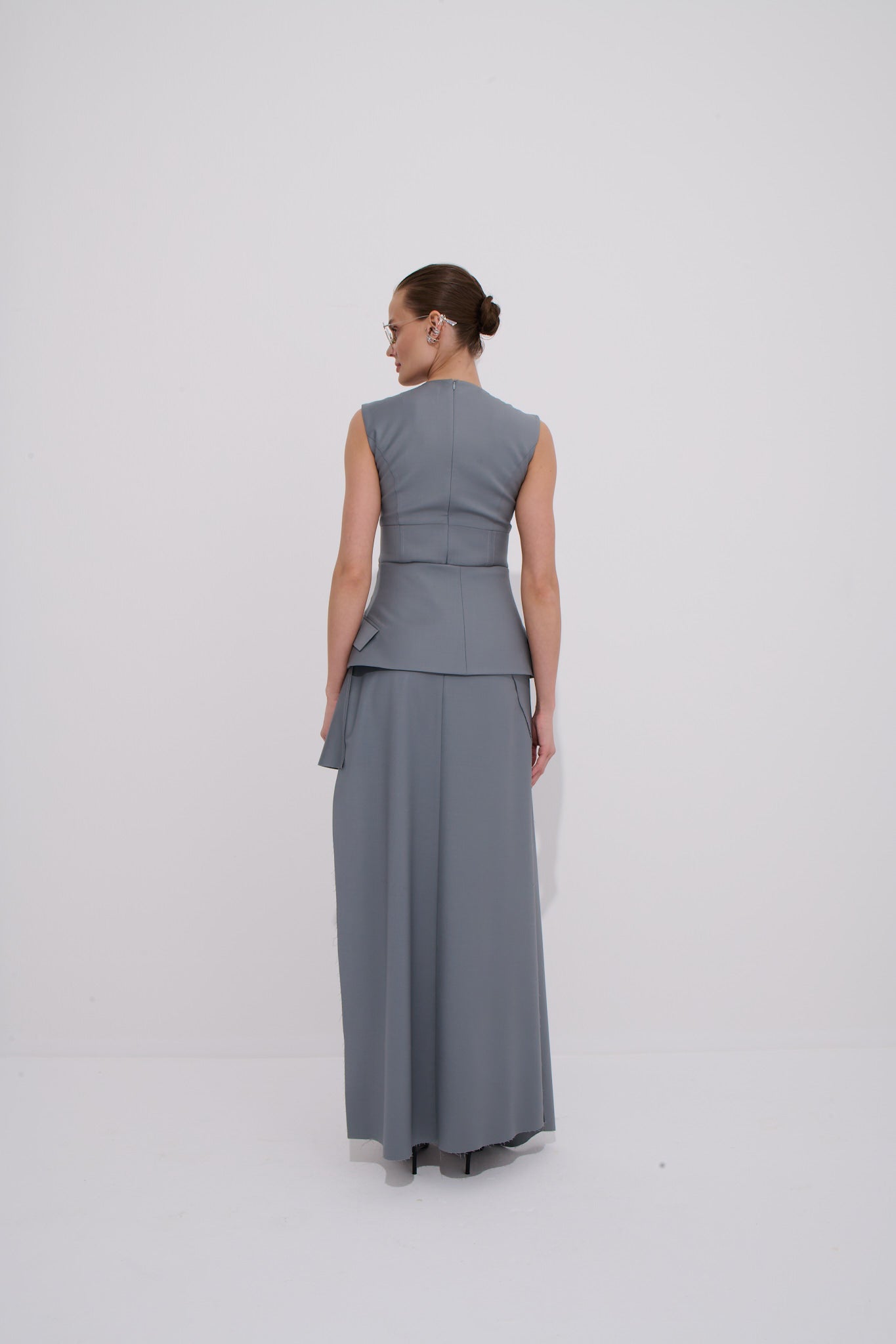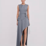 Minimalist zarafeti güçlü bir duruşla buluşturan bu elbise asimetrik etek formuyla modern bir siluet sunar. Bel hattındaki dikişler vücudu zarifçe sararken dökümlü etek yapısı elbiseye akıcı bir hareket kazandırır.Kolsuz tasarımı ve net çizgileriyle sade ama etkileyici bir görünüm sunar. Asil gri tonu sayesinde hem gündüz hem gece davetlerinde şıklığınızı tamamlar