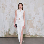 Asimetrik Beyaz Etek, yalın ve zarif tasarımını güçlü kesim detaylarıyla tamamlıyor. Yüksek belli yapısı sayesinde vücudu nazikçe sararken, ön yüzünde yer alan kavisli asimetrik yırtmaç feminen bir dinamizm katıyor. Tok duruşlu örme toparlayıcı kumaşı hem esnek hem de formunu koruyan yapısıyla gün boyu rahatlık sağlarken, arka cep detayları klasik dokunuşlar sunar. Modern şehir kadınının gardırobunda öne çıkacak bu parça, sade beyaz rengini güçlü bir siluetle buluşturur.