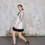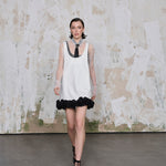Alia Volan Detaylı Mini Elbise, sade formuna rağmen güçlü bir duruş sergileyen özgün bir tasarımdır. Akıcı ve tok yapılı beyaz kumaşı, vücuda yapışmadan dökülerek zarif bir siluet sunar. Etek ucunda yer alan siyah volan detayları, elde şekillendirilmiş dekoratif güllerle süslenmiştir. Bu el işçiliği sayesinde elbise hem sanatsal hem de sofistike bir etki yaratır. Arkasında derin V formu bulunan sırt detayı ise feminen şıklığı tamamlar. Günlük kullanımda sade parçalarla dengelenebilirken, davetlerde iddialı aksesuarlarla kombinlendiğinde etkileyici bir görünüm sağlar.