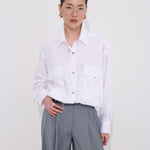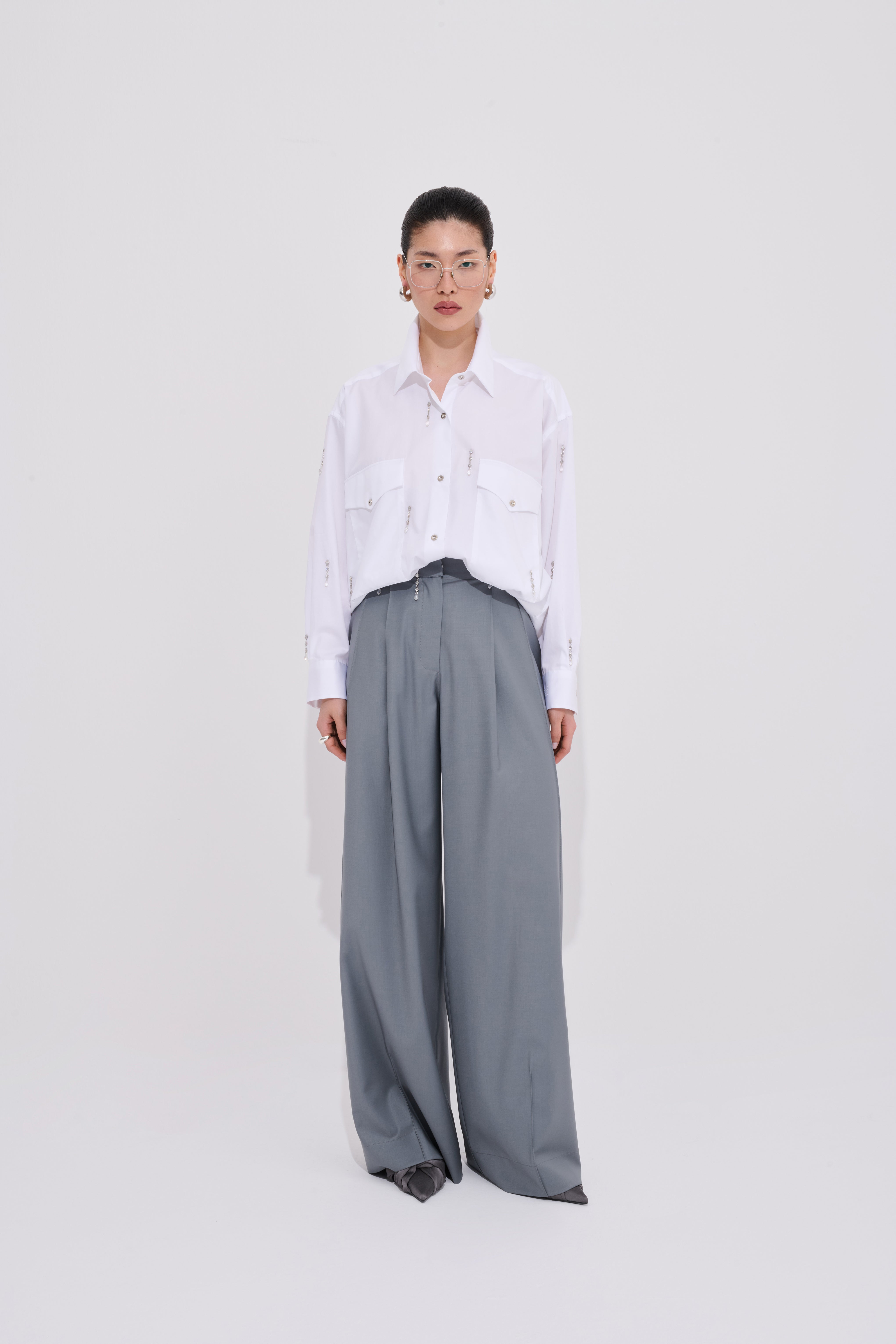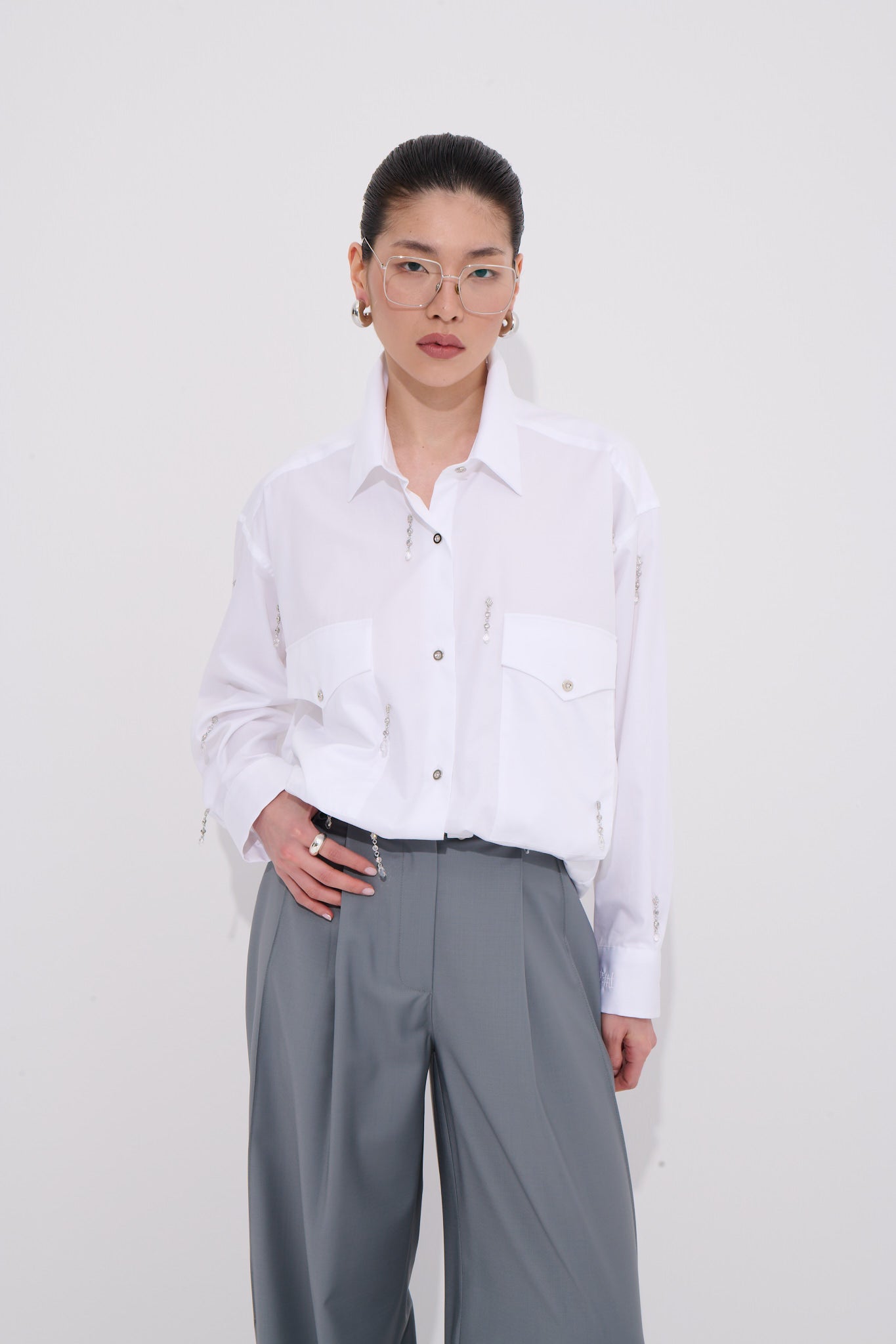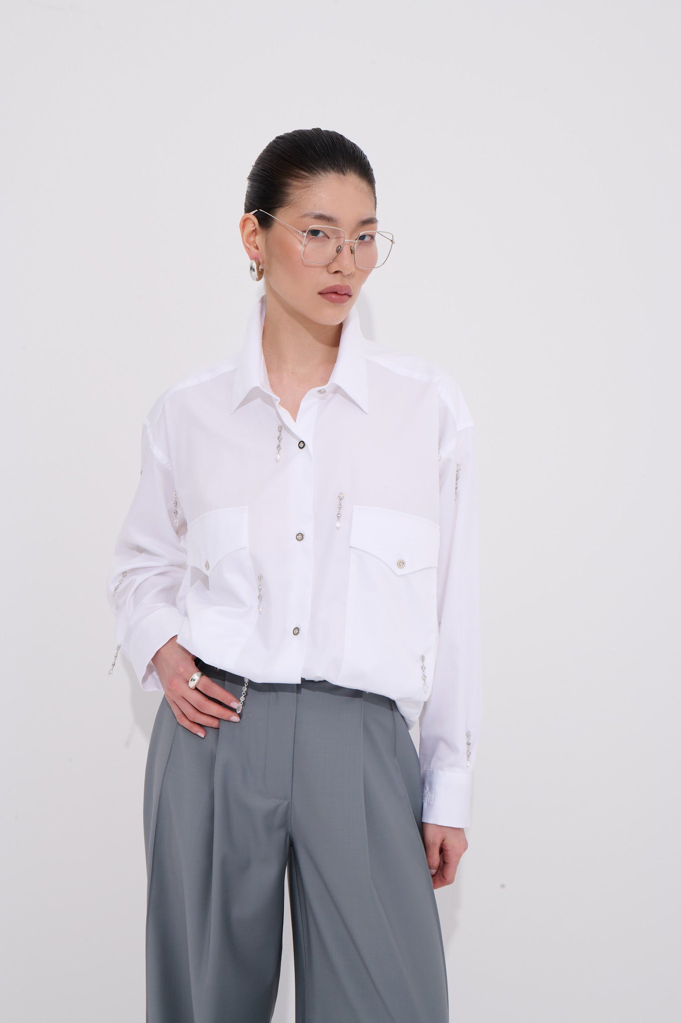 WhatIfBrand için özel olarak tasarlanan bu beyaz gömlek sade şıklığı modern detaylarla yeniden yorumlar.Swarovski taşlı kare düğmeler klasik gömlek formuna zarif ve parlak bir dokunuş katar.Net kesimi geniş cepleri ve feminen çizgileriyle iş hayatından davet stiline kadar çok yönlü bir şıklık sunar. %100 pamuktan üretilen yumuşak dokusu sayesinde gün boyu nefes alabilirlik ve konfor sağlar. Pantolonlarla zamansız eteklerle romantik bir görünüm elde etmek mümkündür
