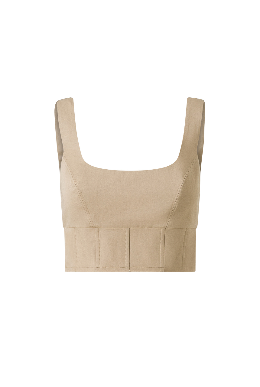 Heykelsi bir siluet sunan bu özel tasarım büstiyer, yapılandırılmış formu ve kusursuz alt kesimiyle zarif bir duruş sergiler. Alt kısımdaki korseli yapı ve iç balen desteği sayesinde vücudu kavrar ve formunu korur. Arka kısmındaki metal fermuar, hem fonksiyonel hem de estetik bir detay sunar. İnce dokulu %100 organik pamuk kumaşı, yaz aylarında hafiflik ve nefes alabilirlik sağlar. Günlük şıklıktan gece davetlerine kadar geniş bir kullanım alanı sunar.