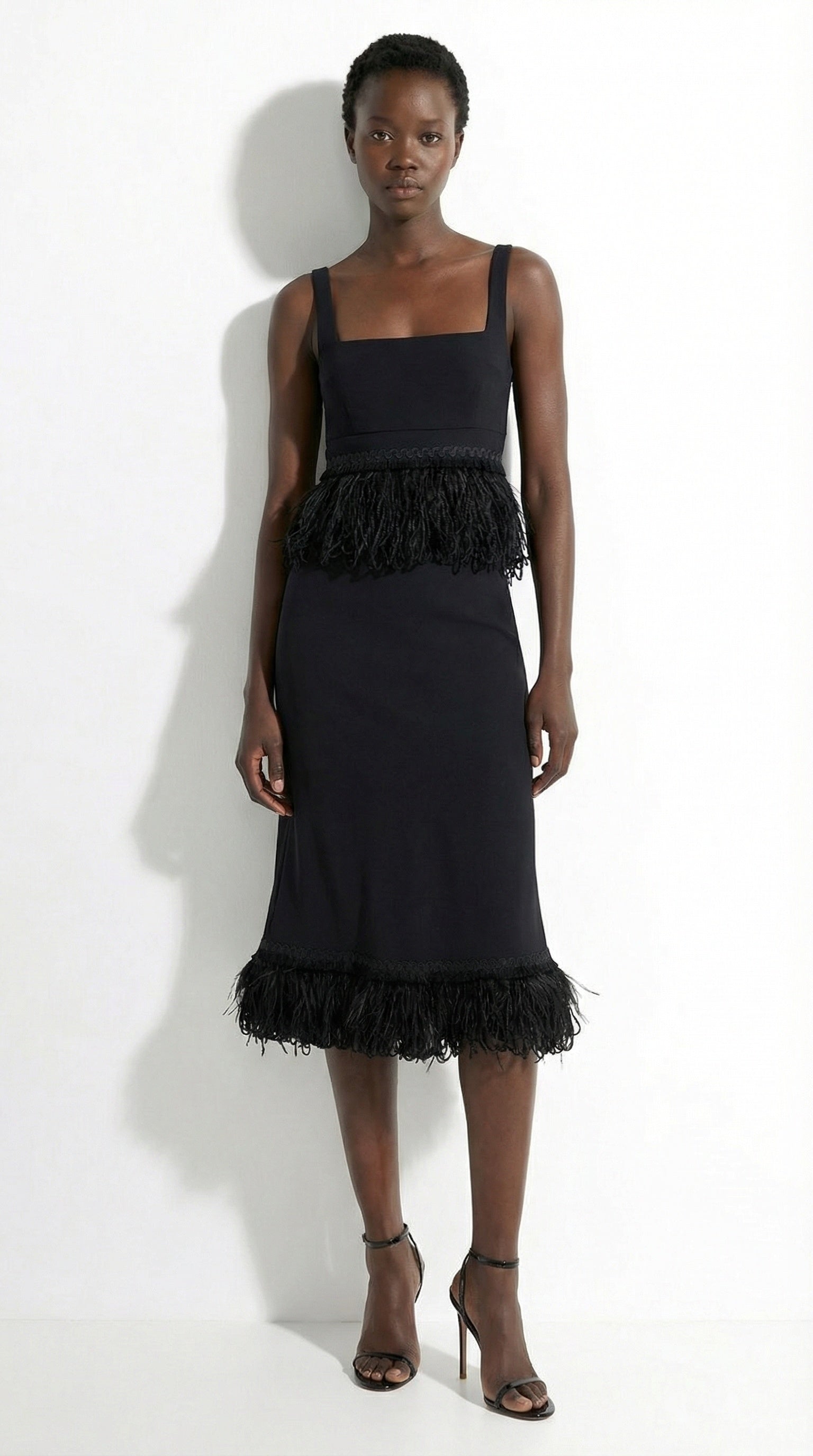 Tüy Detaylı Büstiyer, feminen zarafet ile modern çizgiyi bir araya getiriyor. Kare yaka kesimiyle vücudu zarifçe saran bu tasarım, alt kısmındaki hacimli tüy detaylarıyla dikkat çekici bir siluet oluşturur. Ön kısmında yer alan fermuar ve metal detay, tasarıma modern bir dinamizm kazandırırken akşam davetlerinden özel etkinliklere kadar iddialı bir duruş sunar.