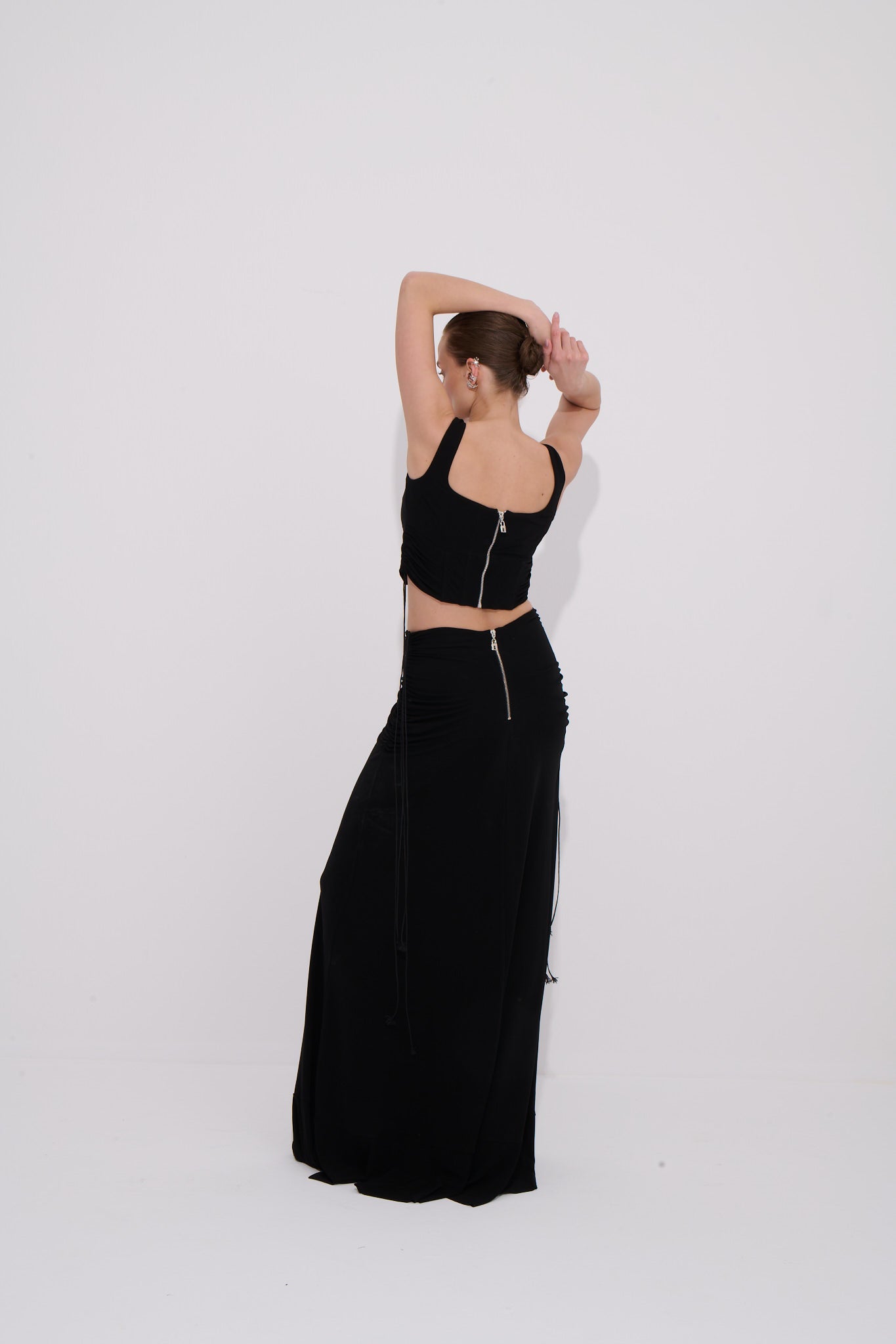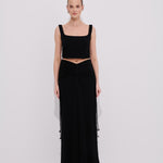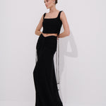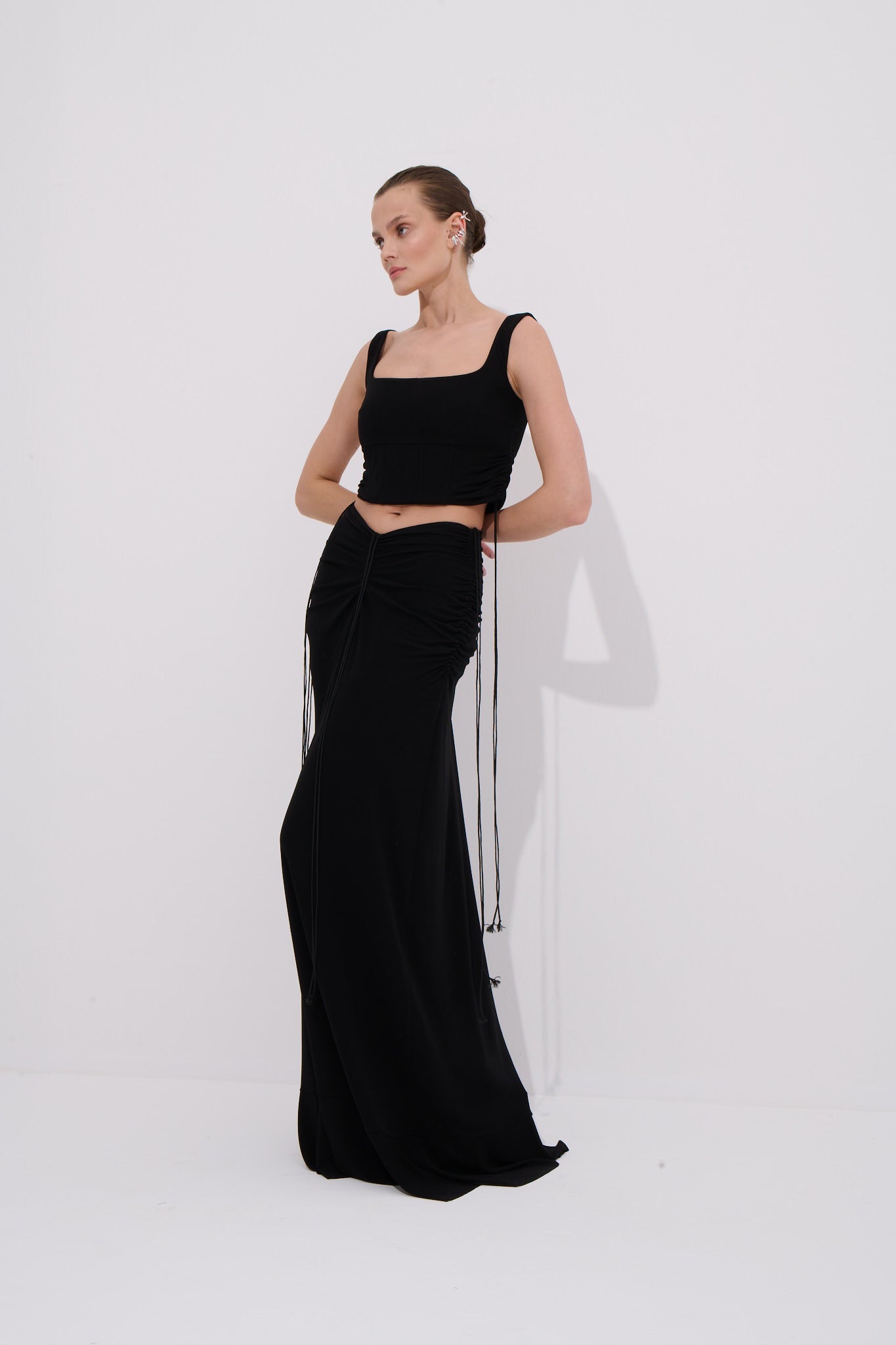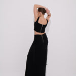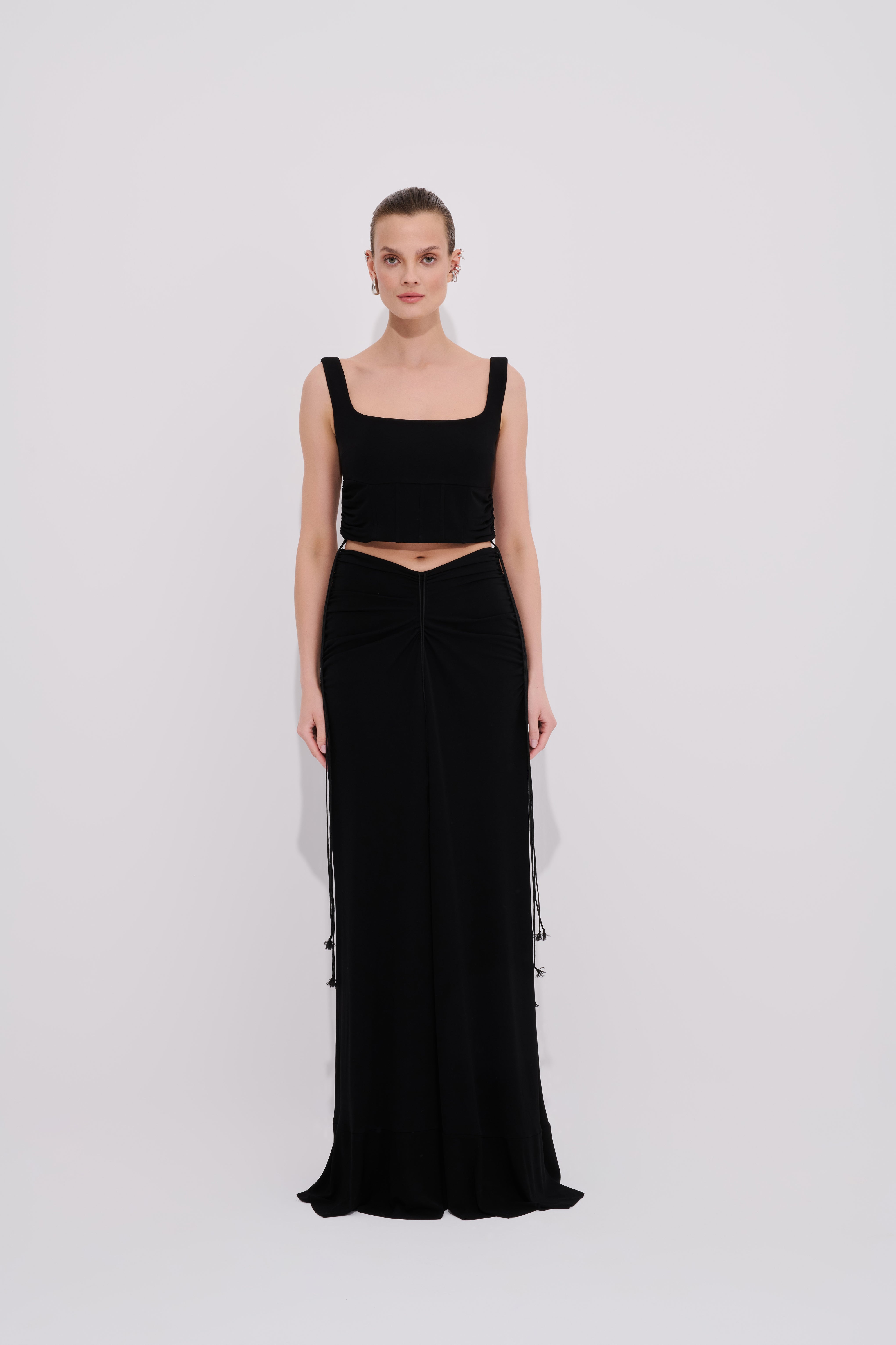 Vücuda zarifçe oturan ve dramatik hatlar sunan bu siyah uzun etek akışkan floş kumaşıyla feminen ve hareketli bir görünüm kazandırır . Yan ön ve arka bölümde yer alan buzgü  detayları eteğe karakter ve derinlik katarken serbest bırakılmış ip ayrıntıları modern bir silüet oluşturur. Yüksek belli yapısı ve arka metal fermuar detayıyla konfor ve şıklığı bir arada sunar