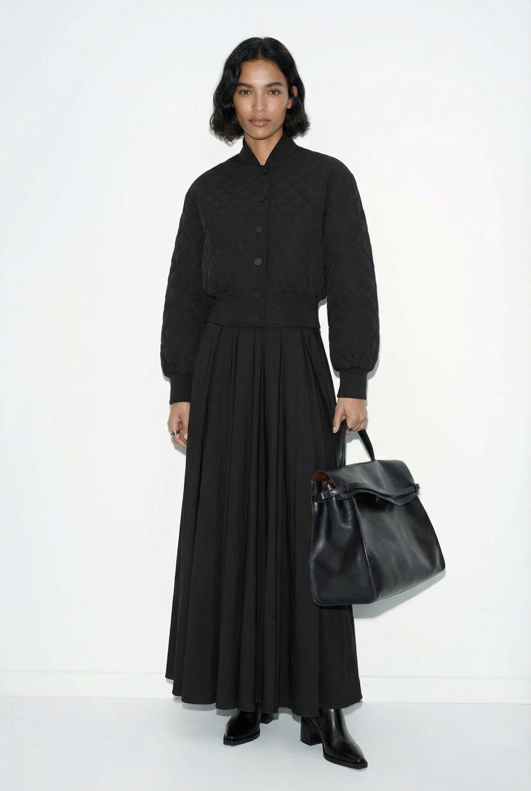 Günlük şıklığa modern ve güçlü bir yorum katan bu kapitone bomber ceket, vatkalı omuzları ve yapısal duruşuyla dinamik bir siluet sunar. Sportif karakteri sofistike bir çizgiyle buluşturan tasarım, ribana manşet, yaka ve etek ucu detaylarıyla konfor ve formu dengeler. Şehir temposuna uyum sağlayan hafif yapısı ve modern kesimiyle sezonun vazgeçilmez parçasıdır. Hem casual hem akşam görünümüne effortless bir güç katar